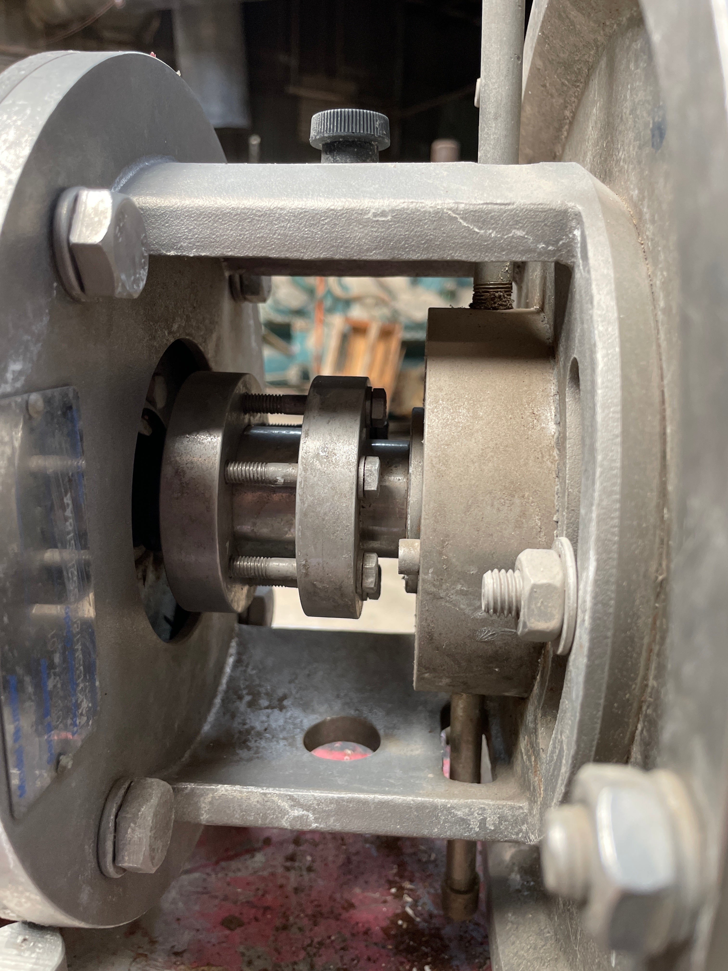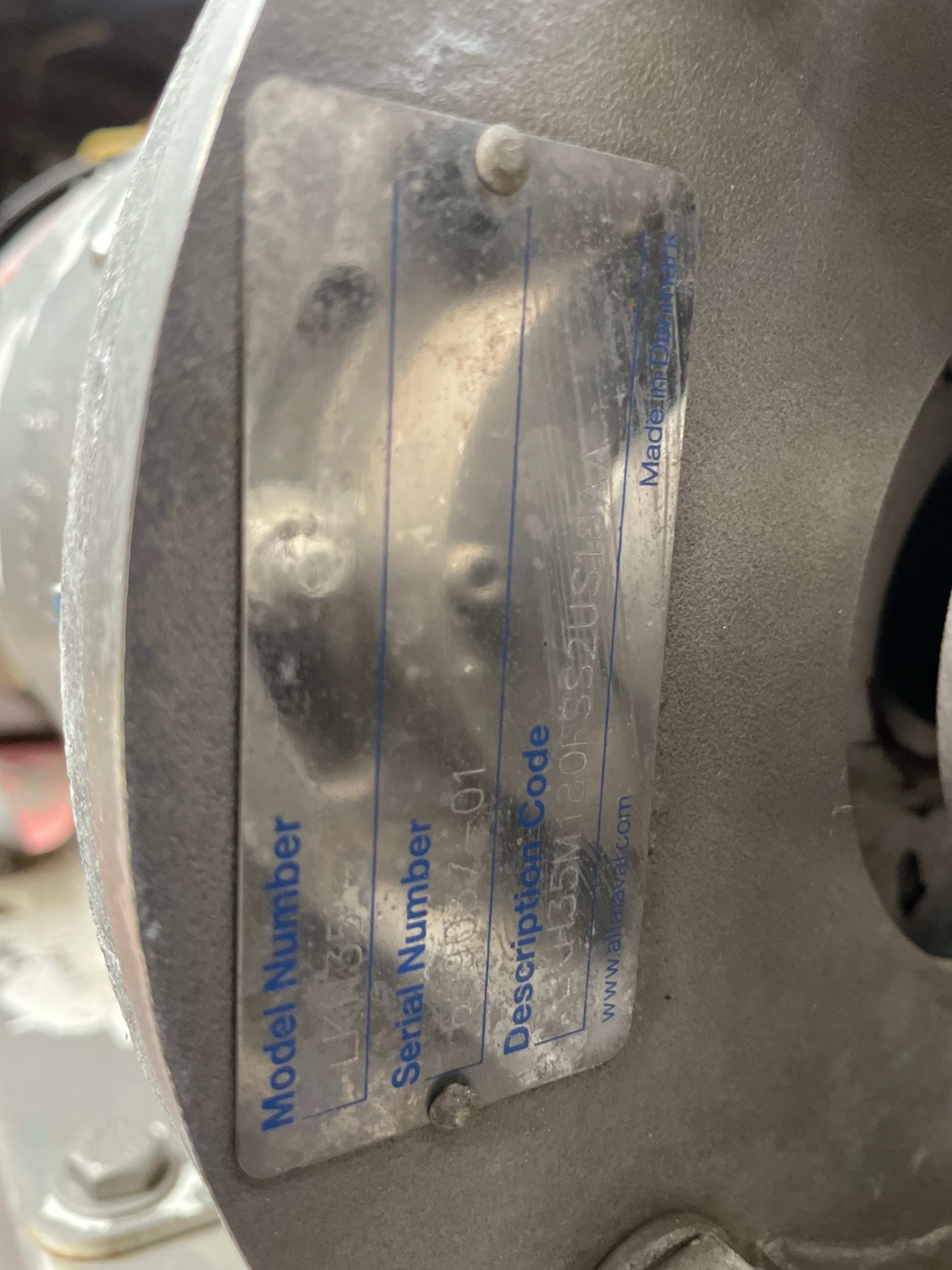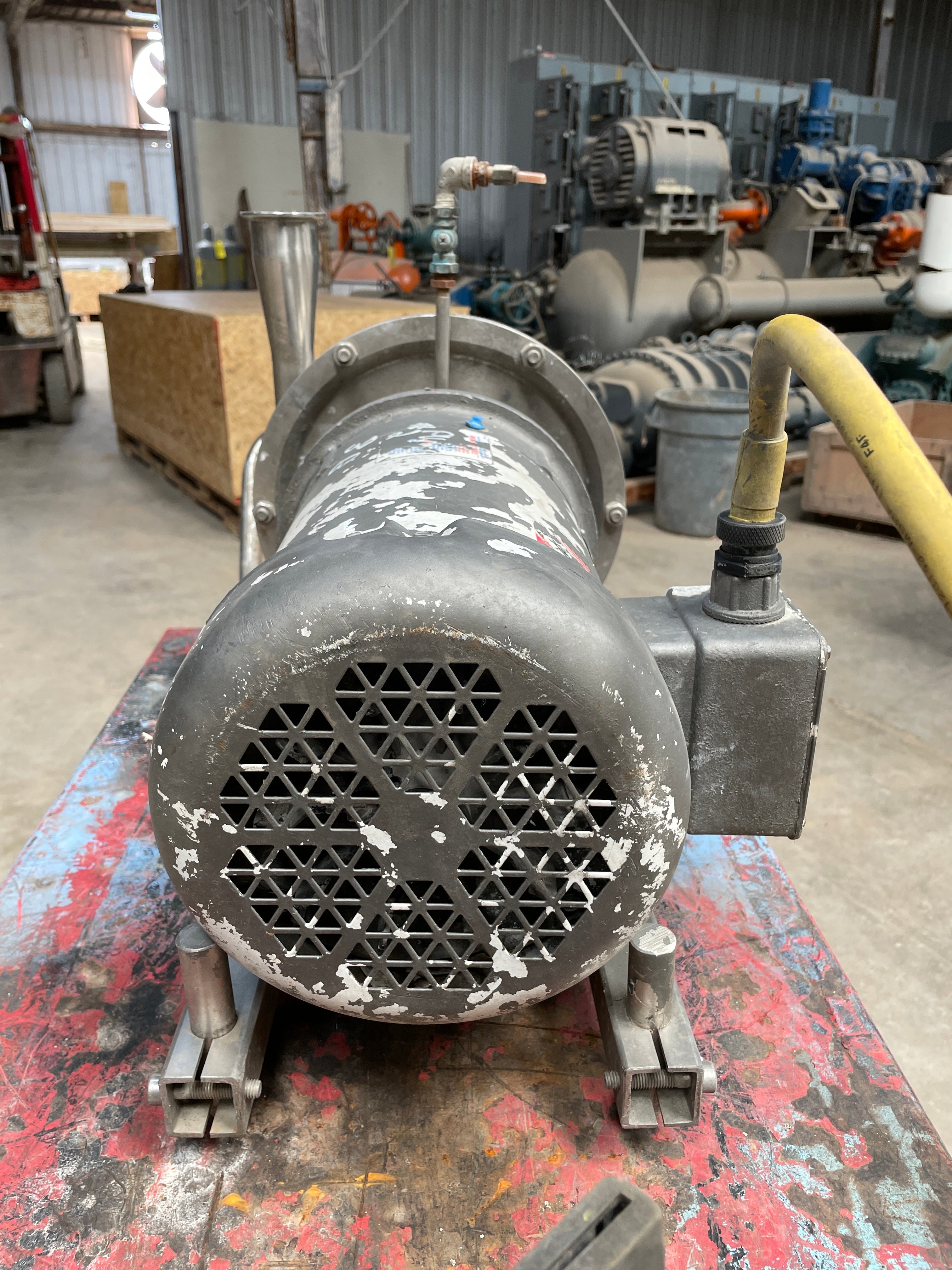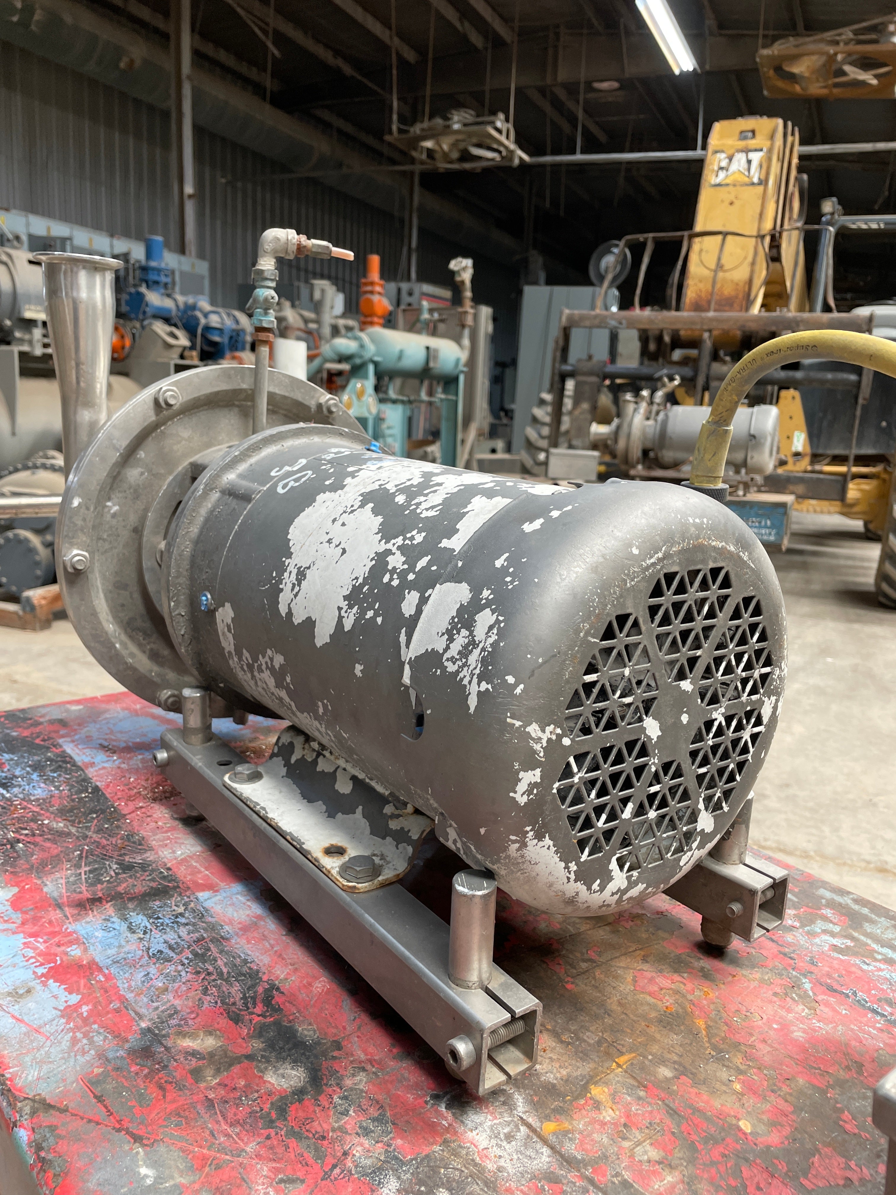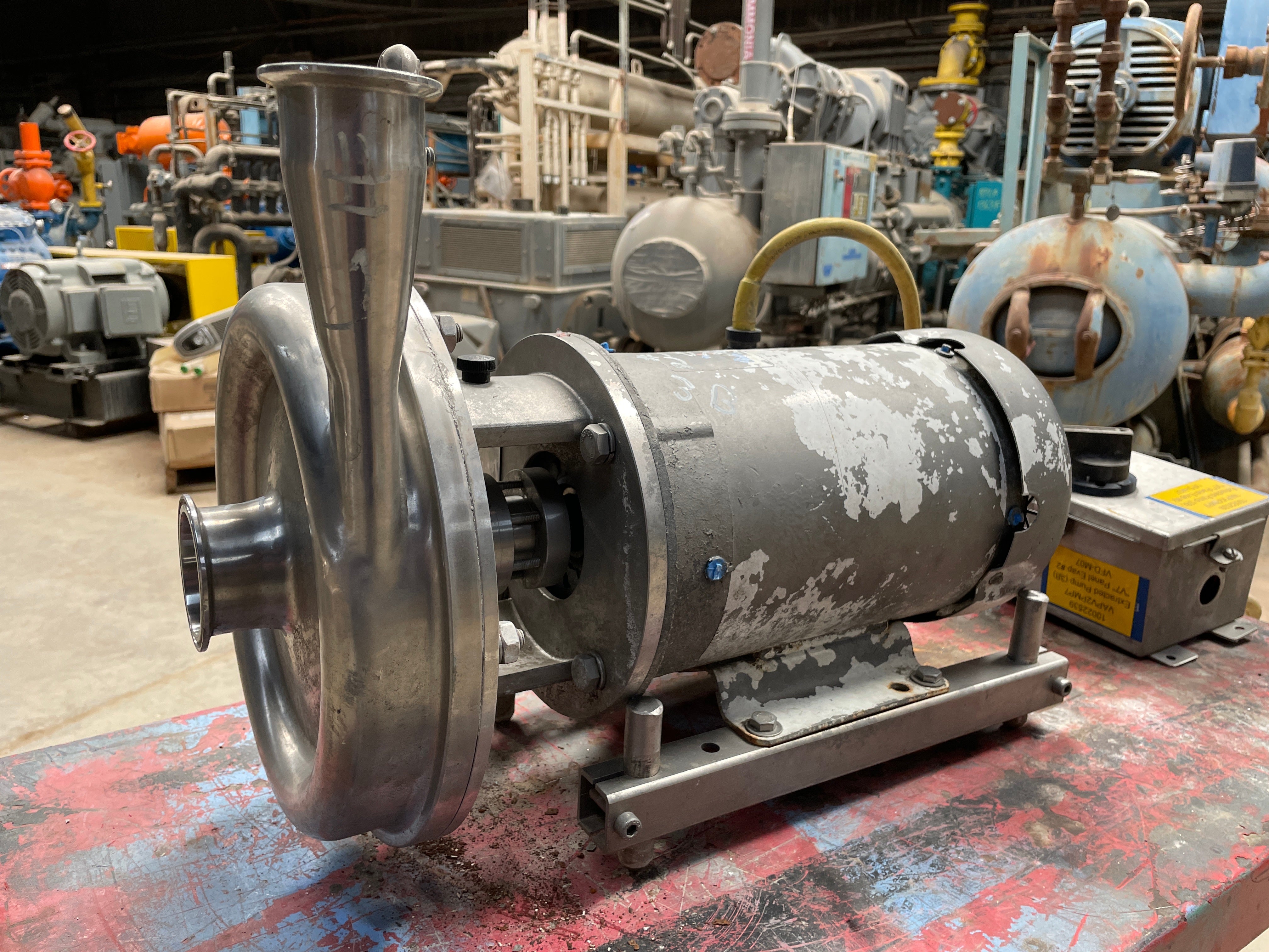 Alfa Laval LKH35 Centrifugal Pump. Model: LKH35, Serial No: 559037-01, Description Code: H35M120FSS2US18AA. Max Inlet Pressure: 145 PSI. Max RPM: 3600. Maximum product viscosity: 800 cP. Baldor Motor: 5 HP, Volts: 208-230/460, AMPS: 13-1.2/6, RPM: 3450, Frame: 184TC, HZ: 60, PH: 3. Inlet(in): 2, Outlet(in): 1. Previous paired with APV Single Effect Falling Film Evaporator.