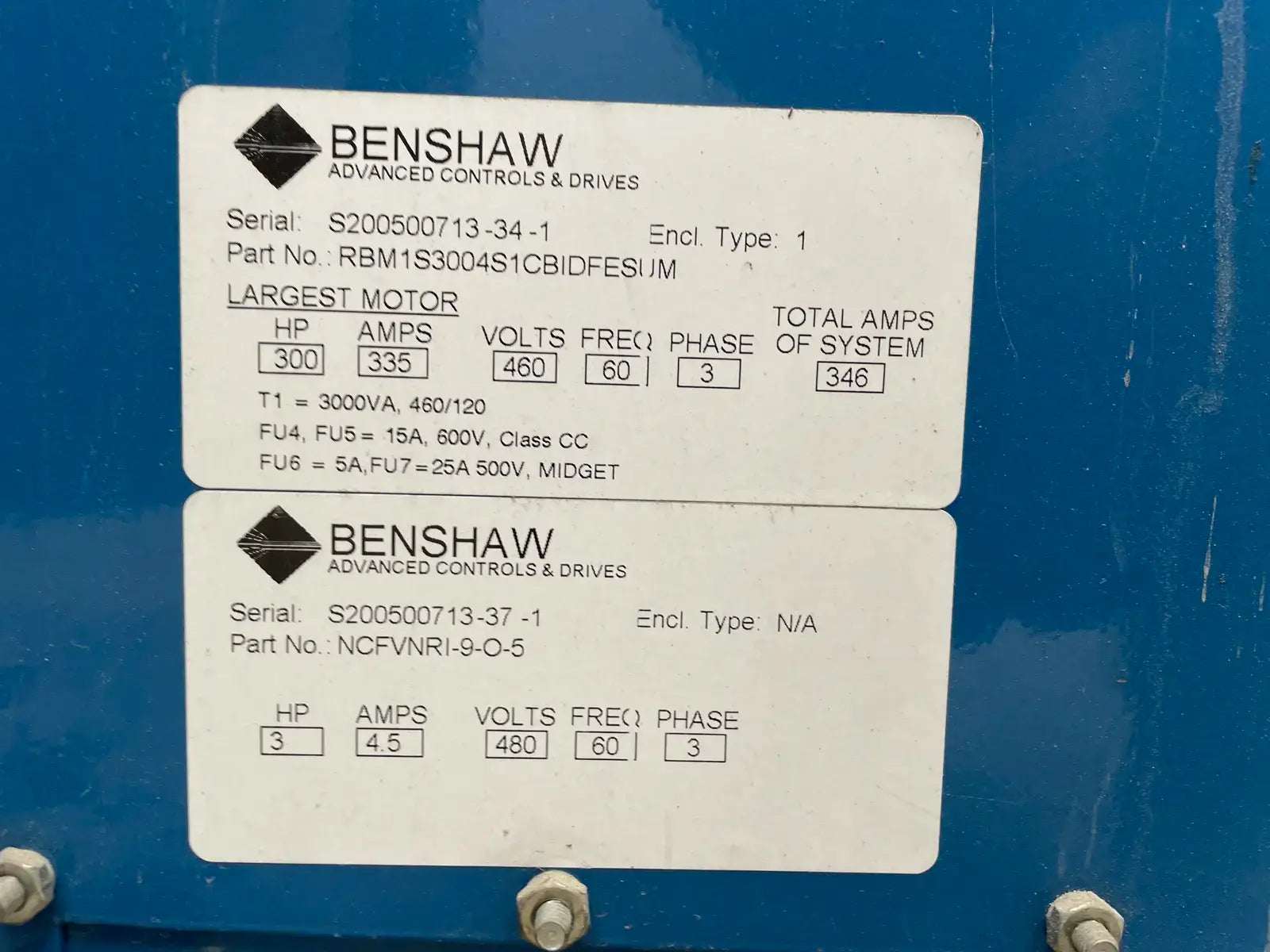 Benshaw Advanced Controls & Drives Motor Starter. Serial No: S200500713-34-1. Part No: RBM1S3004S1CBIDFESUM. Power Supply - Largest Motor: 300 HP, AMPS: 335, Volts: 460, Hz: 60, Ph: 3, Total Amps: 346. Previously used with a GEA Screw Compressor Package.
