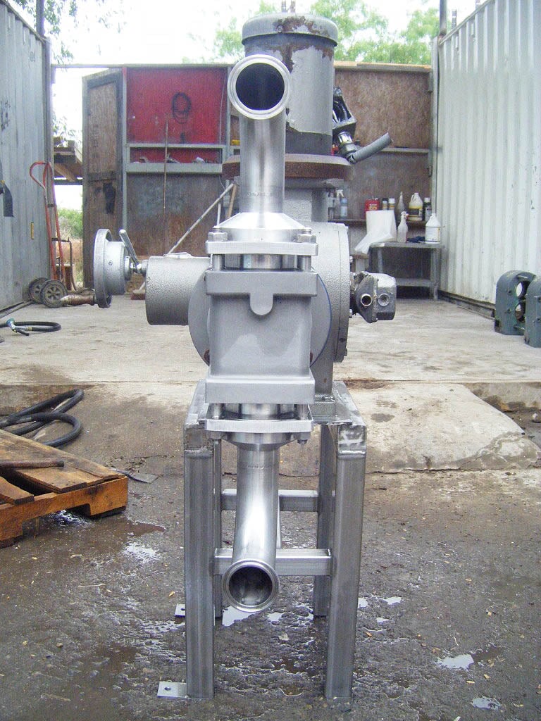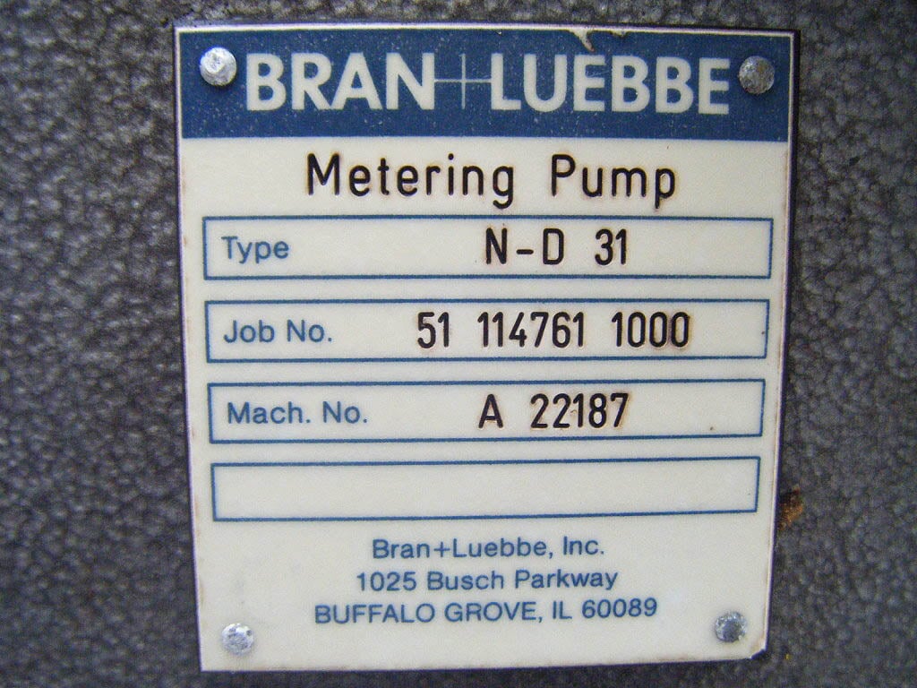 Bran & Luebbe Metering Pump. Type: N-D 31. Job no. 51 114761 1000. Mach no: A 22187. Baldor Electric motor: 1-1/2 hp, 1725 rpm, 208-230/460 V, 5.3-5/2.5 A, 60 hz, 3 phases. (1) 2 in. S-line inlet. (1) 2 in. S-line outlet. Overall dimensions: 3 ft. L x 2 ft. W x 4 ft. 1 in. H.
