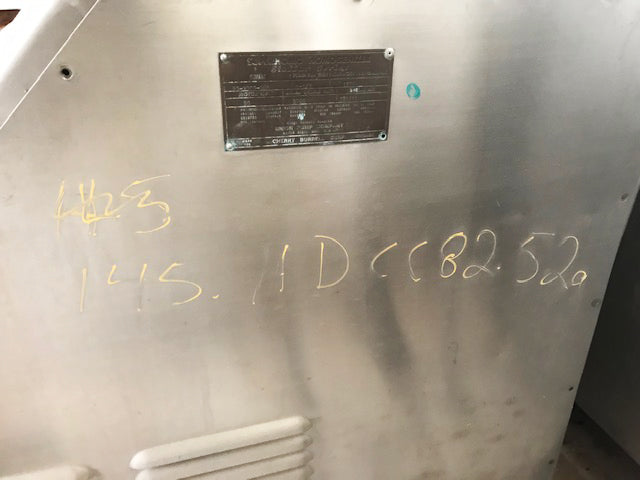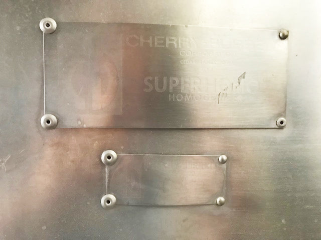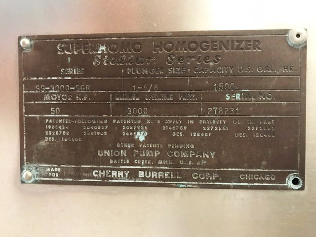 Cherry-Burrell Stellar Series Superhomo Homogenizer. Model: SS-3000-SGR. SN: 278231. Plunger size: 1-5/8 inch. Capacity: 1500 GPH. Block S/N’s: H 144 /4493880 /1926. Single stage valve assembly. Poppet seat valve cylinders. Maximum operating pressure: 3000 psi. U.S. Electric Motor, 50 hp, 1775 rpm, 230/460 V, 118/59 amps, 60 Hz, 3 phase. Inlets: (1) 2-1/2 in. dia. ACME fitting. Outlets: (1) 2 in. dia. ACME fitting (reduces to 3/4 in.). Overall dimensions: 4 ft. 3 in. L x 3 ft. W x 4 ft. 7 in. H.