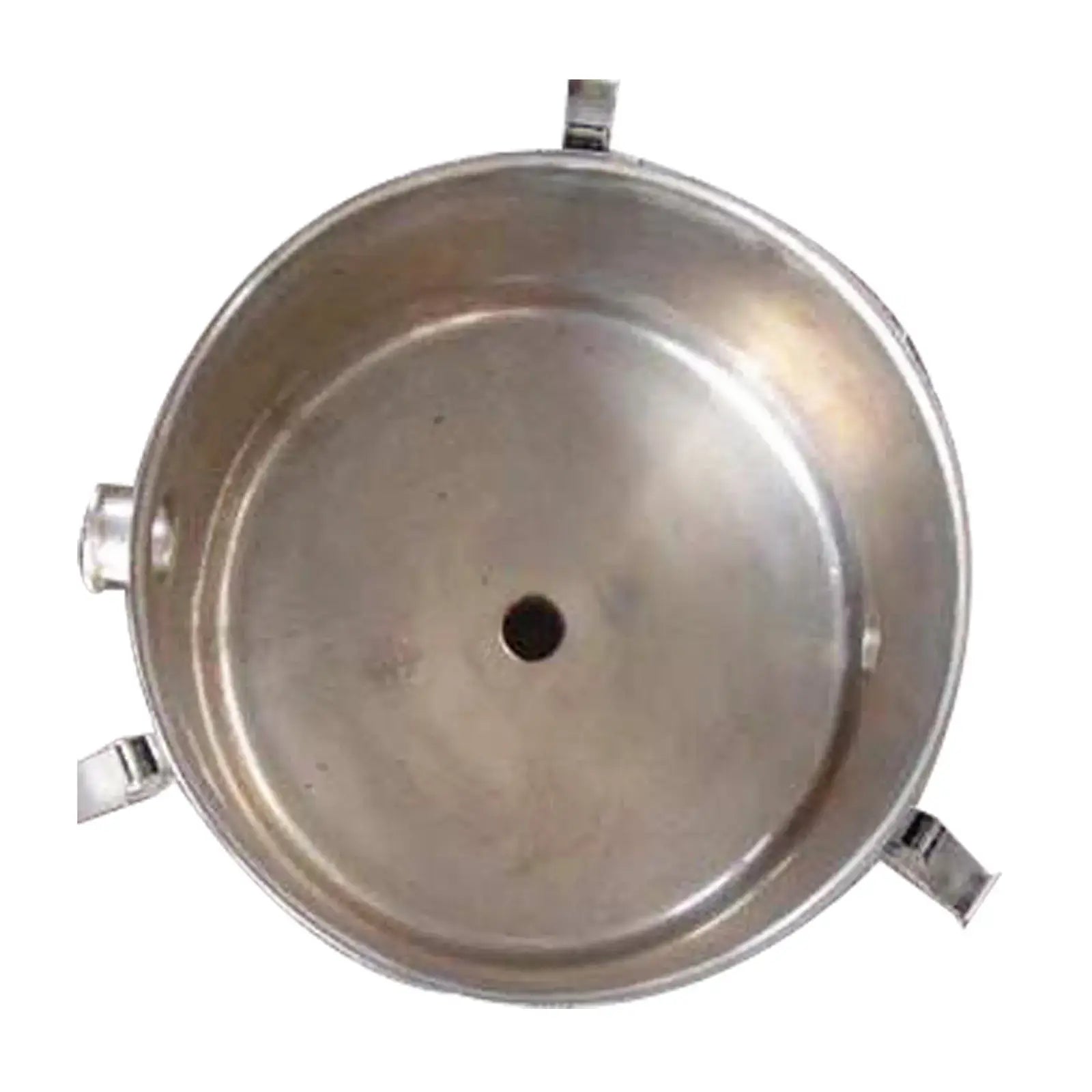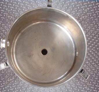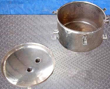 Constant level tank, (2) hooks, one on each side, to hold lid closed. (3) 1-1/2 in. inlets, (2) 1-1/2 in. outlets. Inside dimensions 13-1/2 in. dia. x 8 in. H, Overall dimensions 18 in. L x 15-1/2 in. W x 14-1/2 in. H.