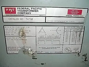 Federal Pacific Transformer 30 KVA. Catalog No: T4T30. Series: 2092. Capacity: 480-280/120 V, 3 phase, 30 KVA rise. Overall dimensions: 22-1/2 in. L x 20 in. W x 34 in. H.