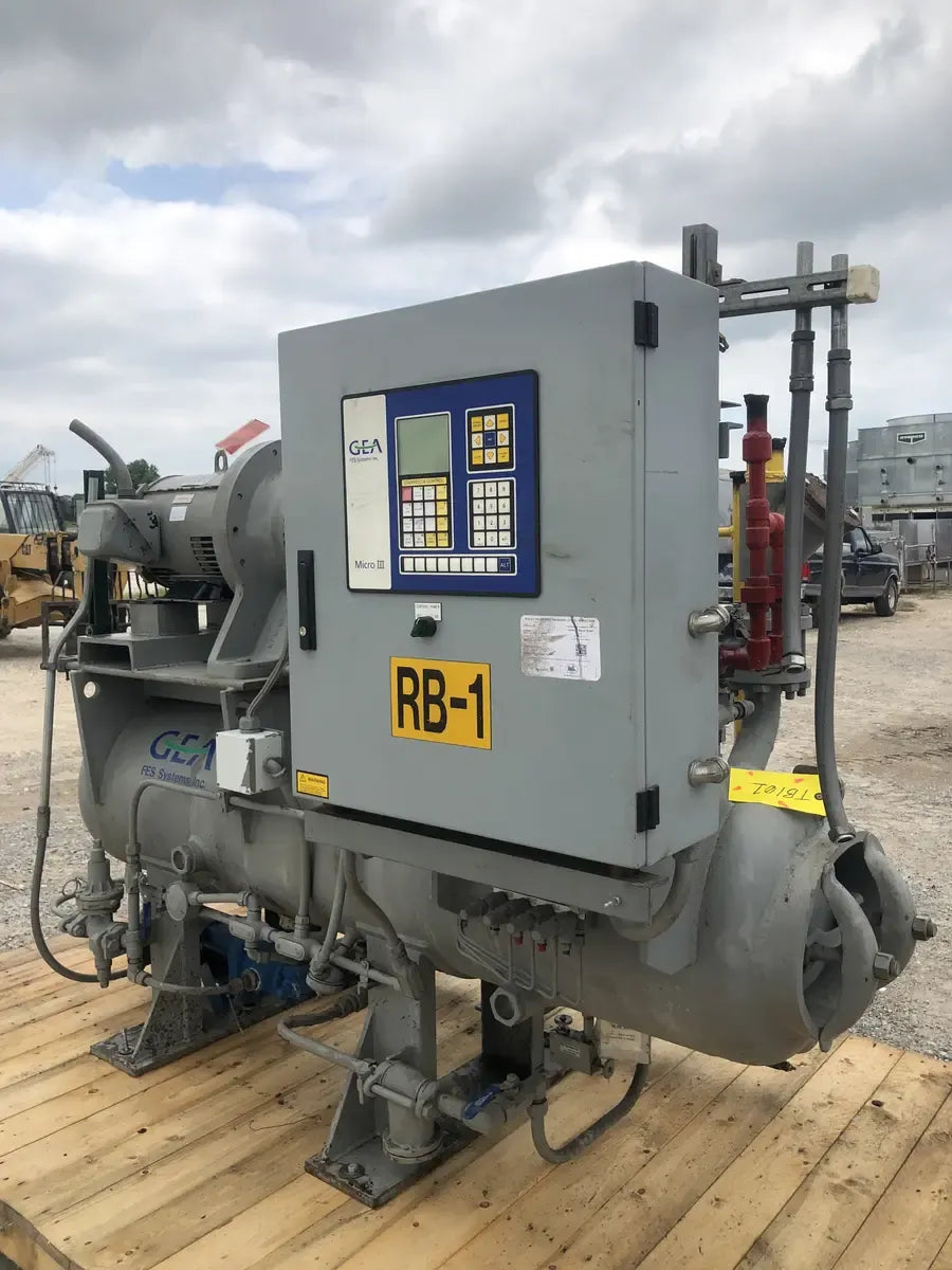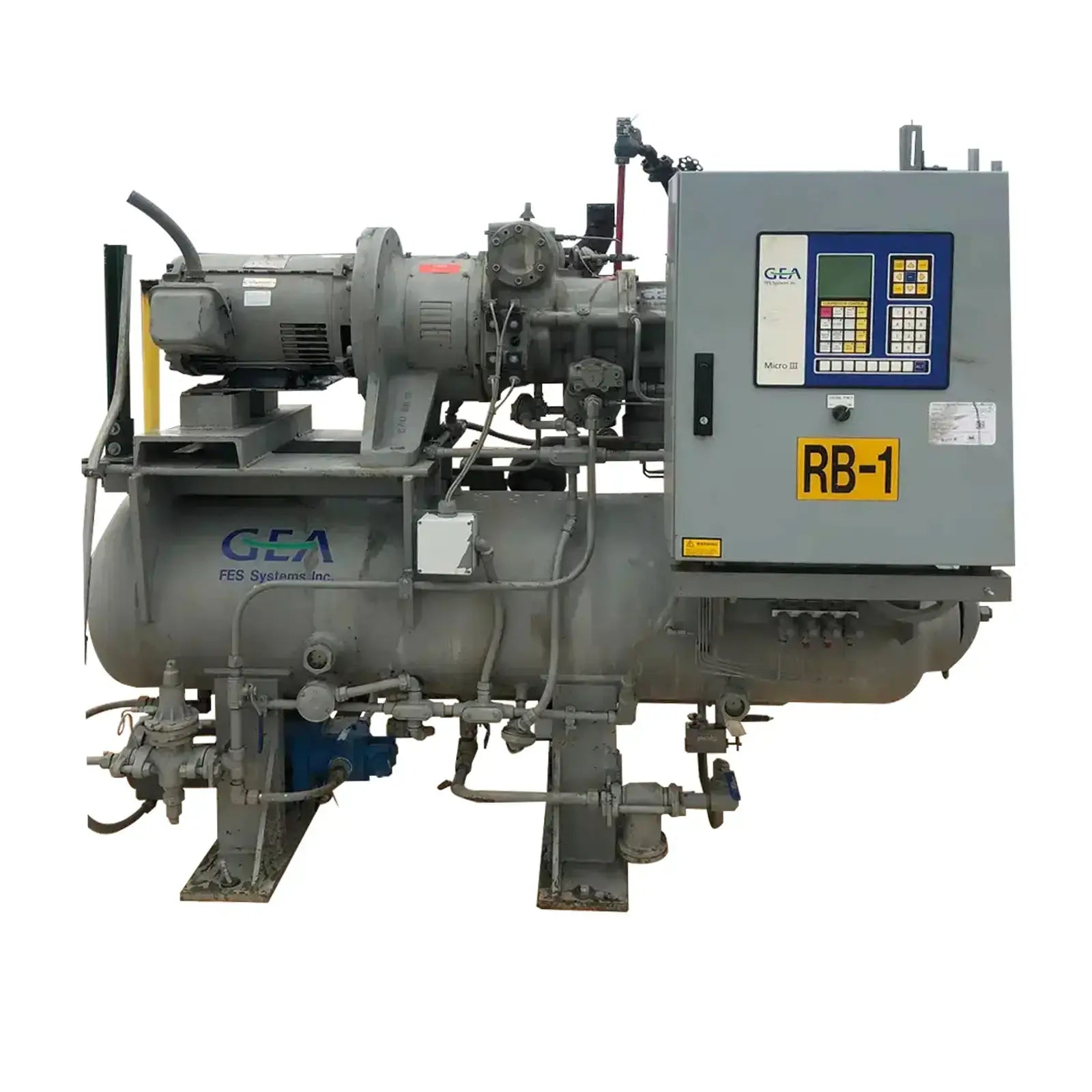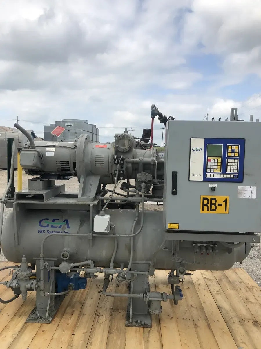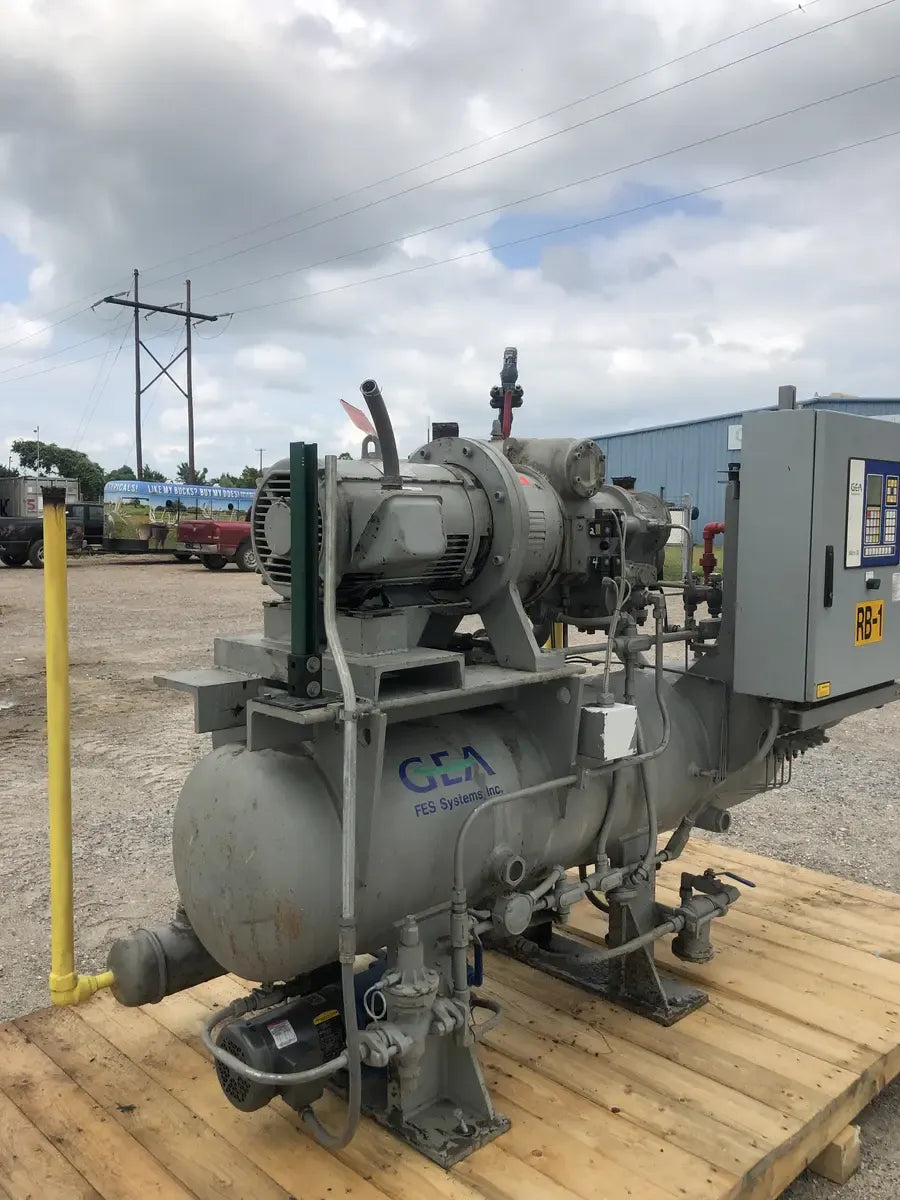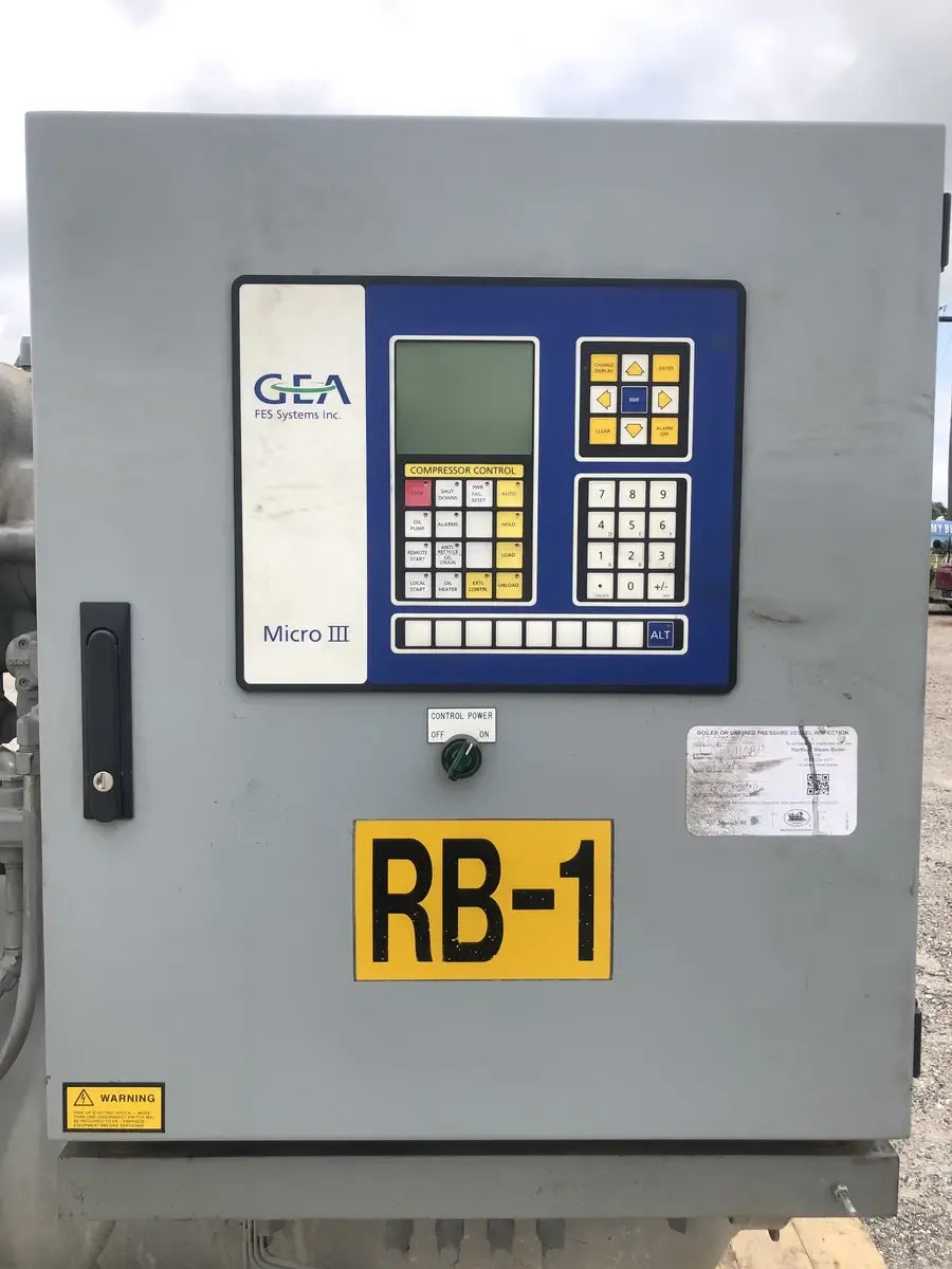 GEA (FES) Screw Compressor Package. Model: G-62, Serial No: G0437, Hydraulic Test Pressure:620 PSIG, Max Design Working Pressure: 406 PSIG, Geometric Swept Volume @ 3550 RPM @ 264 CFM.Weight Empty: 787 lb. Rotation C.W, Max Input Speed 6000 RPM, Refrigerant R-717, P&I DiagRam Industries: SM11.Year Of Mfg: 2004 Emerson Motor - Catalog No: D40E1DSC, Model No: AS50, Shaft End Brg: 6310 2Z JC3, Opp End Brg: 6210 2Z JC3, Fr: 286TSC, Type: FD, Encl: DP, Ph: 3, Max Amb: 40, ID: H0241077102-001R, Insul Class: F, Duty: Cont: WT: 250 Lbs, Hz: 60, HP: 40, RPM: 3550, Volts: 460-230-208. GEA (FES) Control Panel - FES Contract No: 04333011, Model No: 85GSB, Serial No: 04333011, Control Panel FLA 25-120V-1PH- 60Hz.