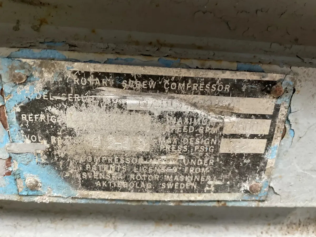Frick Bare Screw Compressor - Model/Serial: GDSH193L00350, Maximum Speed RPM: 4500, Volume Ratio: 2.2-5.0, Max Design Pressure: 362 PSIG. The serial is not visible.