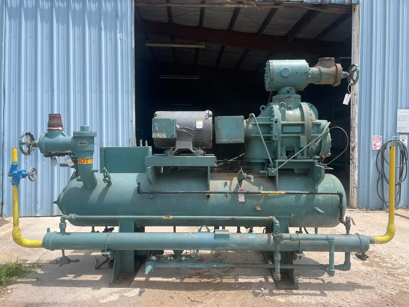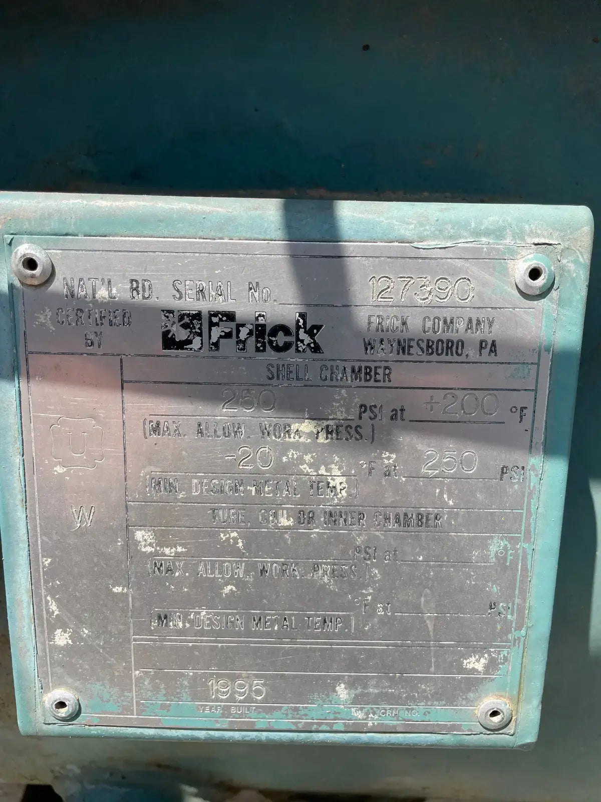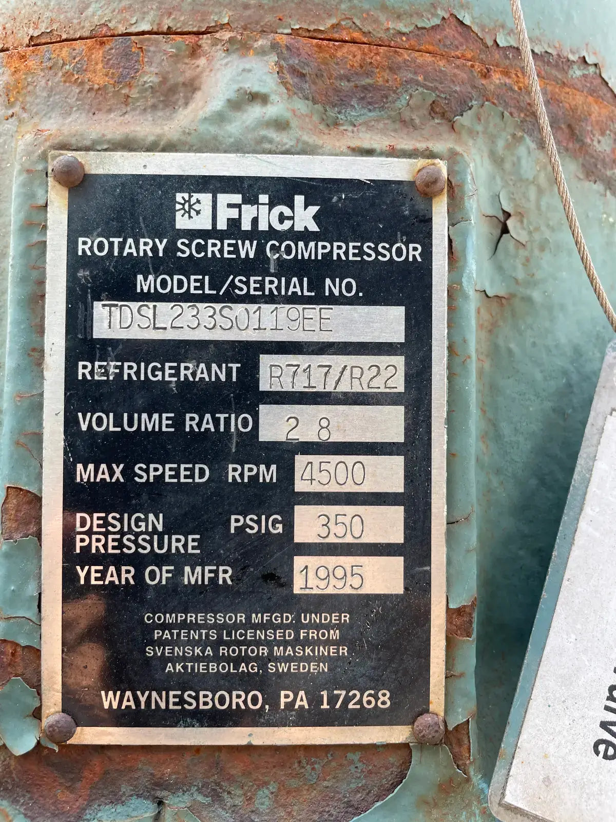 Used Frick RDB-177B Rotary Screw Compressor Package. Model: RDB-177B, Serial No: S0085PFMFTHAA03, Frick Sales Order: 26576502000, Refrigerant: R-717, Max Design Pressure: 250 PSIG. Frick Bare Screw Compressor: Model: TDSL233S. Serial No: 0119EE. Refrigerant: R-717/R22. Volume Ratio: 2.8. Max Speed RPM: 4500. Design Pressure: 350 PSIG. Year Of Mfr: 1995. Certified by Frick Oil Separator: National Board: 127390. MAWP: 250 PSI @ 200 F. MDMT: -20 F @ 250 PSI.
