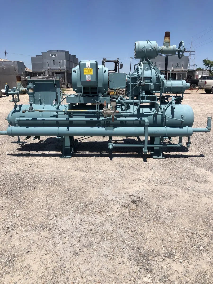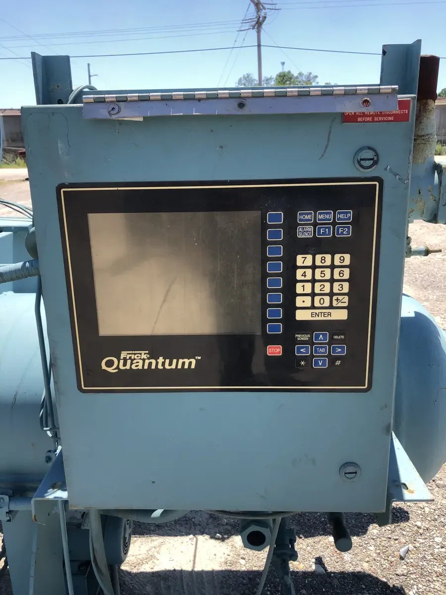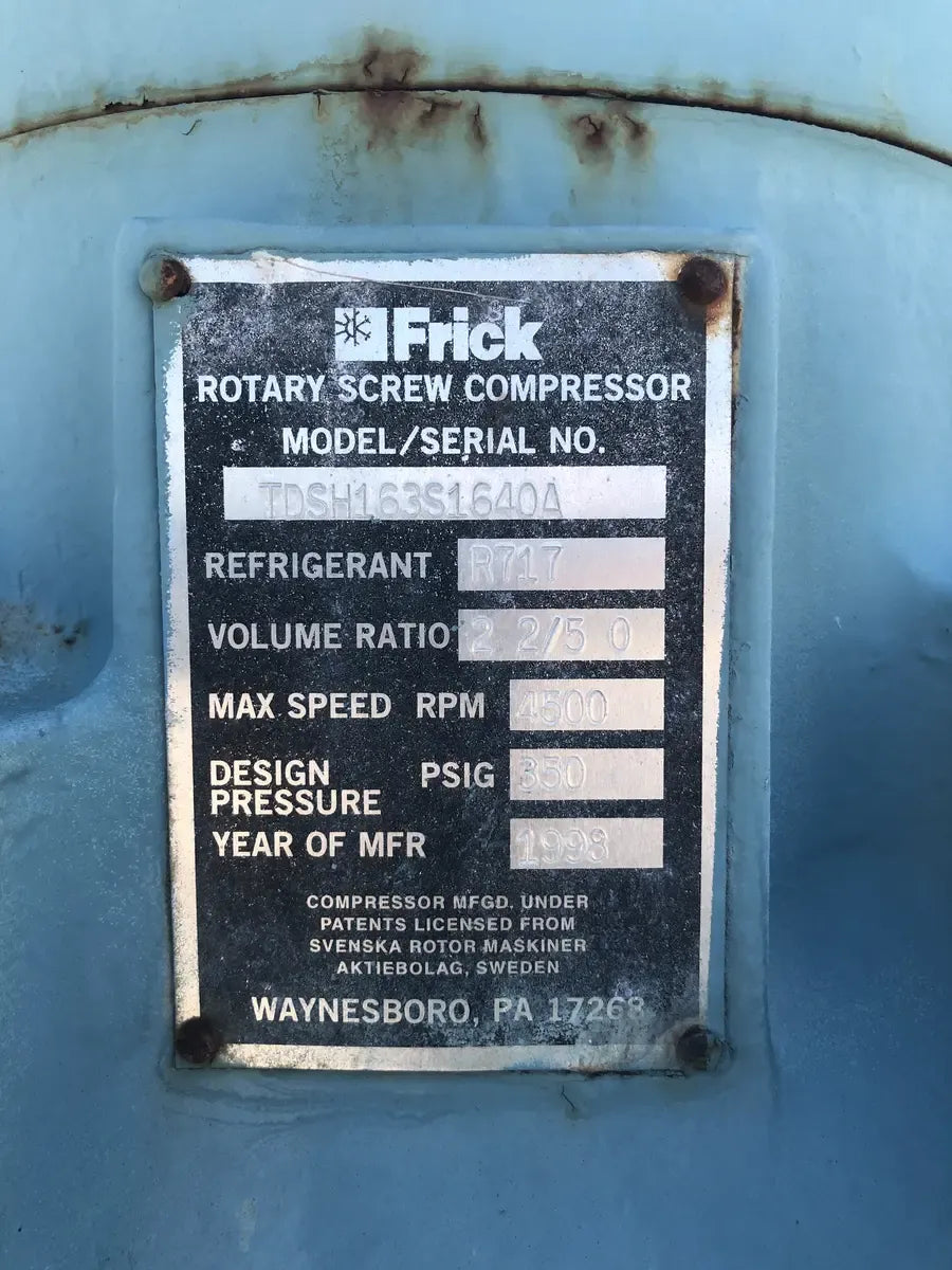Frick Rotary Screw Compressor Package. Model: RWB II 60 E, Serial No: 0448SFMPTHAA03, Frick Sales Order: 2S779801000, Refrigerant: R-717, Max Design Pressure: 300 PSIG. Frick Rotary Screw Bare Compressor - Model/Serial: TDSH163S1640A, Refrigerant: R717, Volume Ratio: 2.2/5.0, Max Speed RPM: 4500, Design Pressure: 350 PSIG, Year of MFR: 1998. Frick Separator - National Board: 136861. Shell Chamber - Max Allow. Work Pressure: 300 PSI @ 200 F, Min Design Metal Temperature: -20 F @ 300 PSI. Year Built: 1997. Frick Quantum Control Panel - Industrial Control Panel Enclosure No: 535438. Volts - Controls: 115AC. Amps - Control: 5, Phase: 1, Hertz:50/60. ID Code: Quantum. Ram Industries High Efficiency Motor - Serial: 7008273-01-AA-R, HP: 150, Frame: 405TS, RPM: 3540, SF: 1.15, Volts: 230/460, Amps: 348/174, PH: 3, HZ: 60, Duty: CONT.