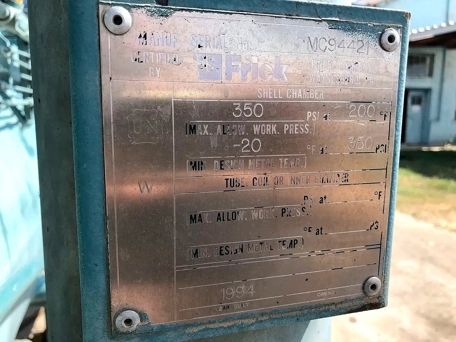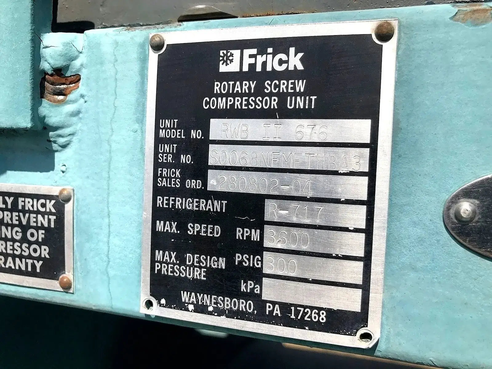 FRICK Screw Compressor Sales Order: 280802-04 Model: RWB-676 Serial # S0068NFMFTHBA3. Screw Model #: TDSH355L0577K. Separator: N/B #117356 Thermo-siphon: N/B #120115. Volume Ratio: 2.2/5.0, TECO MOTOR 500 HP, BHP 449.8, Frame 5808A, TYPE: ASHA-PA001DP, 4160 VOLT 3 PHASE 60 HZ., AMPS: 109 / 60.3, NEMA DESIGN B, BEARINGS: 6314C3/6314C3, RPM: 3570. Hours: 44,227After Seaboard Foods built their new engine room, we purchased their entire original engine room in Oklahoma, USA. Includes an updated HD Micro Panel.
