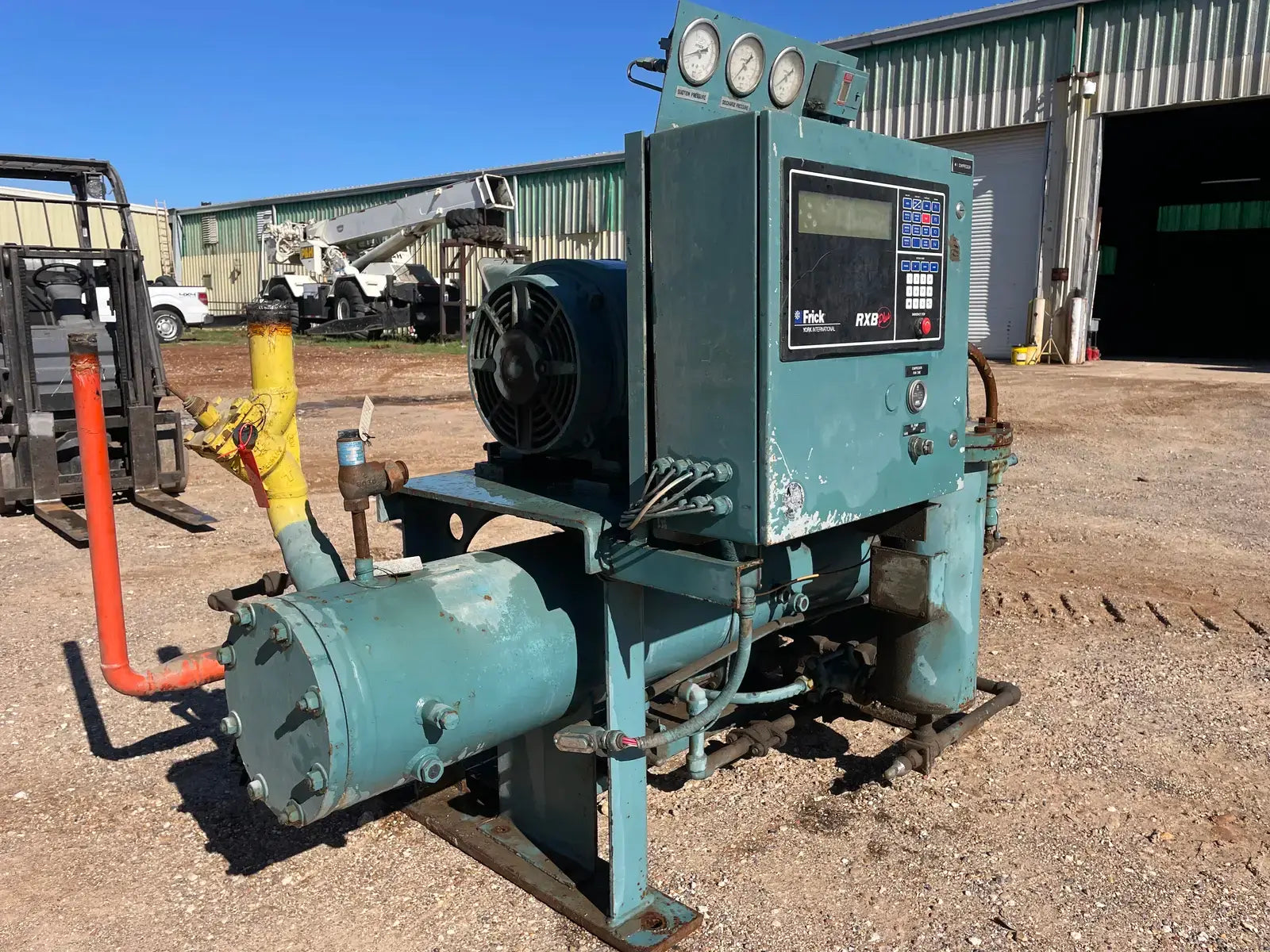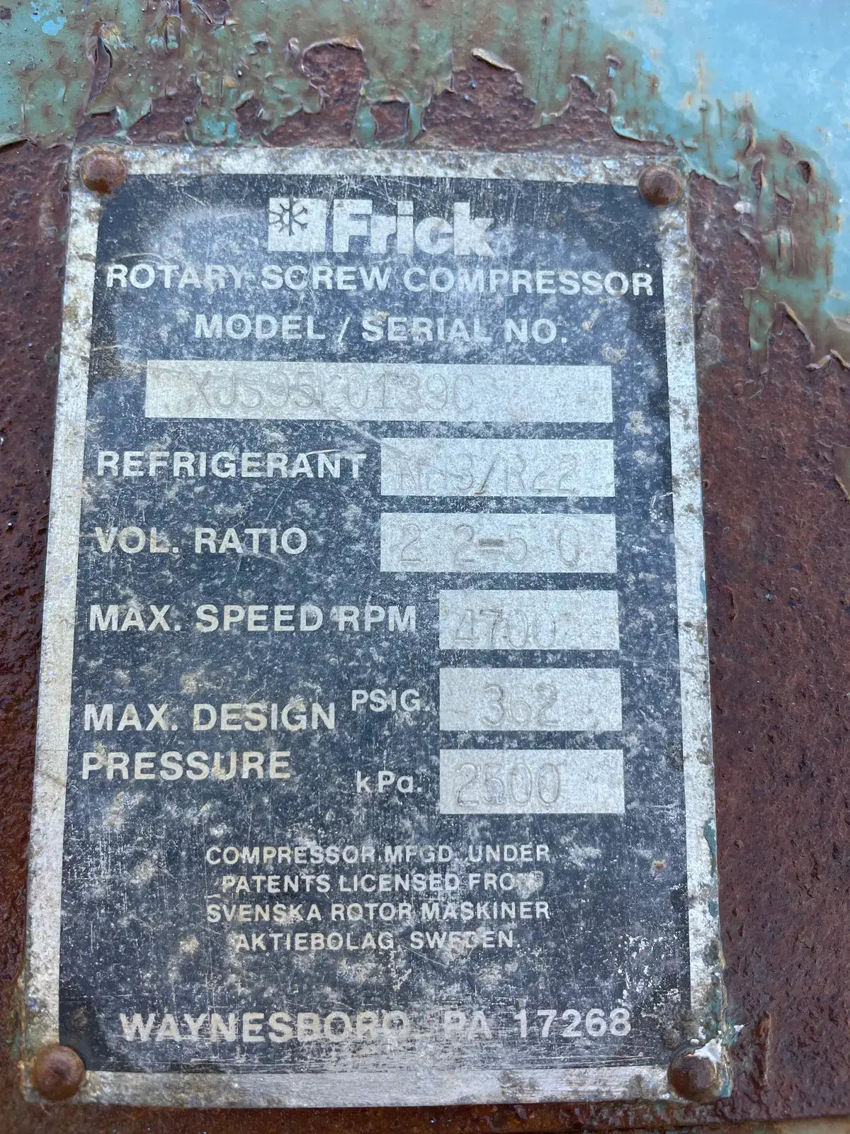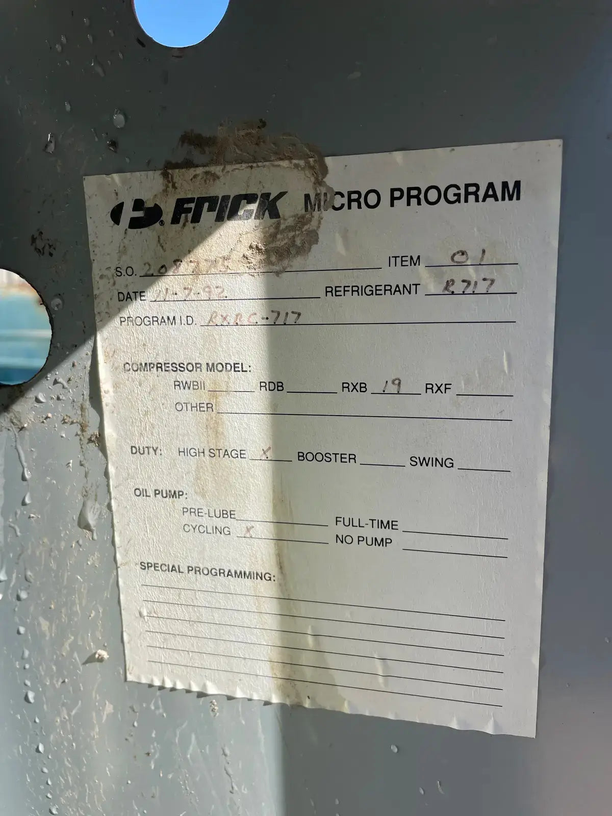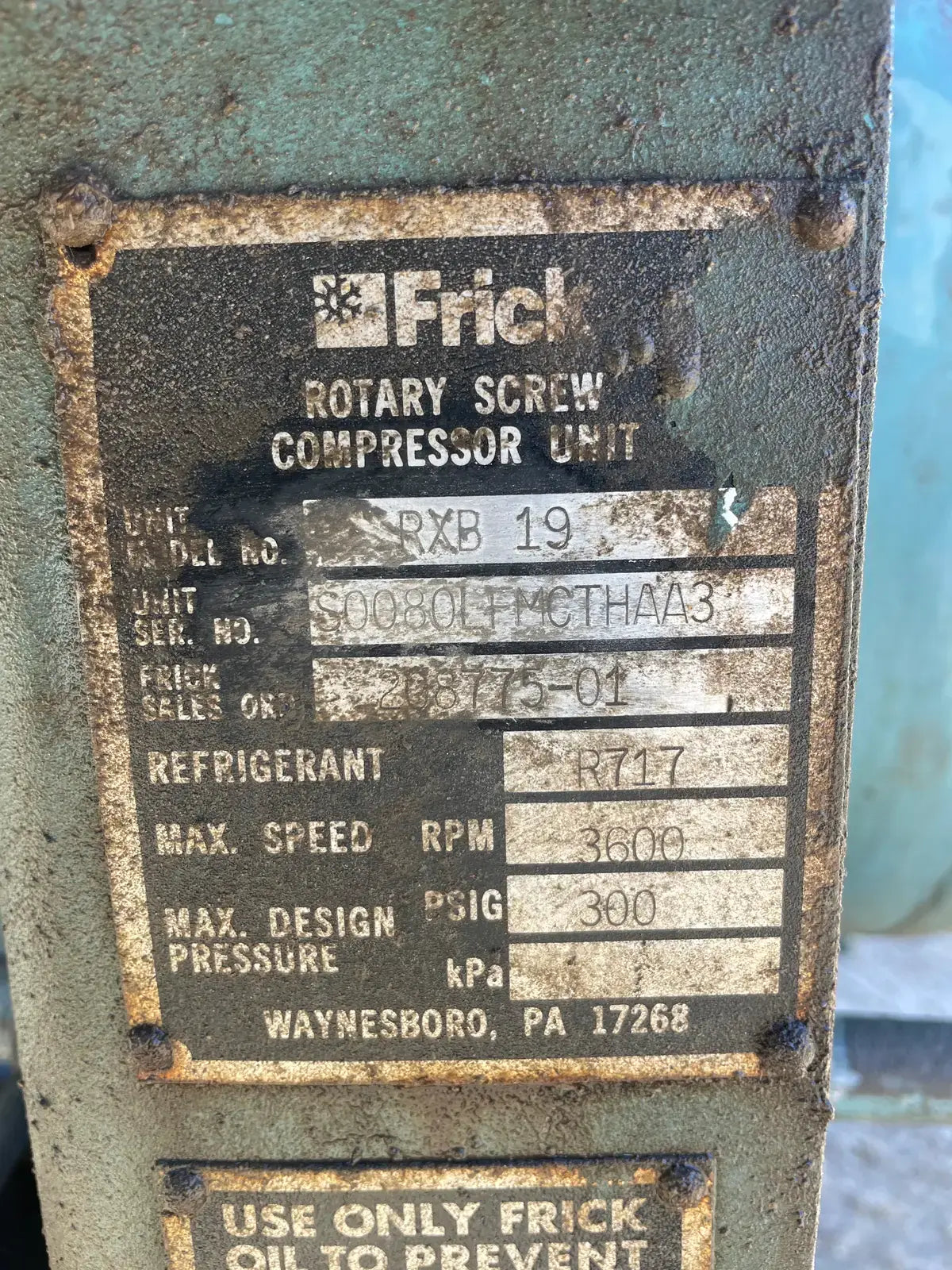 Frick RXB Rotary Screw Compressor Package. Package Model: RXB-19. Unit Serial No: S0080LFMCTHAA3. Frick Sales Order: 208775-01. Refrigerant: R717. Max Speed: 3600 RPM. Max Design Pressure: 300 PSIG. Bare Rotary Bare Screw Compressor: Model: XJS95L. Serial No: 0139C. Refrigerant: NH3/R22. Volume Ratio: 2.2-5.0. Max Speed: 4700 RPM. Max Design Pressure: 362 PSIG. Frick RXB Plus Control Panel.