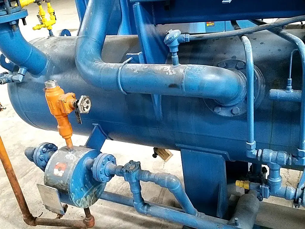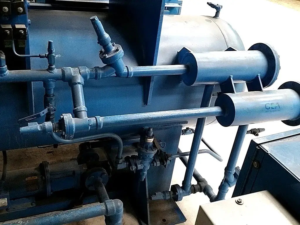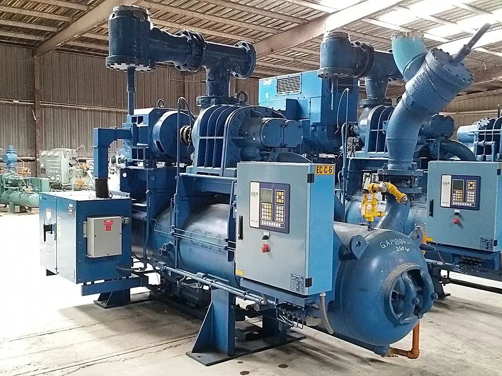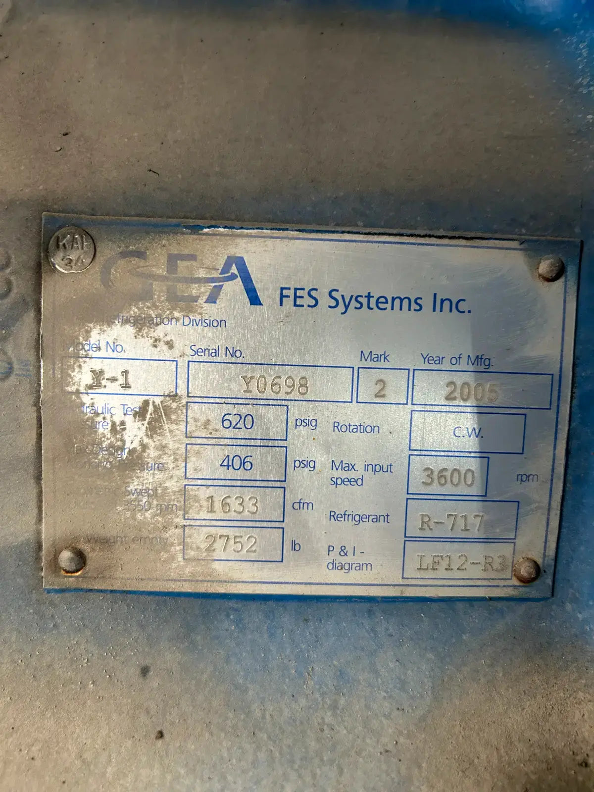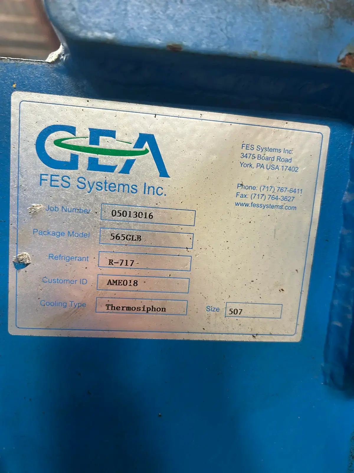 GEA / FES Rotary Screw Compressor Package. Model 565GL. Year: 2005. Item EC-C-6. FES Contract 05013016. Design suction: 1.3 in. / -25FF. Nominal capacity: 242.3 TR. Design Discharge: 33.5 PSIG / +20F. Brake HP: 201.5. Includes GEA micro. Refrigerant: ammonia. Removed from operation in January/February 2014. The unit has been stored indoors. The package is equipped with: Grasso brand compressor, Thermosyphon Oil Coolers, Shell and Plate style, Oversized Oil Separators, Dual Oil Filters, Motor Temperature and Vibration Sensors, Benshaw motor starter, Ram Industries motor. Compressor specs: model Y-1, serial Y0698, mark 2, year 2005, 406 PSIG MDWP, 1633 CFM, R-717. Motor specs: 250 HP, 460V, 279 FLA, 3565 RPM, 3-phase, 60 Hz, 445TS Frame. Hours runtime: 21,943. Weight: 15,150 lbs. Overall dimensions: 75 in. W x 168 in. L x 115 in. H.