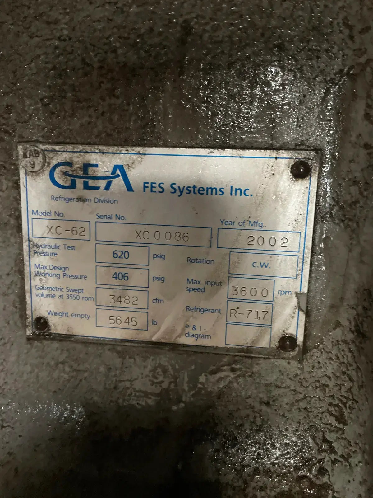 GEA Rotary Bare Screw Compressor. Model: XC-62, Serial No: XC0086. Year of Mfg: 2002. Hydraulic Test Pressure: 620 PSIG. Max Design Pressure: 406 PSIG. Geometric Swept Volume @ 3350 RPM: 3482 CFM. Max Input Speed: 3600 RPM. Refrigerant: R-717.