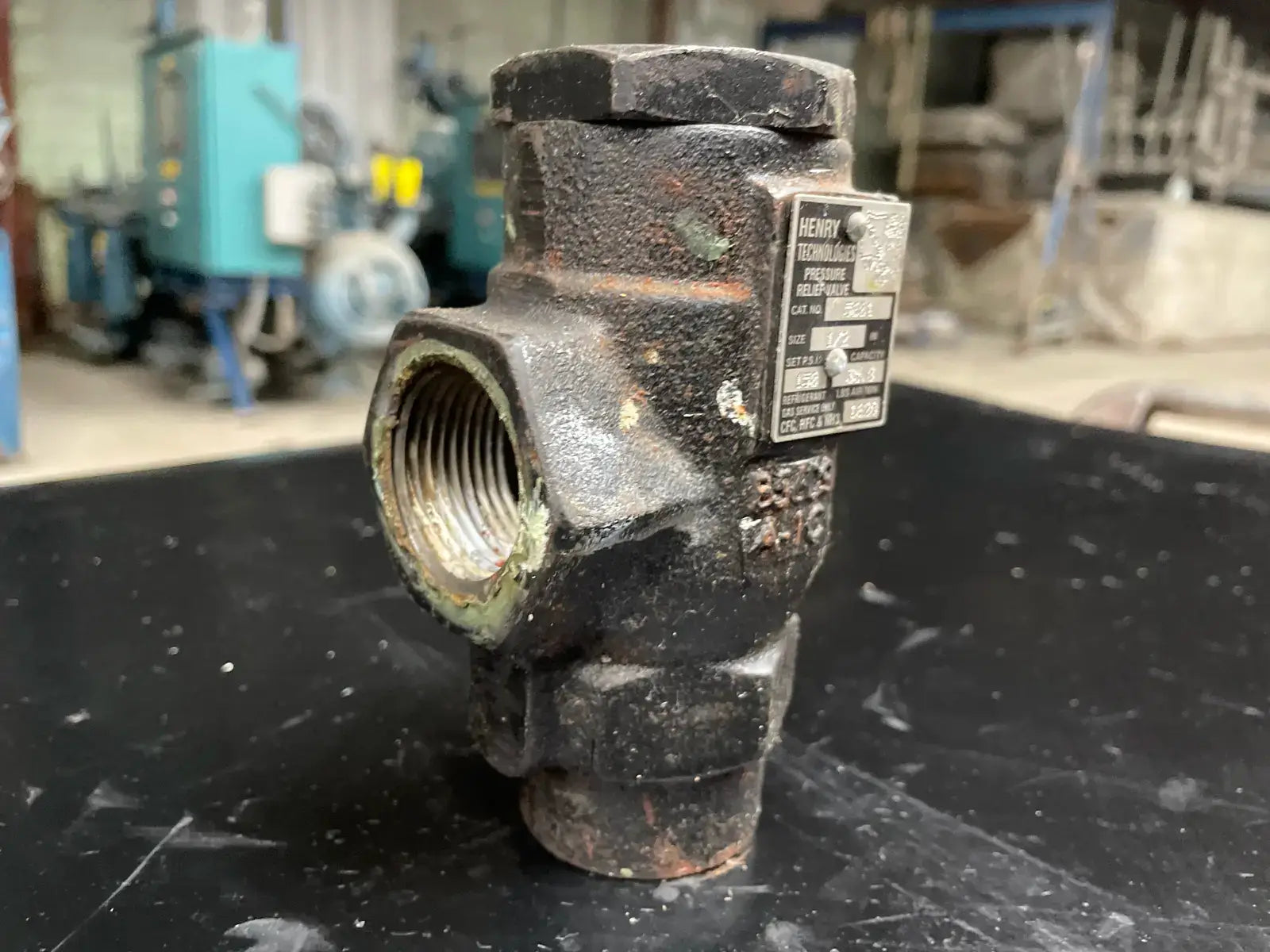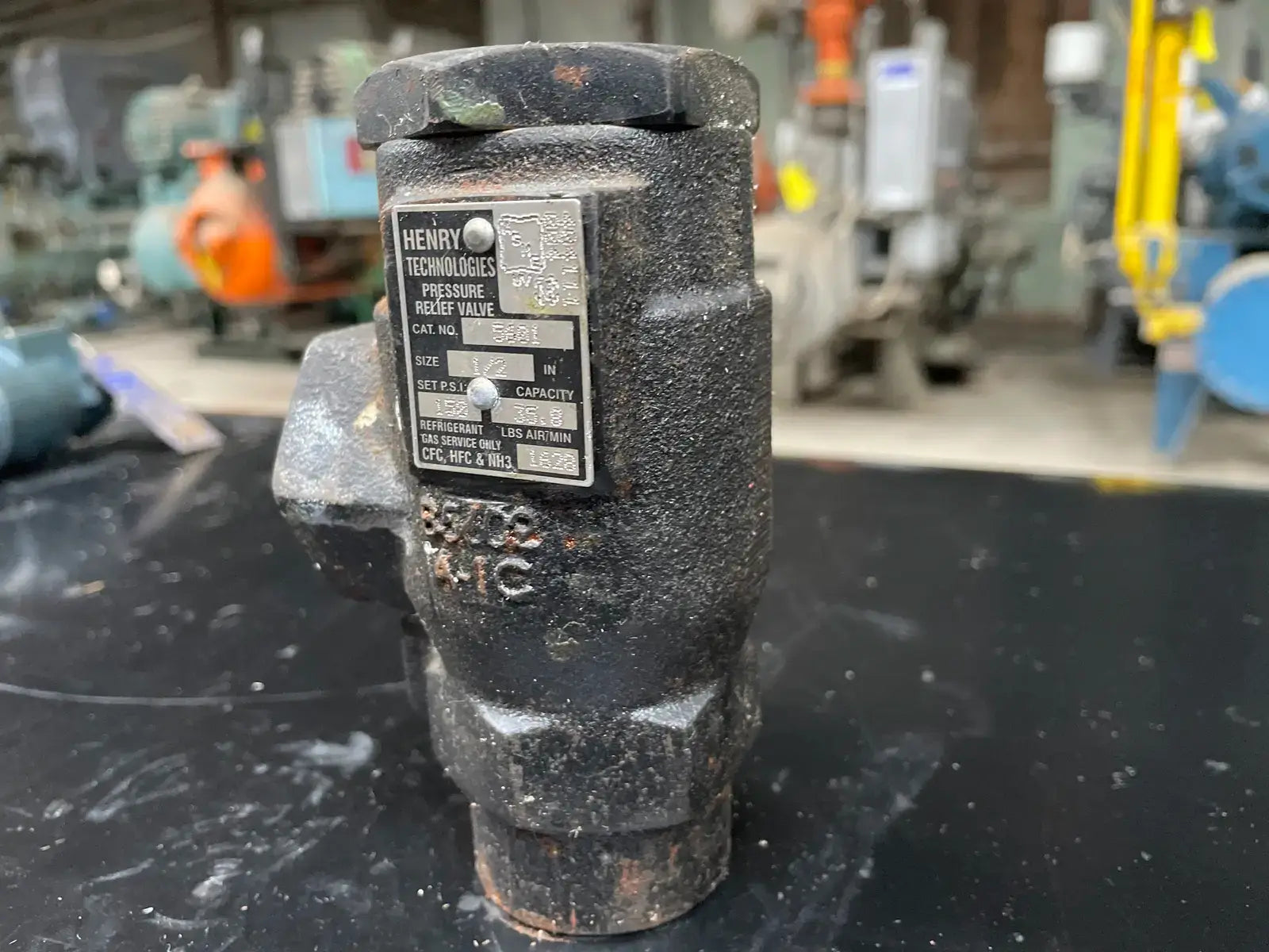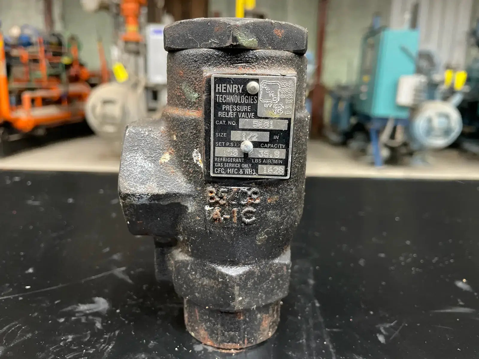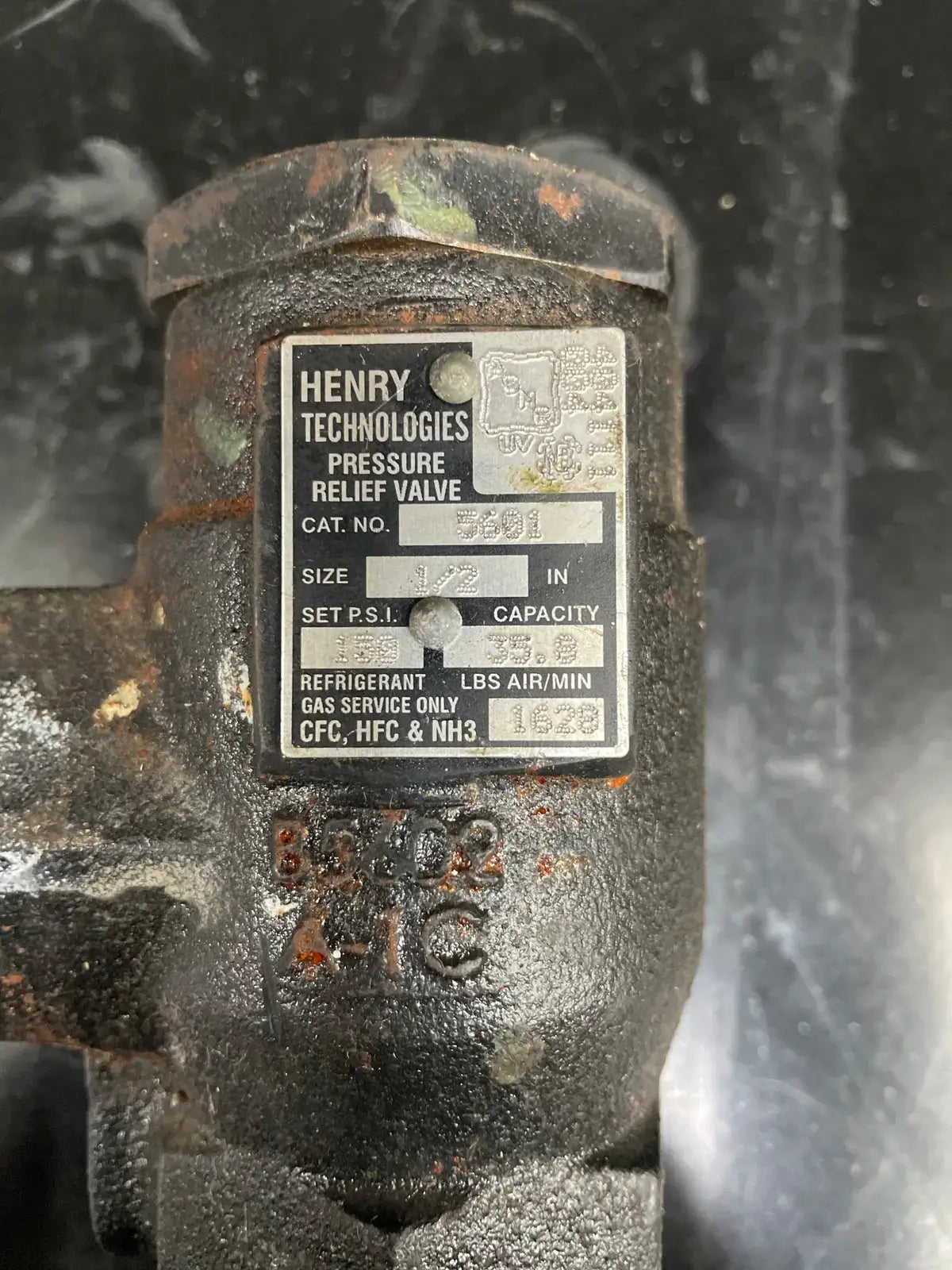 Henry Technologies Refrigerant Pressure Relief Valve. Cat No: 5601. Set PSI Capacity: 150 PSI, 57.7 LBS Air/Min. Angle Type. Size: 1/2 FPT x 1 FPT.