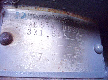 Ingersoll - Dresser Centrifugal Pump. Model: D824. Size: 3x1.5x8. Impeller diameter: 7 in. Maximum impeller size: 8 in. Pump mat'l: CI. Baldor Industrial Motor, 10 hp. Inlets: (1) 3 in. dia. flanged port. Outlets: (1) 1-1/2 in. dia. flanged port. Overall dimensions: 2 ft. 1 in. L x 1 ft. 6 in. W x 1 ft. 7 in. H.
