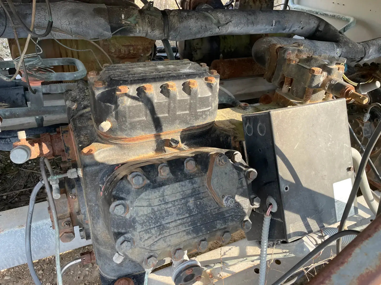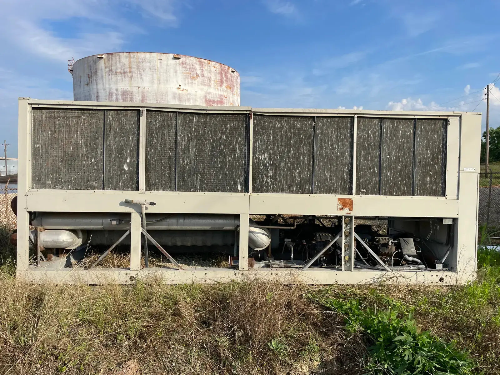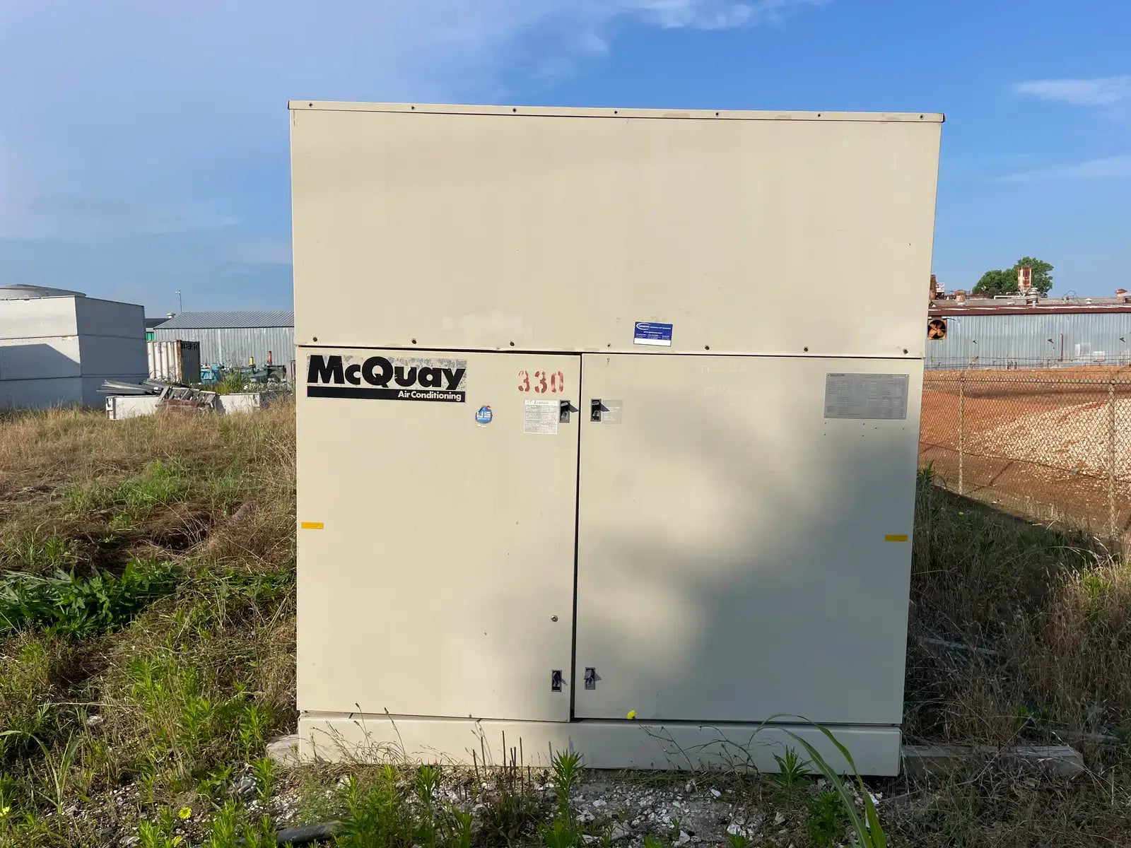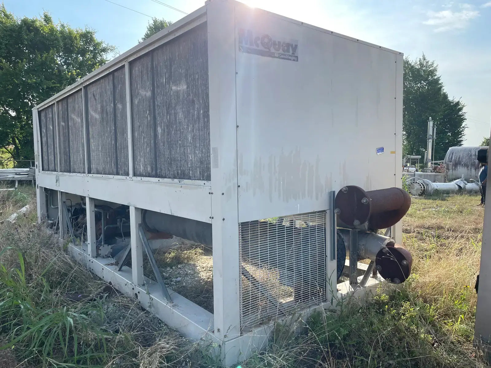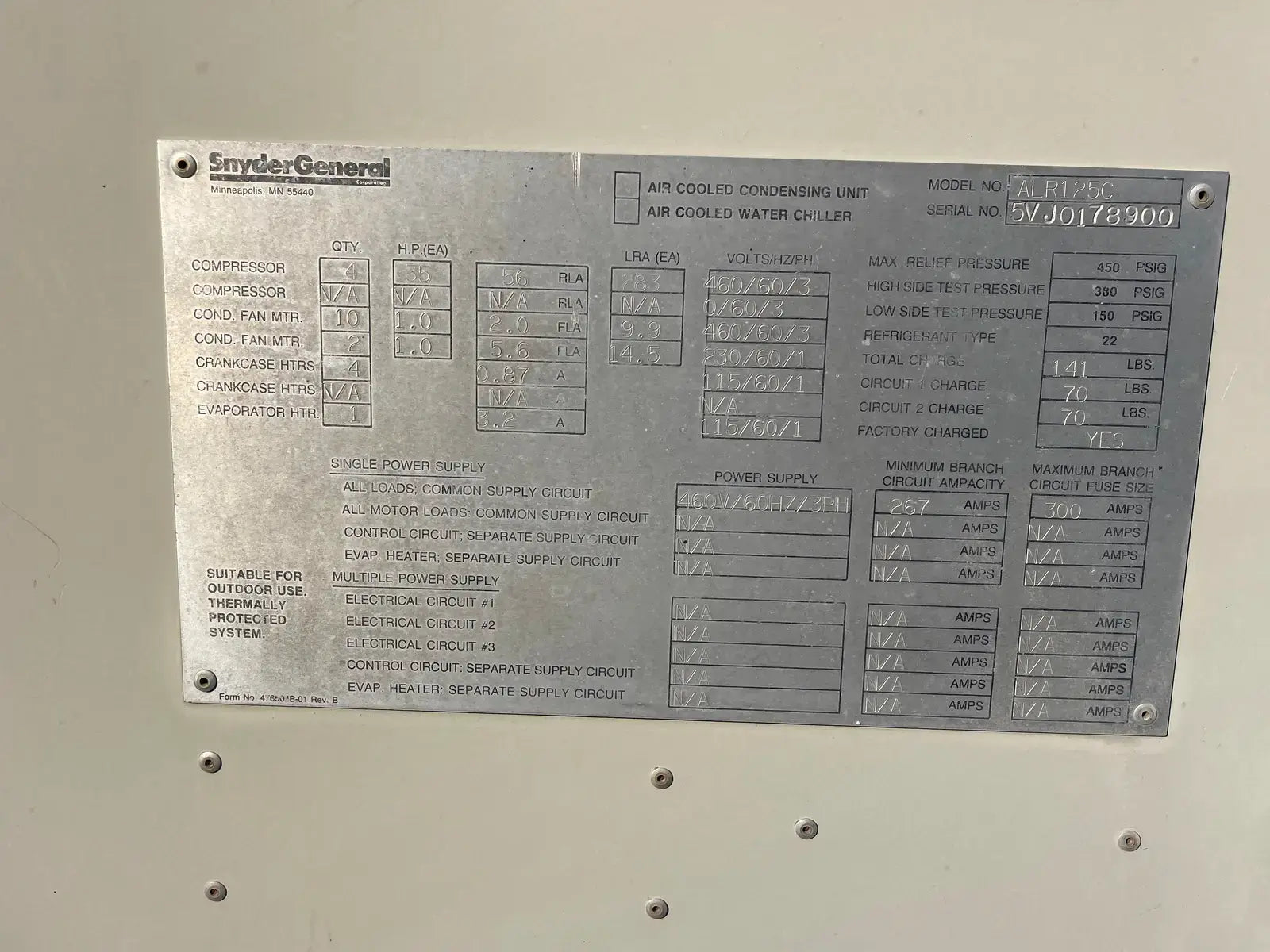 1990 Snyder General / McQuay Air cooled Chiller 125 Tons. Model ALRC125C. S/N 5VJ0178900. Refrigerated System. (4) 35 hp Compressors, 56 RLA, 283 LRA (EA), 460 V, 60 Hz, 3 phase, (12) Cond. Fan Motor. 1 hp, 2.0/5.6 Fla, 9.9/14.5 LRA, 230/460 V, 60 Hz, 1 phase, (4) Crankcase HTRS. 0.87 A, 115 V, 60 Hz, 1 phase. (1) Evaporator HTRS. 3.2 A, 115 V, 60 Hz, 1 phase, single Power Supply, All Loads, 267 amps (min.), 300 amps (max.), 460 V, 60 Hz, 3 phase R-22 refrigerant, 141 lb. charge. Inlet: (1) 8 bolt 6 in. dia. flange. Outlet: (1) 6 in. dia. bolt. Overall dimensions: 18 ft. 8 in. L x 91 in. W x 92 in. H. (ACN400)