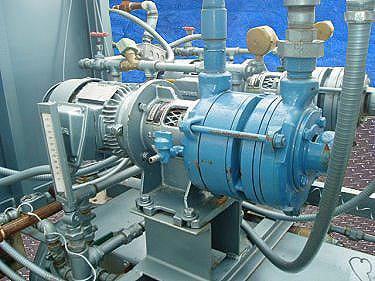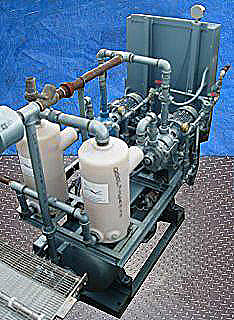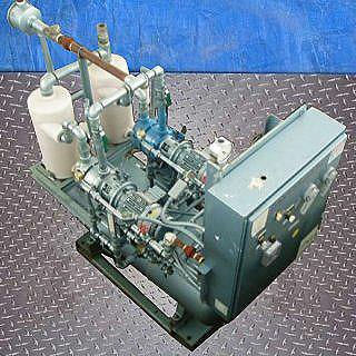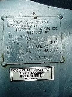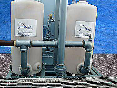 1994 Squire Cogswell Monobloc Full Vacuum Skid. Brunner Engineering and Manufacturing Inc. Vacuum Tank- 70 Gallon, Nat'l Bd: 78673H, P/N: 0673 C-12145-3A, MAWP: 200 psi, @ 450 °F, MDMT -20 °F @ 200 psi, shell thickness: 0.151 in., head thickness: 0.124 in. (2) Squire Cogswell/Robuschi Vacuum Pumps, Model: RVA302, S/N's: 9404242WJ and 9404243WJ. (2) Siemens Motors, 2 hp, 1720 rpm, 230/460 V, 5.8/2.9 amps, 60 Hz, 3 phase. Squire Cogswell Co. Control Panel, Model: 2.0-460.2LR, S/N: 90770, control power supply: 115 V, 8.3 amps, 60 Hz, single phase. (2) Poly Tanks- 7.5 Gallon. (1) Recieving Tank- 8 Gallon. Inlets: (1) 2 in. dia. FNPT, (2) 1 in. dia ports. Outlets: (2) 1-1/2 in dia. NPT. Overall dimensions: 86 in. L x 42 in. W x 80 in. H.(H12).