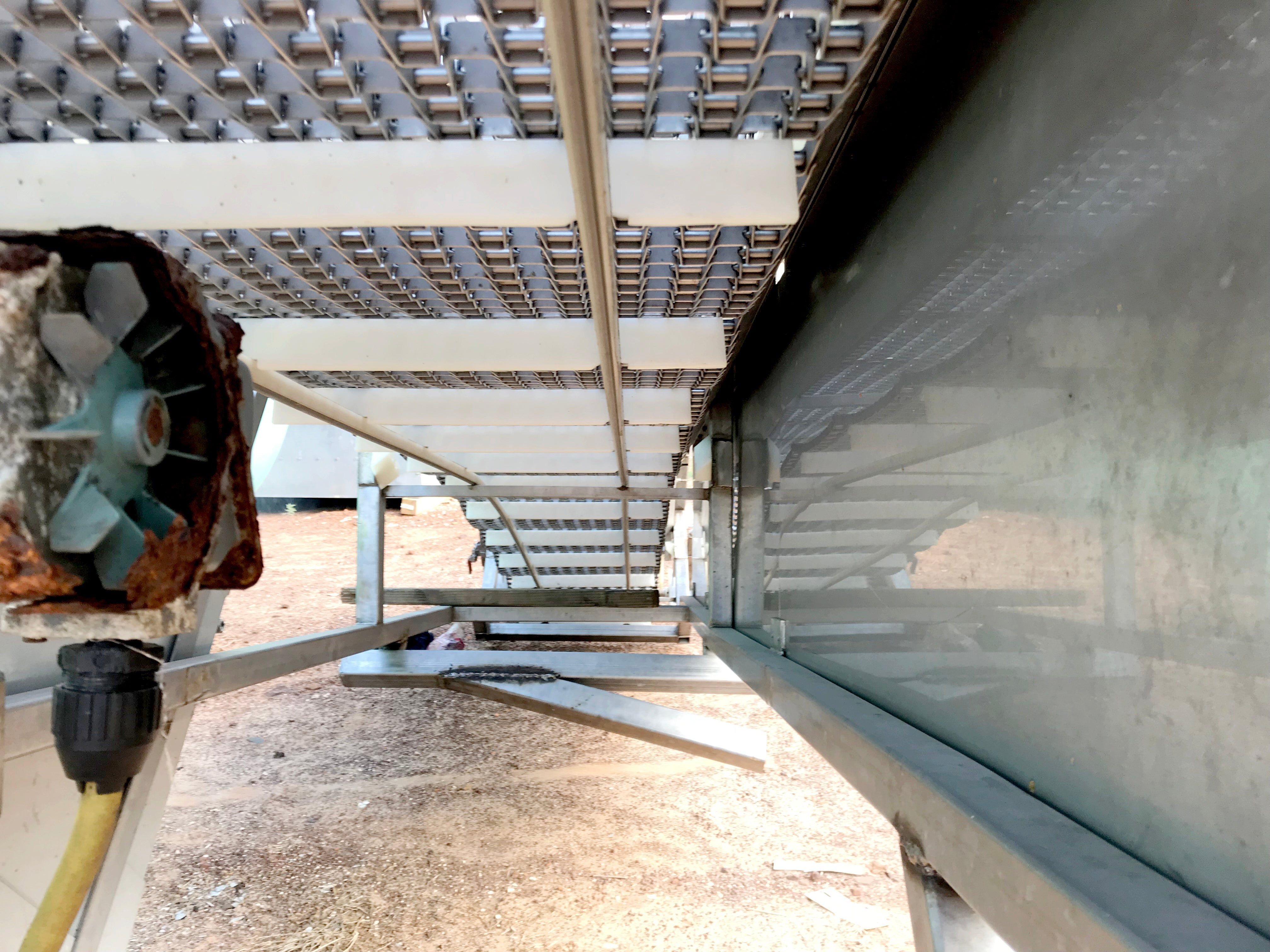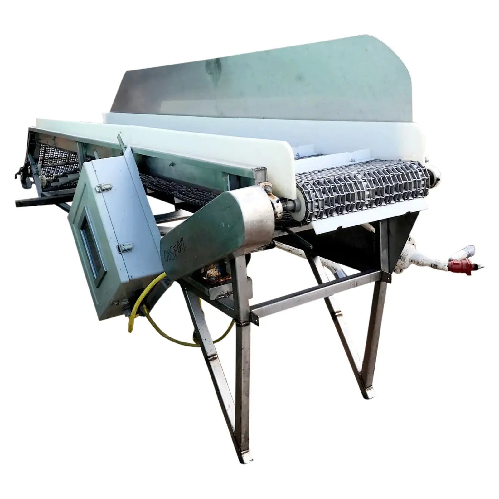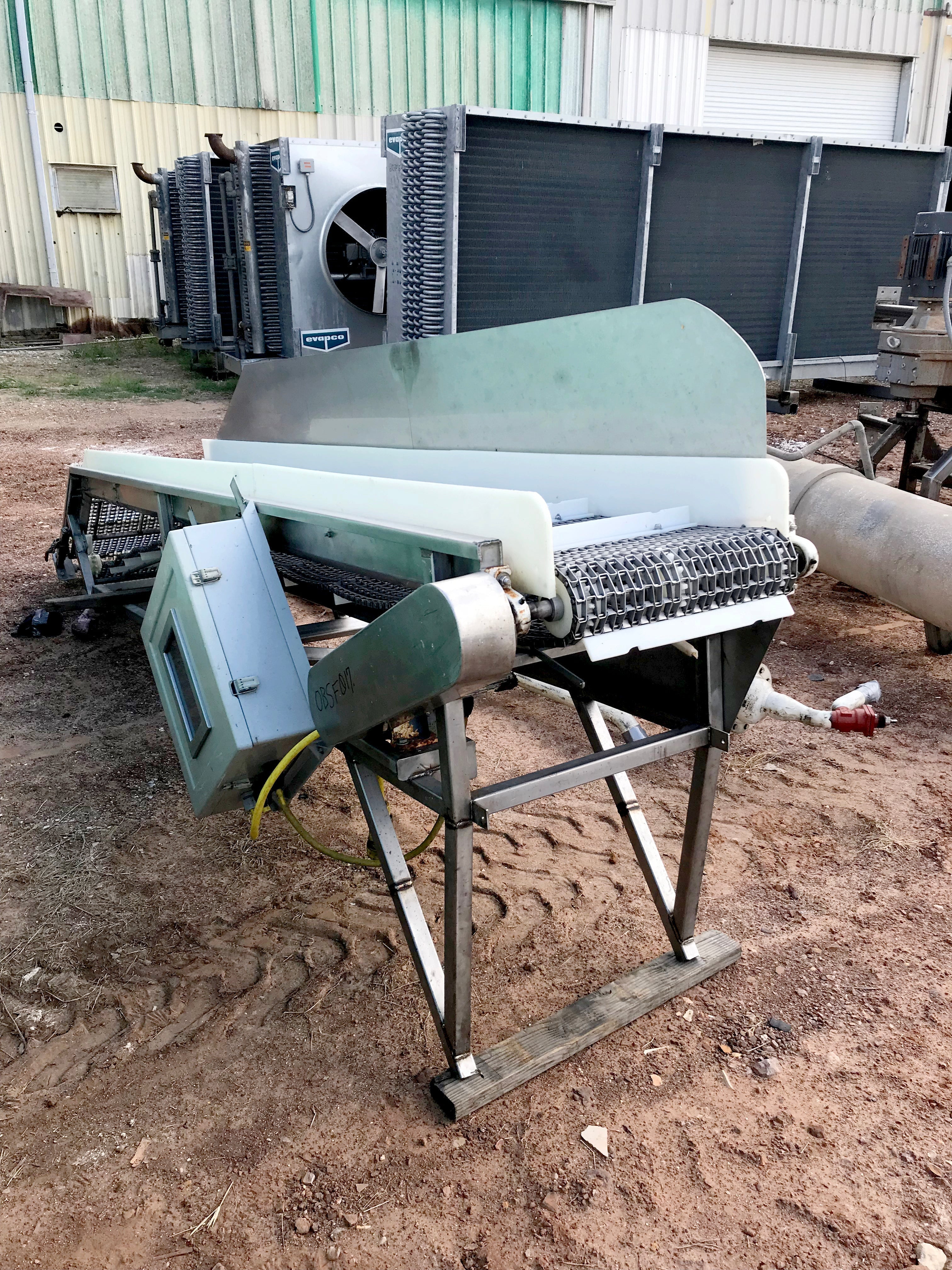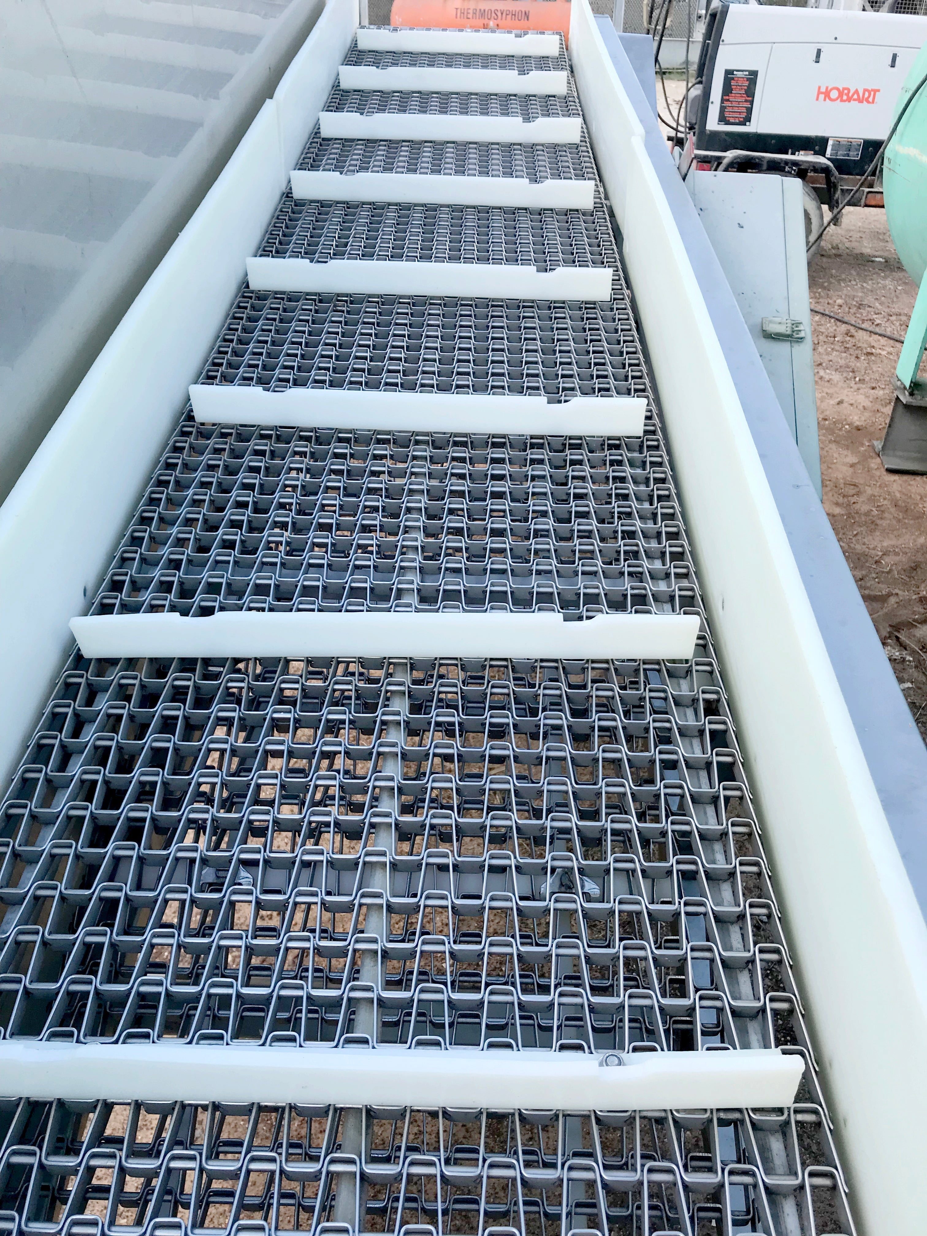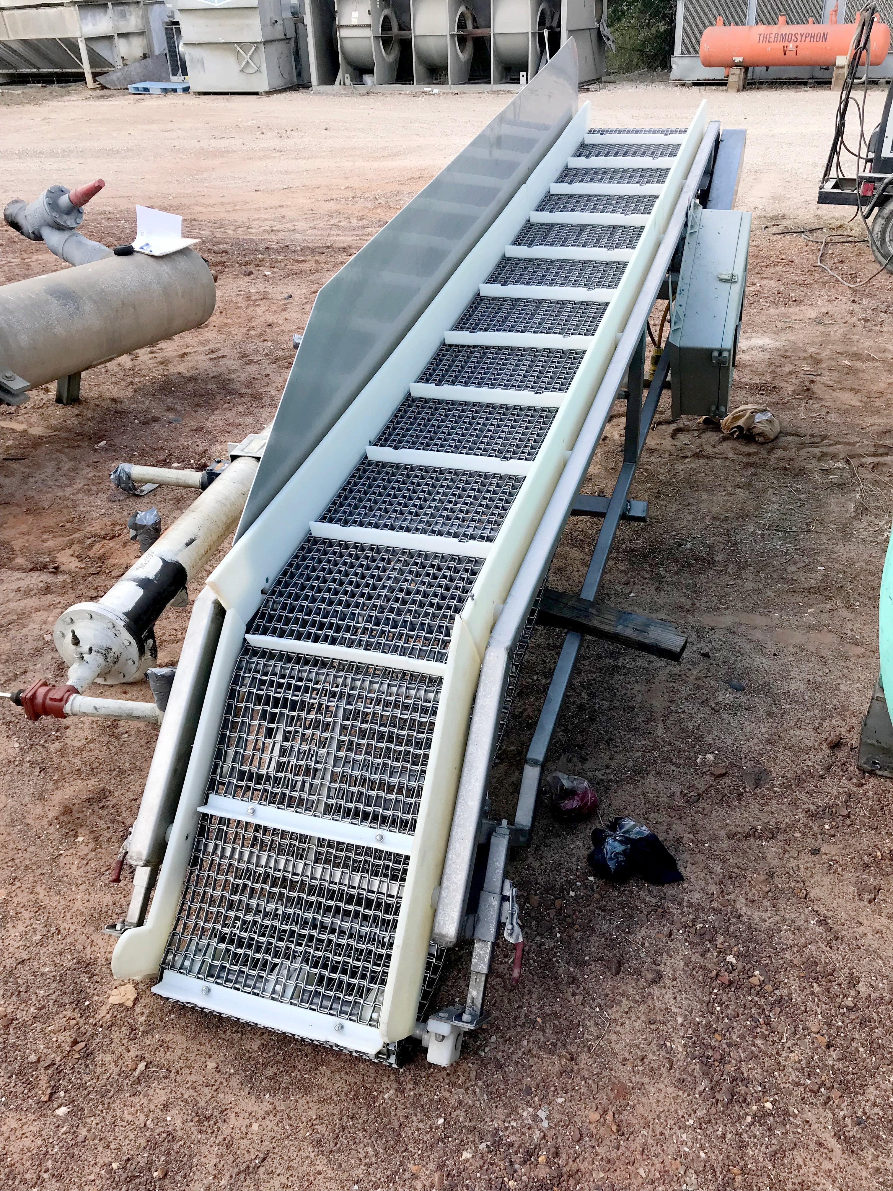 Stainless Steel Incline Conveyor - 18 in. wide, 1.5 in. cleats, 10.5 ft straight then 2 ft. after angle. Previously used with a spiral freezer