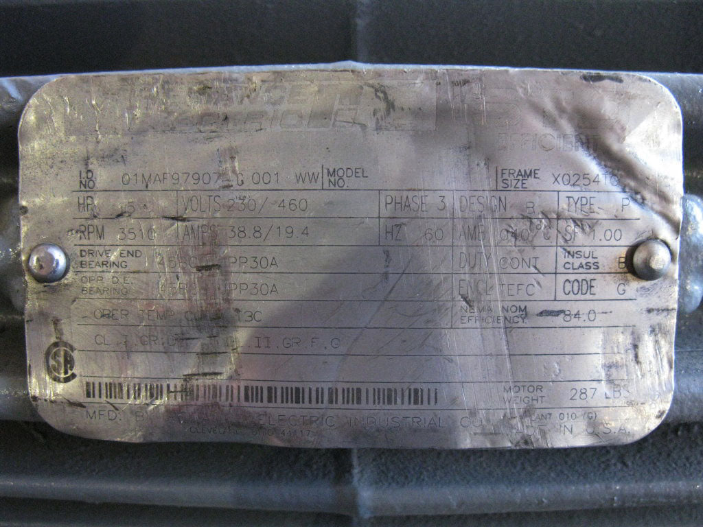 1994 Tri Clover Centrifugal Pump. Model: C216MDG25T-S. Impeller: 5-1/4 in. dia. Capacity: 240 gpm @ ~52 psi. Reliance Electric motor: 5 hp, 3510 rpm, 230/460 V, 38.8/19.4 amps, 60 Hz, 3 phase. ID No. 01MAF97907_G001WW. Frame size: XO254IO. The C-Series pump is the original, all-purpose, sanitary process centrifugal pump. Its practical design and flexibility have provided processors with strong performances in thousands of applications. A great value, the C-series pump maintains an integral Clean-In-Place design as standard. Inlets: (1) 1 ½ in. dia. s-line, (1) 1 in. dia. s-line. Outlets: (1) 2 ½ in. dia. s-line. Overall dimensions: 2 ft. 7-5/8 in. L x 1 ft. 7 in. W x 1 ft. 4-1/4 in. H.(ACN35).