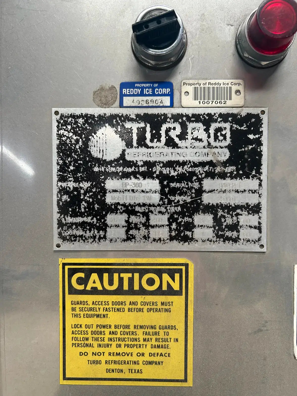 Turbo Vogt Ice Block Press. Model: BP360. Serial No: 980141. Capacity: 10 Lb. blocks-360 blocks/hr.  Nominal Block Size(in): 6x6x10.