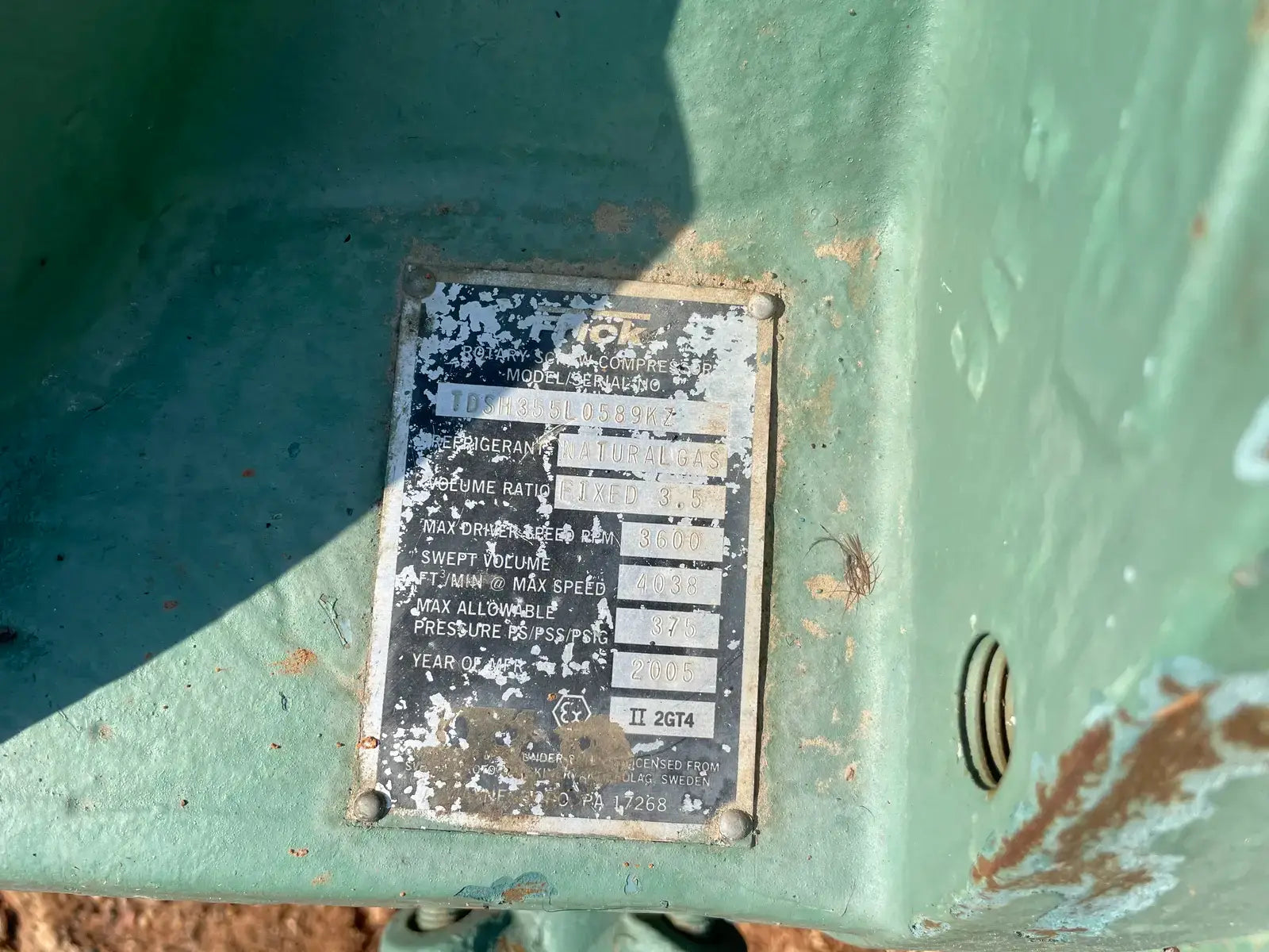 Frick Rotary Bare Screw Compressor. Model: TDSH355L. Serial No: 0589KZ. Previous Refrigerant: Gas. Fixed Volume: 3.5. Max RPM: 3600. Max PSI: 375.