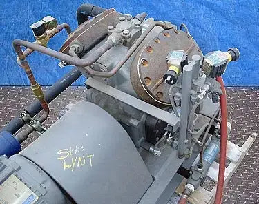 Carlyle Open-Drive Reciprocating Compressor. Model 5F40-149. S/N 2698J01090. Cylinders: 4. Nominal hp: 20. Output: 39.8 cfm @ 1750 rpm. Slightly used. Complete with water cooled heads, external unloaders, auxiliary external oil pump, service valves and mounting Frame.(H11).