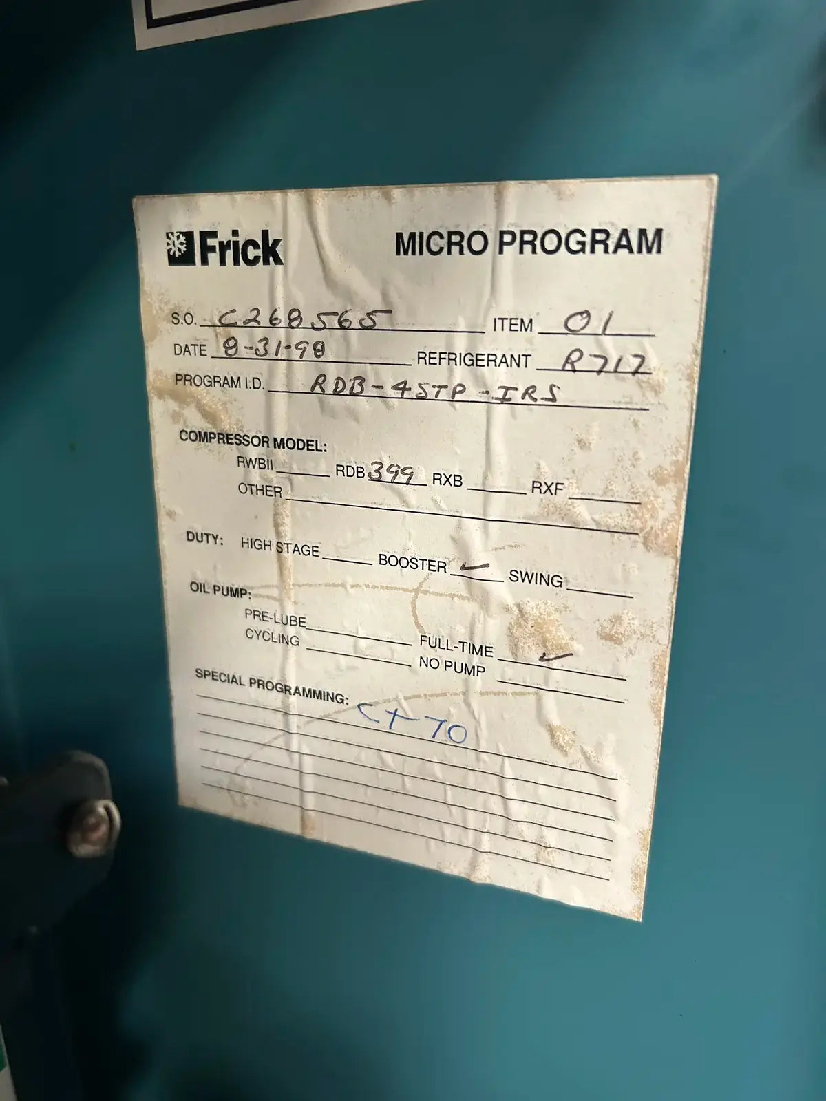 Frick Micro Control Panel. Model: RDB Plus. Serial No: C-268565. Power Supply - 120 Volts, 60 Hz. 1 Ph.