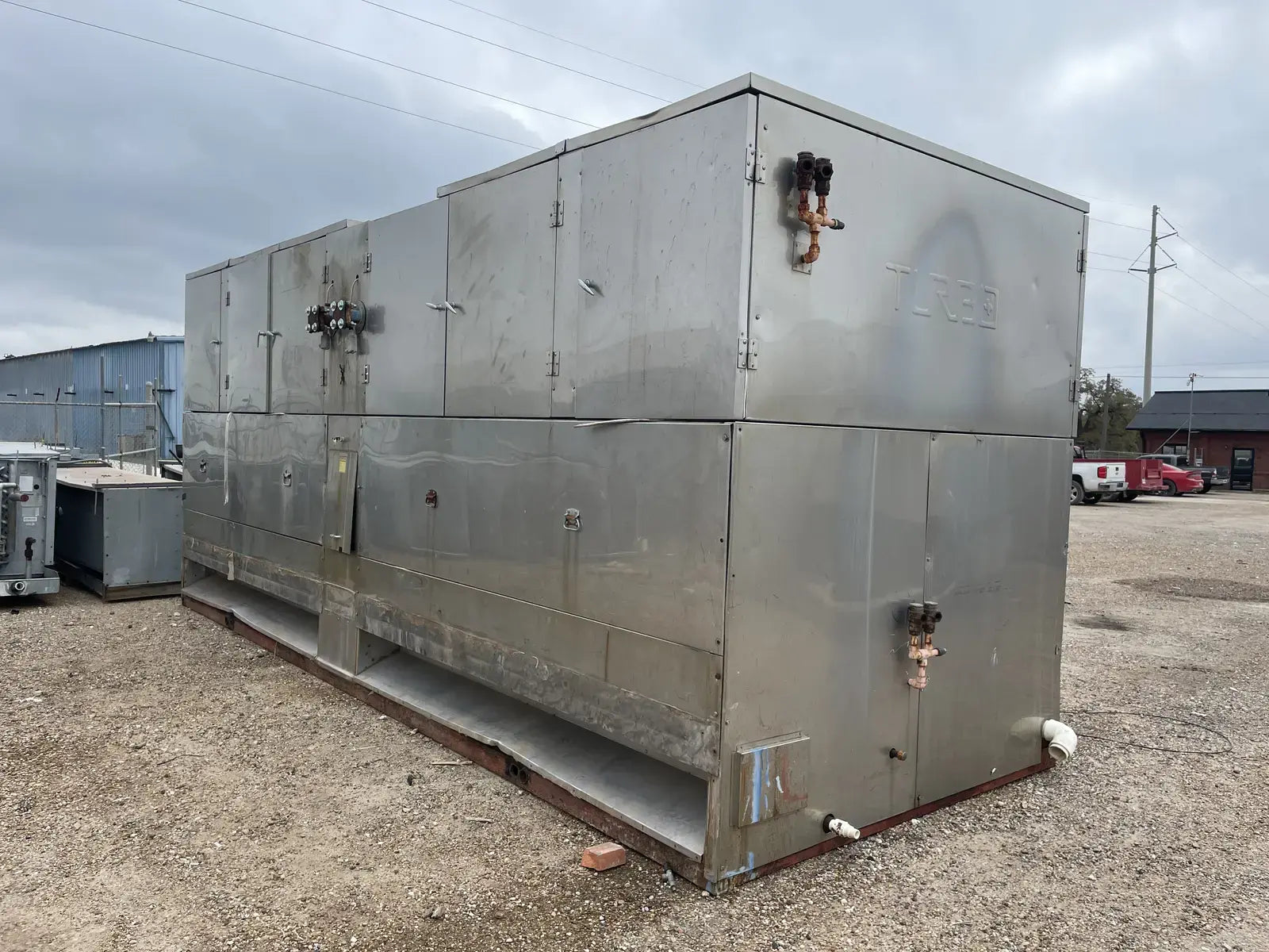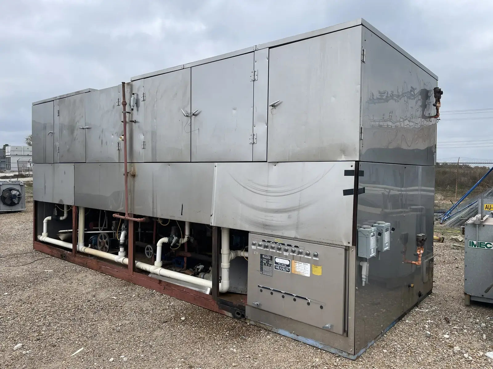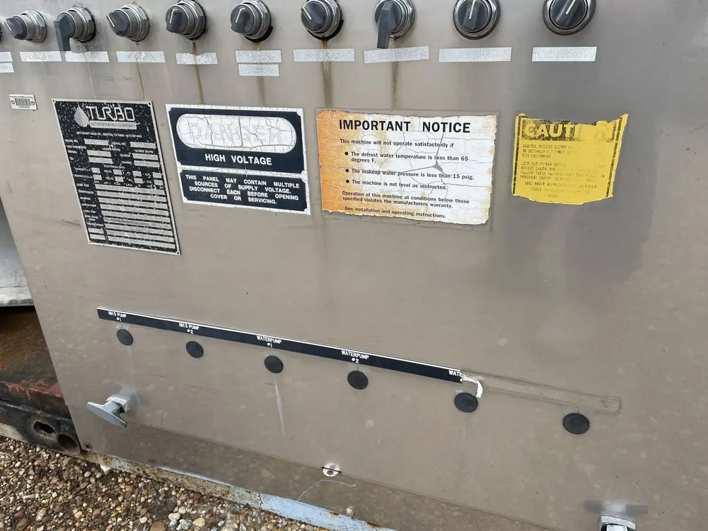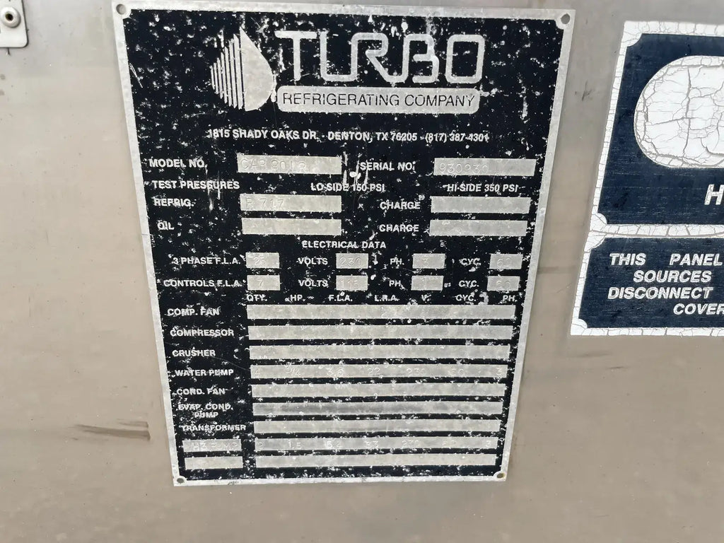Turbo Refrigeration Company Ice Maker. Model: CAR80LR. Serial No: 930930. Refrigerant: R-717. Nominal Ice Capacity U.S Tons (24 hrs): 40. Liquid Ammonia Flow: 45.0. Overall Dimensions(inches): 256x94x110. Shipping Weight(lbs): 17040.