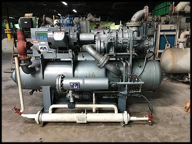 Mycom Rotary Screw Booster Compressor Package. Built by M&M in 1993. Mycom model 200 VMD. Serial 2035031. Reliance motor: 75 HP, 3555 RPM, 460V, 60 Hz, 3-phase, 364TS Frame. Previously run with ammonia refrigerant as a booster compressor in a two stage system.