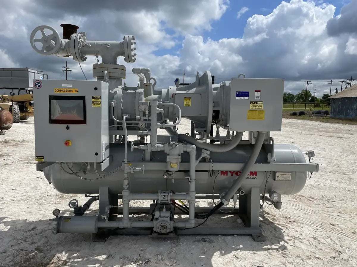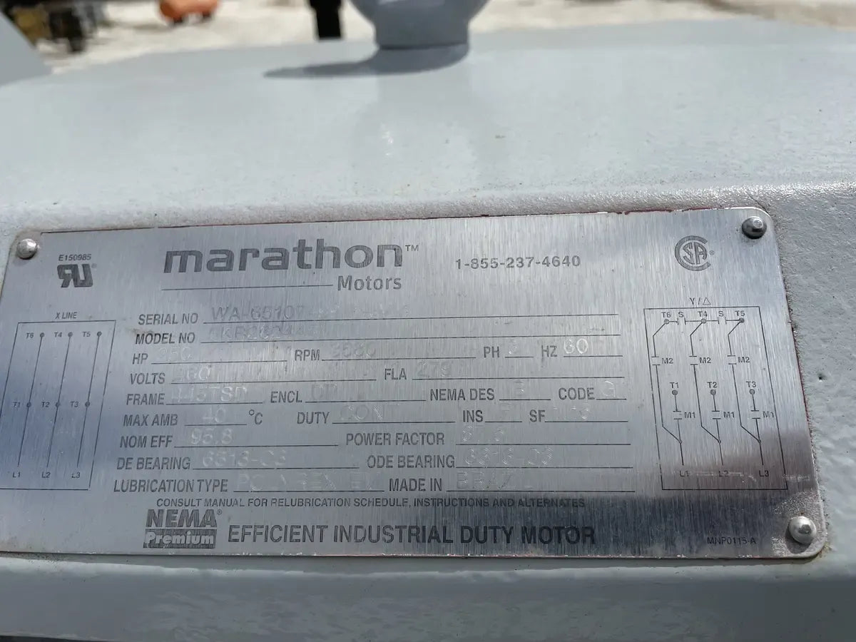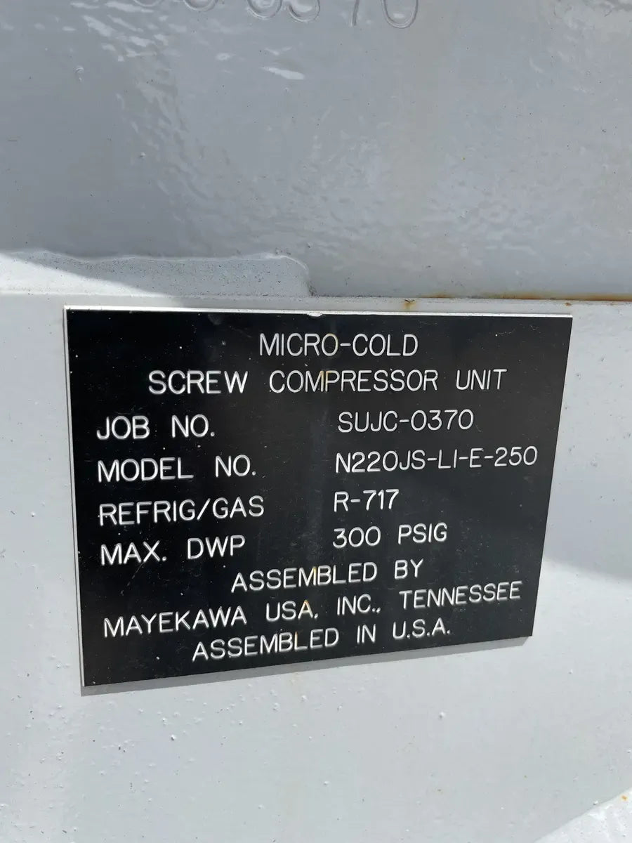 Mycom Rotary Screw Compressor Package. Job No: SUJC-0370. Model No: N220JS-LI-E-250. Refrigerant: R-717. Max Design Pressure: 300 PSIG. Assembled by Mayekawa. Mycom Screw Compressor. Model: N220JS-U. Serial No: 2250084. Pressure Test(PSIG): 5.3. Leak Test (PSIG): 3.5. Manufacture Date: 04-2016. Working Fluid: NH3. Max Swept Volume(m3/h): 1310. Max Speed: 4500. Marathon Efficient Industrial Duty Motor. Serial No: MA-651074994-JV-1. Model No: 5KB26244SVF. HP: 250, RPM: 3580, PH:3, Hz: 60, Volts: 460, FLA: 279. Frame: 445TSD. ENCL: DP. NEMA Des: B. Max Amb: 40 C. Mycom Oil Separator: Serial No: S177001A, National Board No: 0260, Year Built: 2017, Shell Thk: .378, Head THK: .378, Year Built: 2017. MAWP: 350 PSI @ 300 F. MDMT: -20 F @ 350 PSI. Mycom Control Panel. Model: SUJC 0370, Serial No: L17JCP5P000190. Drawing Number: SUJC0370E. Manufactured: 10/09/2017. Type: 4. Short Circuit Current Rating: 10. Max Voltage: 208 V. Ram Industries Motor Starter. Part Number: MY42B13.0. Type: 1, Volts: 460, HZ: 60, PH: 3, Max HP: 250, FLA: 279. Withstand 65kA.