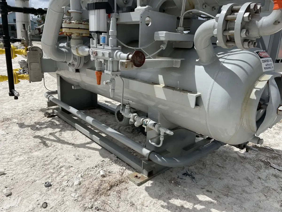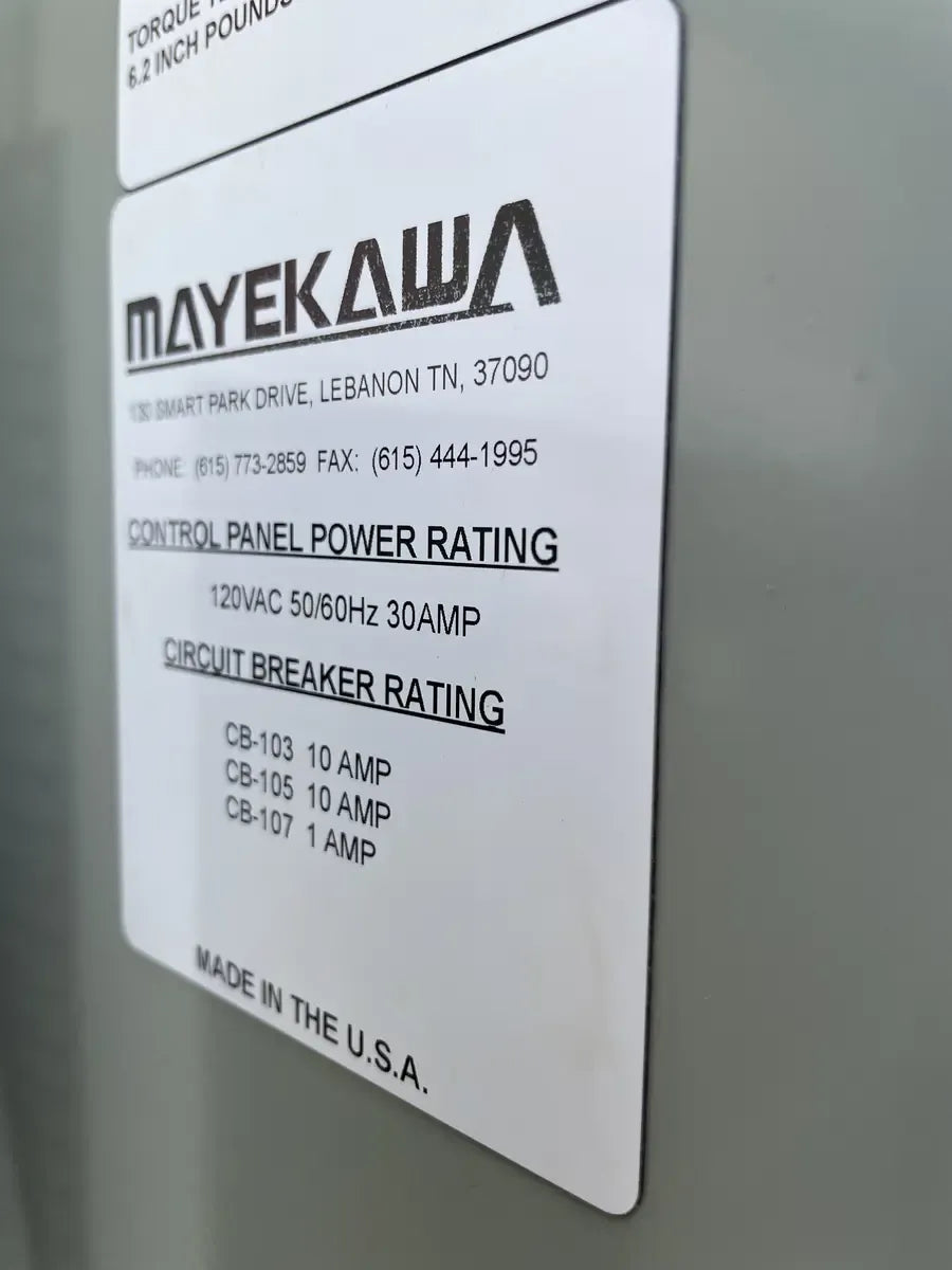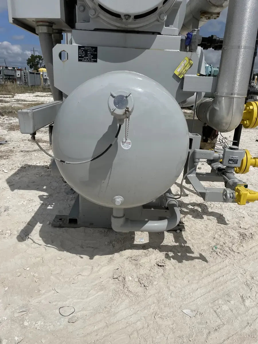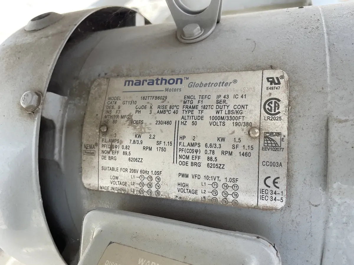 Mycom Rotary Screw Compressor Package. Job No: SUJC-0370. Model No: N220JS-LI-E-250. Refrigerant: R-717. Max Design Pressure: 300 PSIG. Assembled by Mayekawa. Mycom Screw Compressor. Model: N220JS-U. Serial No: 2250084. Pressure Test(PSIG): 5.3. Leak Test (PSIG): 3.5. Manufacture Date: 04-2016. Working Fluid: NH3. Max Swept Volume(m3/h): 1310. Max Speed: 4500. Marathon Efficient Industrial Duty Motor. Serial No: MA-651074994-JV-1. Model No: 5KB26244SVF. HP: 250, RPM: 3580, PH:3, Hz: 60, Volts: 460, FLA: 279. Frame: 445TSD. ENCL: DP. NEMA Des: B. Max Amb: 40 C. Mycom Oil Separator: Serial No: S177001A, National Board No: 0260, Year Built: 2017, Shell Thk: .378, Head THK: .378, Year Built: 2017. MAWP: 350 PSI @ 300 F. MDMT: -20 F @ 350 PSI. Mycom Control Panel. Model: SUJC 0370, Serial No: L17JCP5P000190. Drawing Number: SUJC0370E. Manufactured: 10/09/2017. Type: 4. Short Circuit Current Rating: 10. Max Voltage: 208 V. Ram Industries Motor Starter. Part Number: MY42B13.0. Type: 1, Volts: 460, HZ: 60, PH: 3, Max HP: 250, FLA: 279. Withstand 65kA.