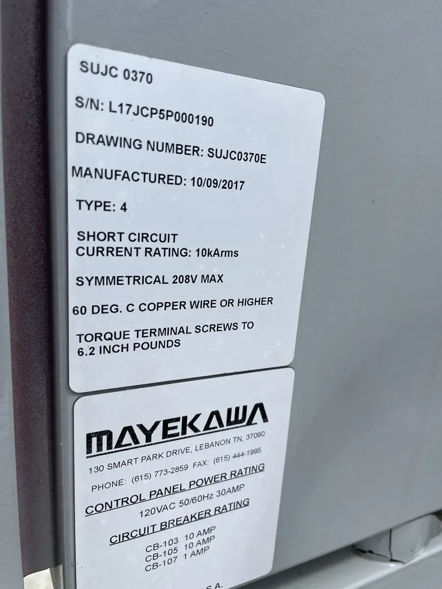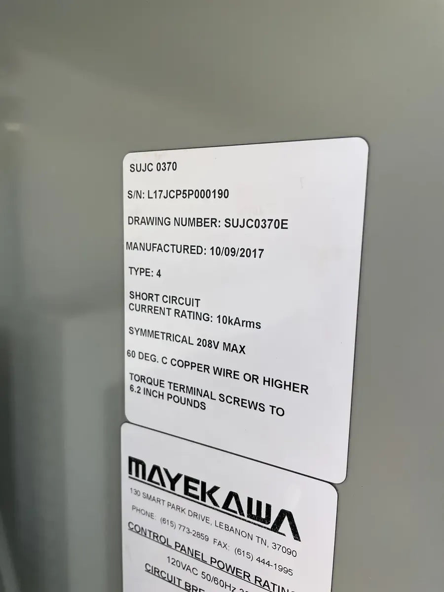 - Micro Control Panel Description: Model: SUJC 0370, Serial No: L17JCP5P000190. Drawing Number: SUJC0370E. Manufactured: 10/09/2017. Type: 4. Short Circuit Current Rating: 10. Max Voltage: 208 V.