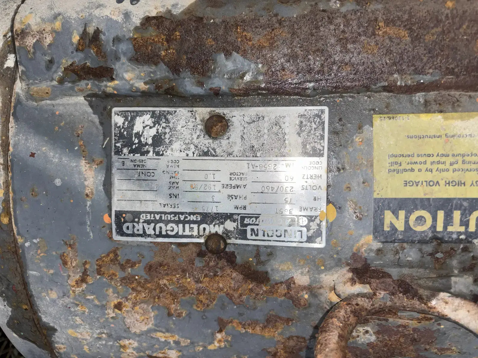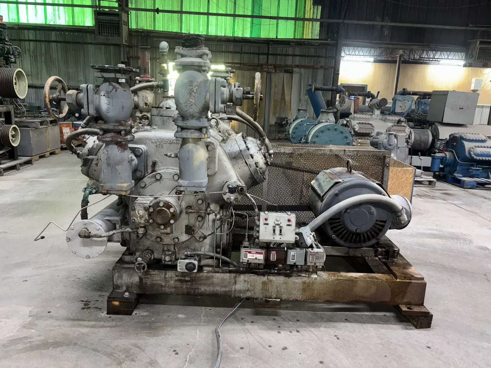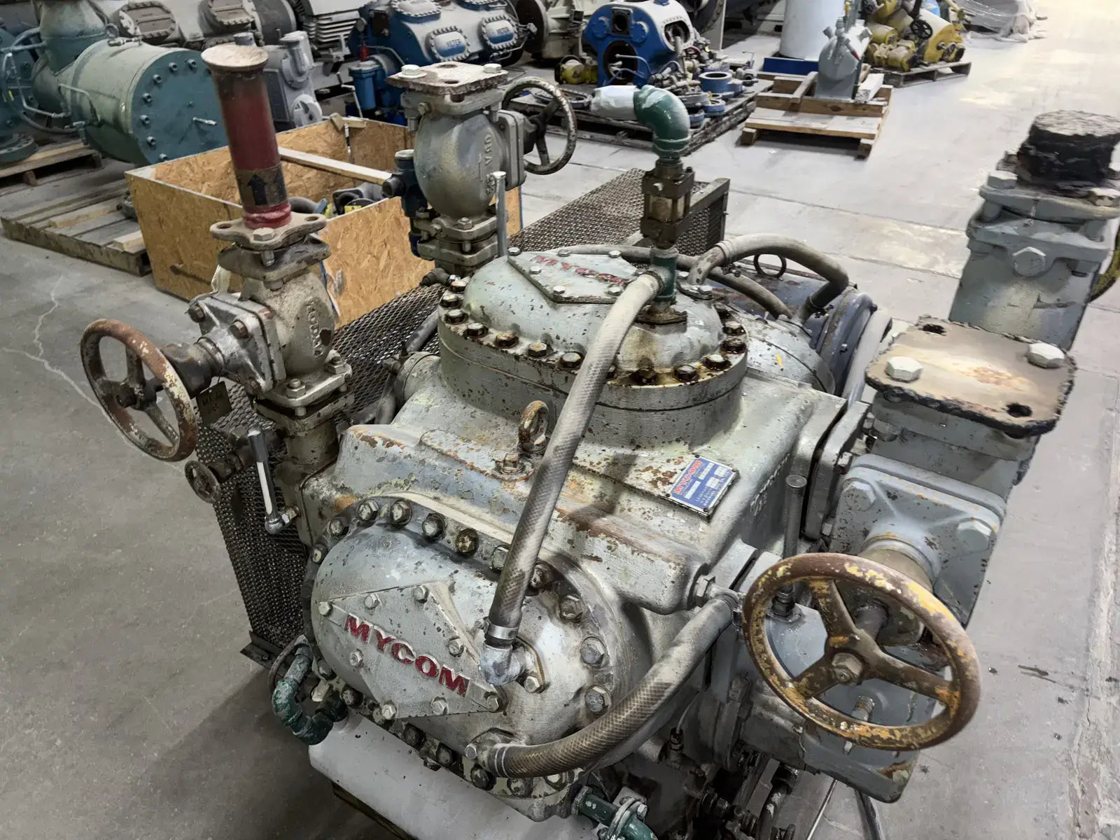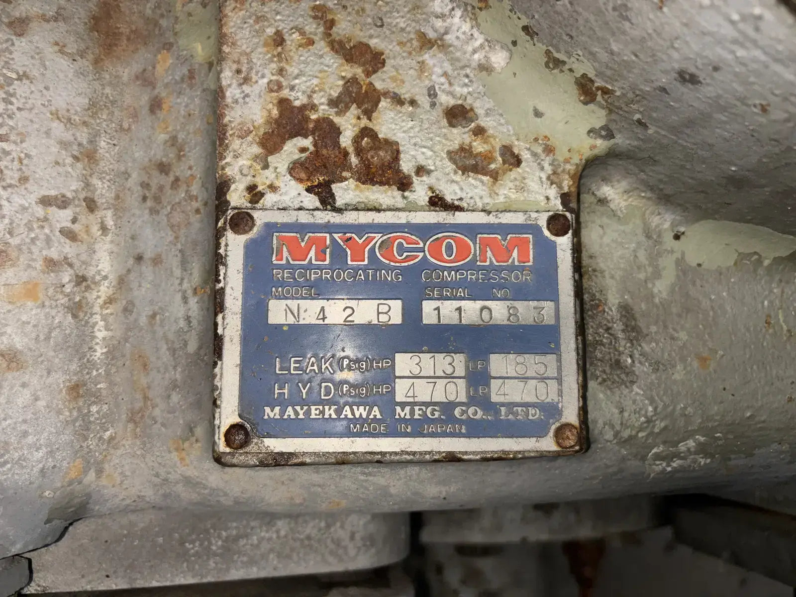 Mycom 8-Cylinder Reciprocating Compressor - Model: N62B, Serial No: 10378.Leak (Psig): HP 313/LP 157, HYD (Psig): HP: 470/ LP 470. Mayekawa Mfg. Co Ltd. Number of Cylinders - Low-Stage: 6, High-Stage: 2. Total Number of Cylinders: 8. Bore x Stroke (mm): 130x100, Number of Revolutions: 800 to 1200. Displacement: 337 CFM Low Stage. 112 CFM High Stage. Lincoln A.C Motor - Frame: 404T, HP: 100, RPM: 1775, Serial No: 1689156, Volts: 230/460, Hertz: 60, Ph: 3, AMPS: 240/120, Service Factor: 1.0, Max AMB: 40, Time Rating: CONT.