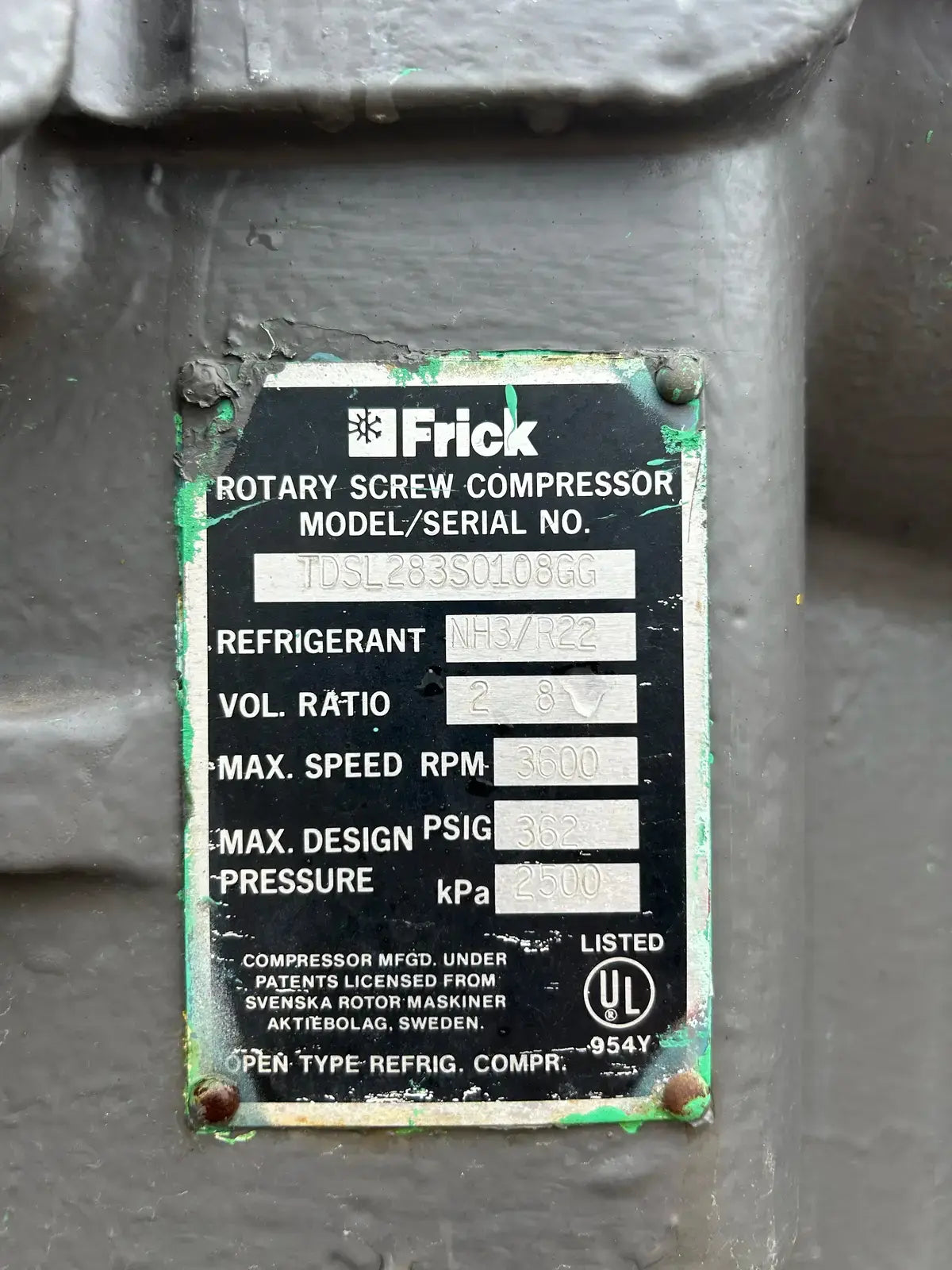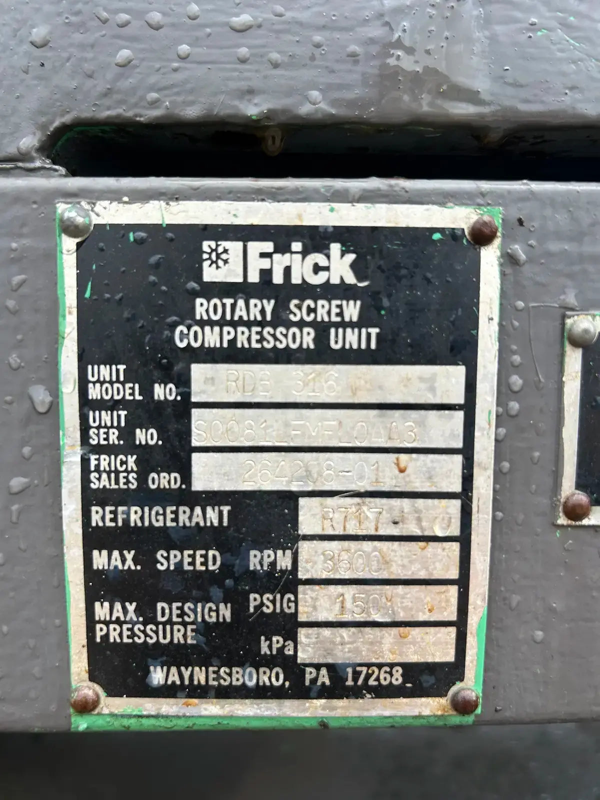 Frick Rotary Screw Compressor Package. Model: RDB-316. Serial No: S0081LFMFL0AA3. Frick Sales Order: 264208-01. Refrigerant: R717. Max Speed(RPM): 3600. Max Design Pressure(PSI): 150. Frick Bare Screw Compressor - Model: TDSL283S, Serial No: 0108GG. Refrigerant: NH3/R22. Volume Ratio: 2.8. Max Speed: 3600 RPM. Max Design: 362 PSIG. Frick Certified Oil Separator - National Board: 108133, MAWP: 150 PSI @ 200 F. MDMT: -20 F @ 13.6 PSI.