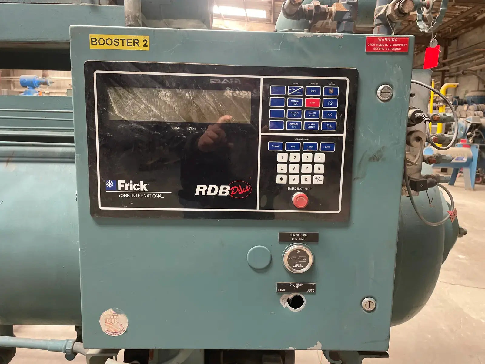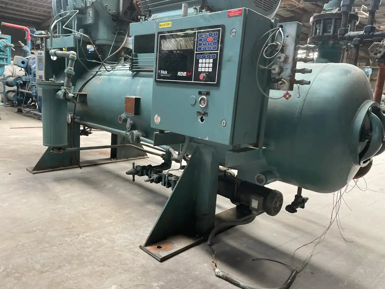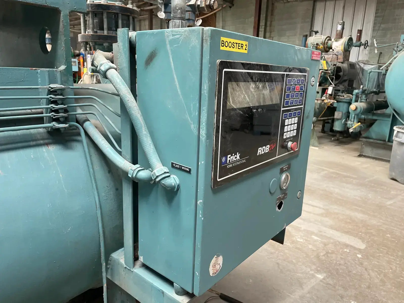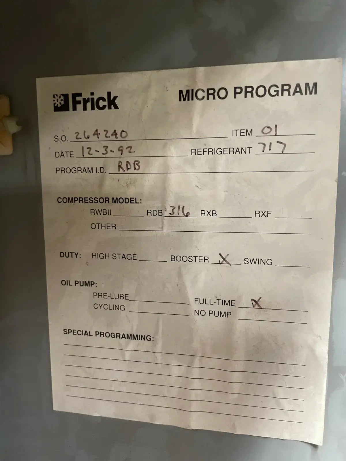 Frick RDB Rotary Screw Compressor Package. Model: RDB-316. Serial No: S0082LFMFTHBA3. Frick Sales Order: 264240-01. Refrigerant: R717. Max Speed: 3600 RPM. Max Design Pressure: 150 PSIG. Frick Bare Screw Compressor: Model: TDSL283S, Serial No: 0245GGR, Refrigerant: R717, Volume Ratio: 2.2-5.0, Max Speed: 3600 RPM, Design Pressure: 350 PSIG, Year of Mfr: 2004. Certified by Frick Oil Separator: National Board: 107878, MAWP: 150 PSI @ 200 F. MDMT: -20 F @ 10.2 PSI. Frick RDB Plus Control Panel.