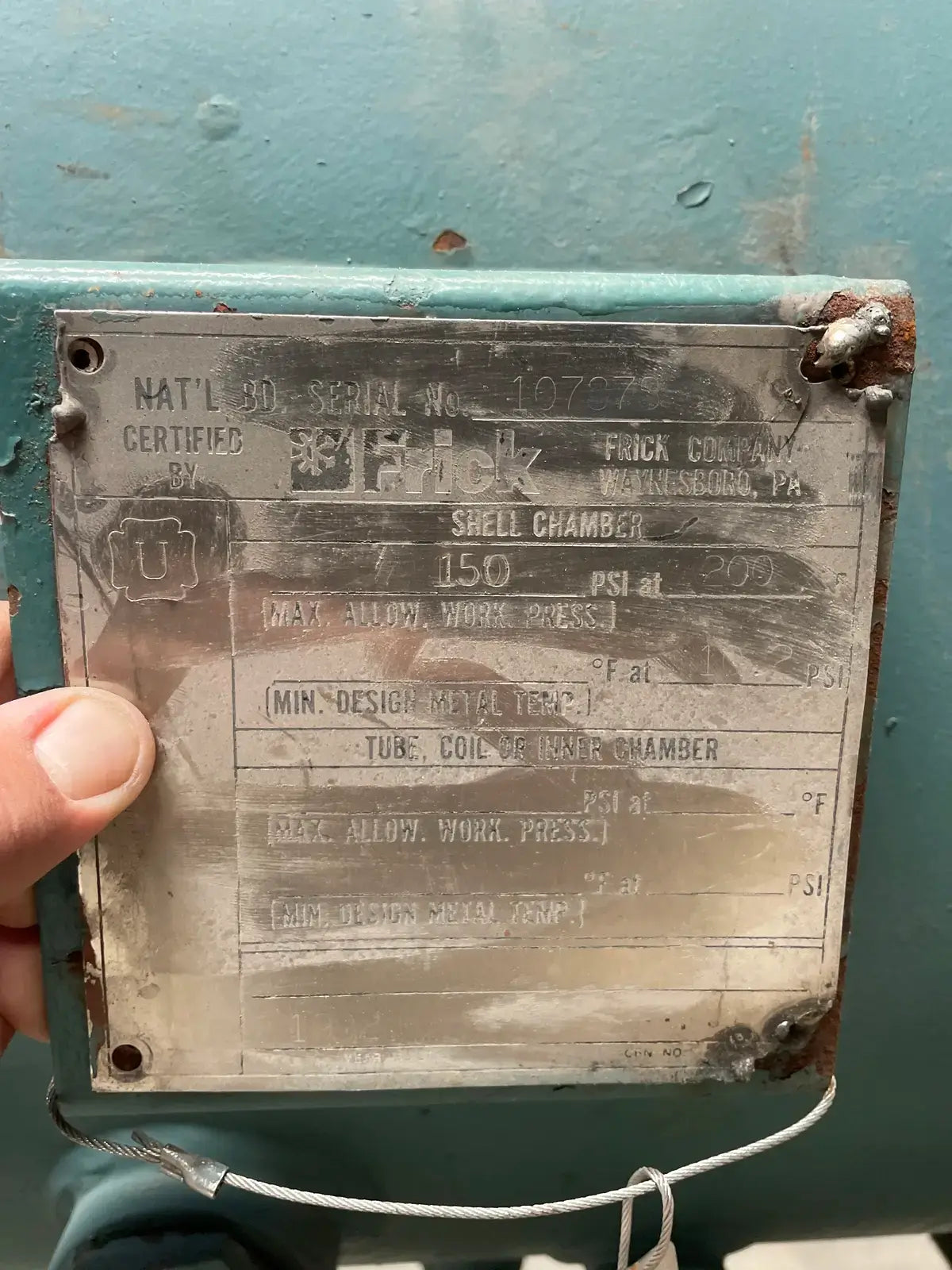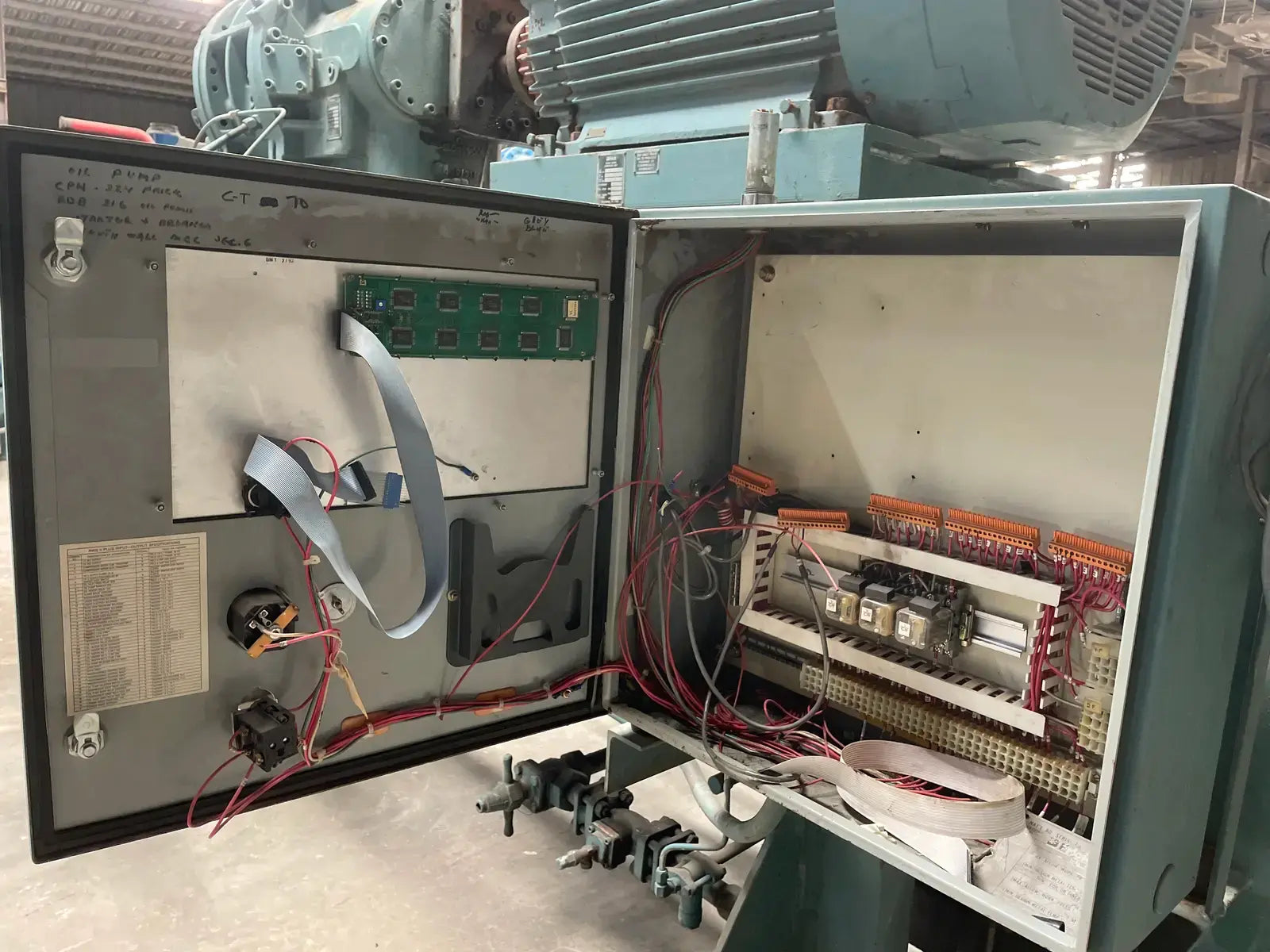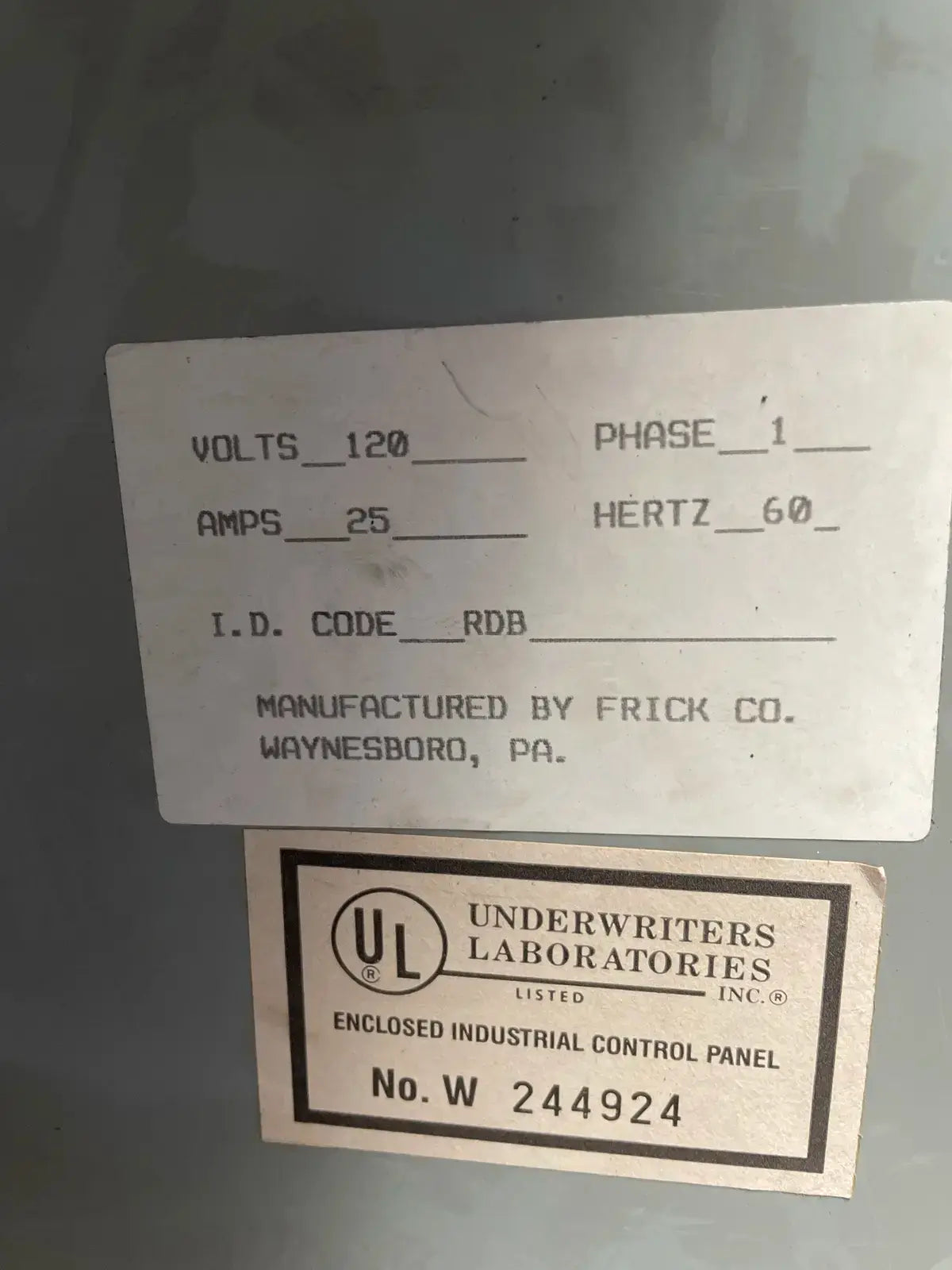 Frick RDB Rotary Screw Compressor Package. Model: RDB-316. Serial No: S0082LFMFTHBA3. Frick Sales Order: 264240-01. Refrigerant: R717. Max Speed: 3600 RPM. Max Design Pressure: 150 PSIG. Frick Bare Screw Compressor: Model: TDSL283S, Serial No: 0245GGR, Refrigerant: R717, Volume Ratio: 2.2-5.0, Max Speed: 3600 RPM, Design Pressure: 350 PSIG, Year of Mfr: 2004. Certified by Frick Oil Separator: National Board: 107878, MAWP: 150 PSI @ 200 F. MDMT: -20 F @ 10.2 PSI. Frick RDB Plus Control Panel.