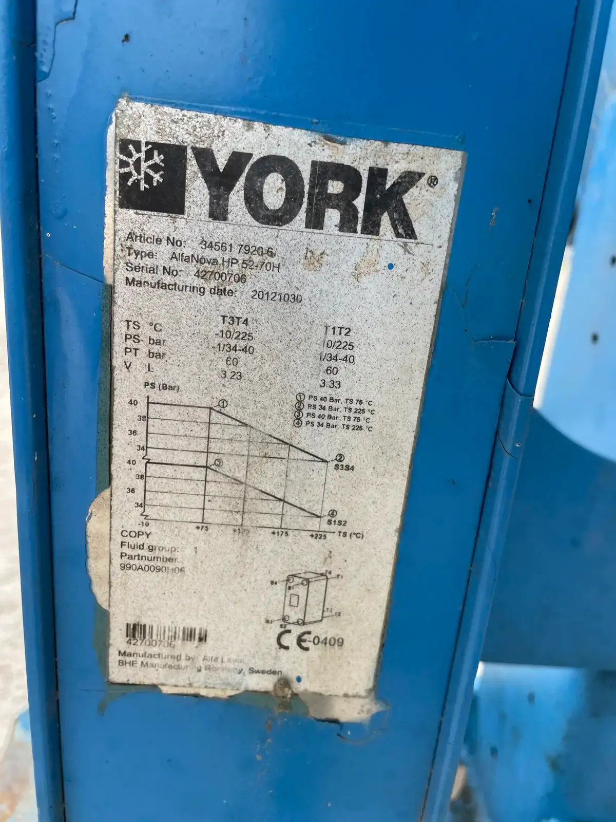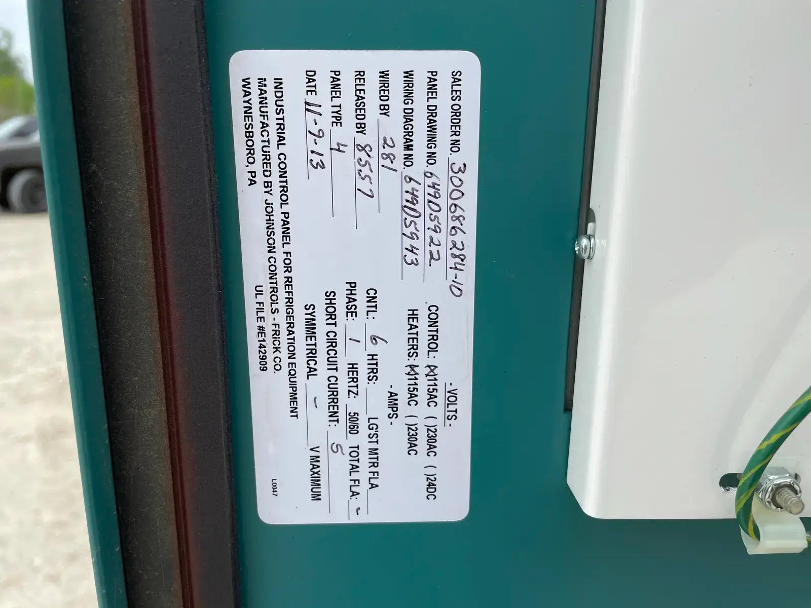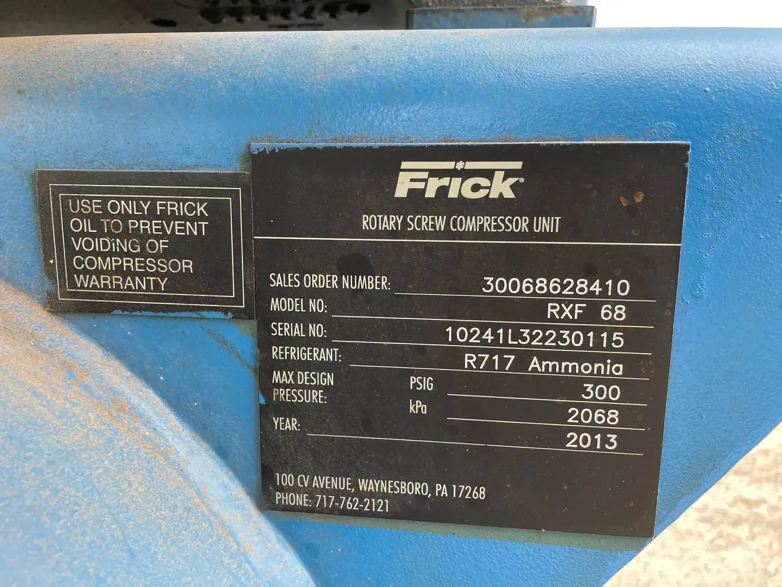 Frick Rotary Compressor Package. Model: RXF-68. Serial No: 10241L32230115. Sales Order Number: 30068628410. Previous Refrigerant: R717. Max Design Pressure: 300 PSIG. Manufacture Year: 2013. Certified by York International Oil Separator: National Board No: 16320, MAWP: 300 PSI @ 250 F, MDMT: -20 F @ 300 F. Frick Quantum HD Control Panel: Production Order: 5008800052, Serial No: 10241L32195757.