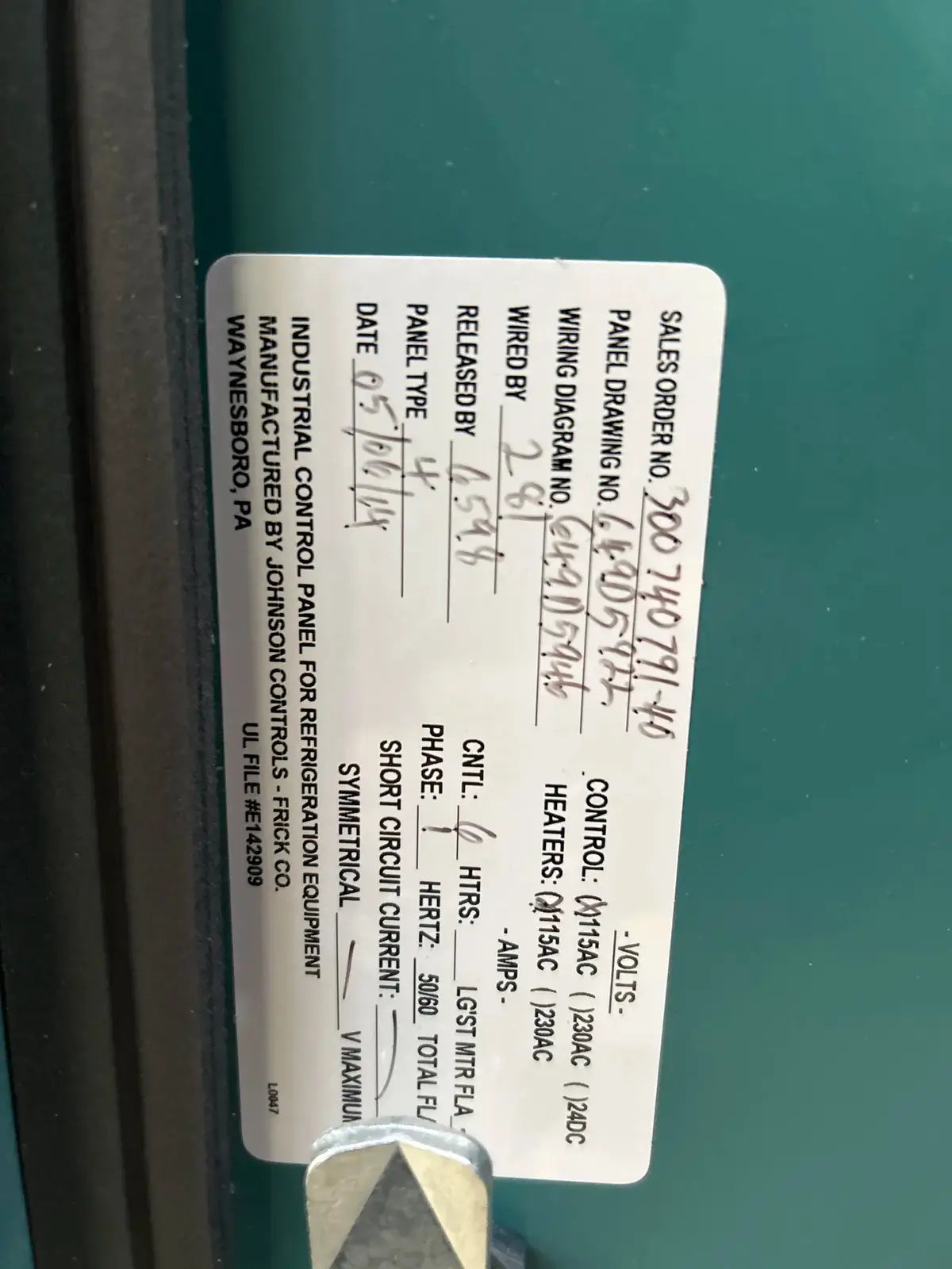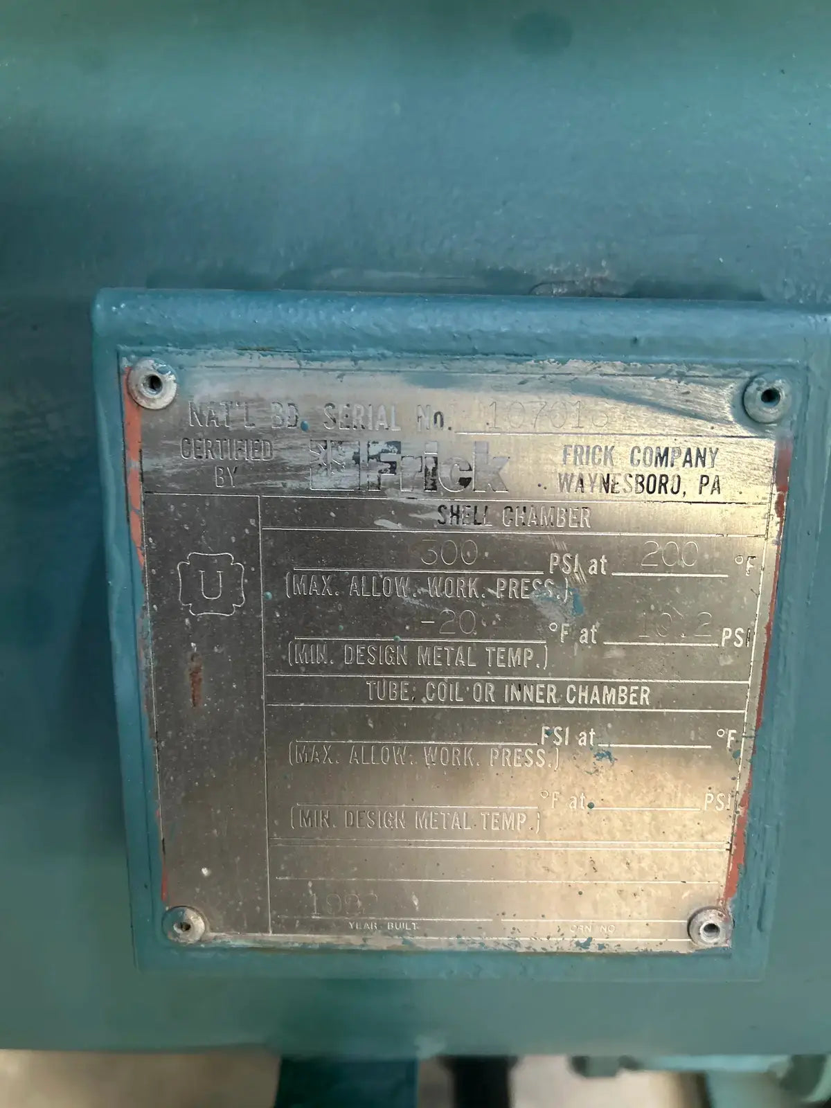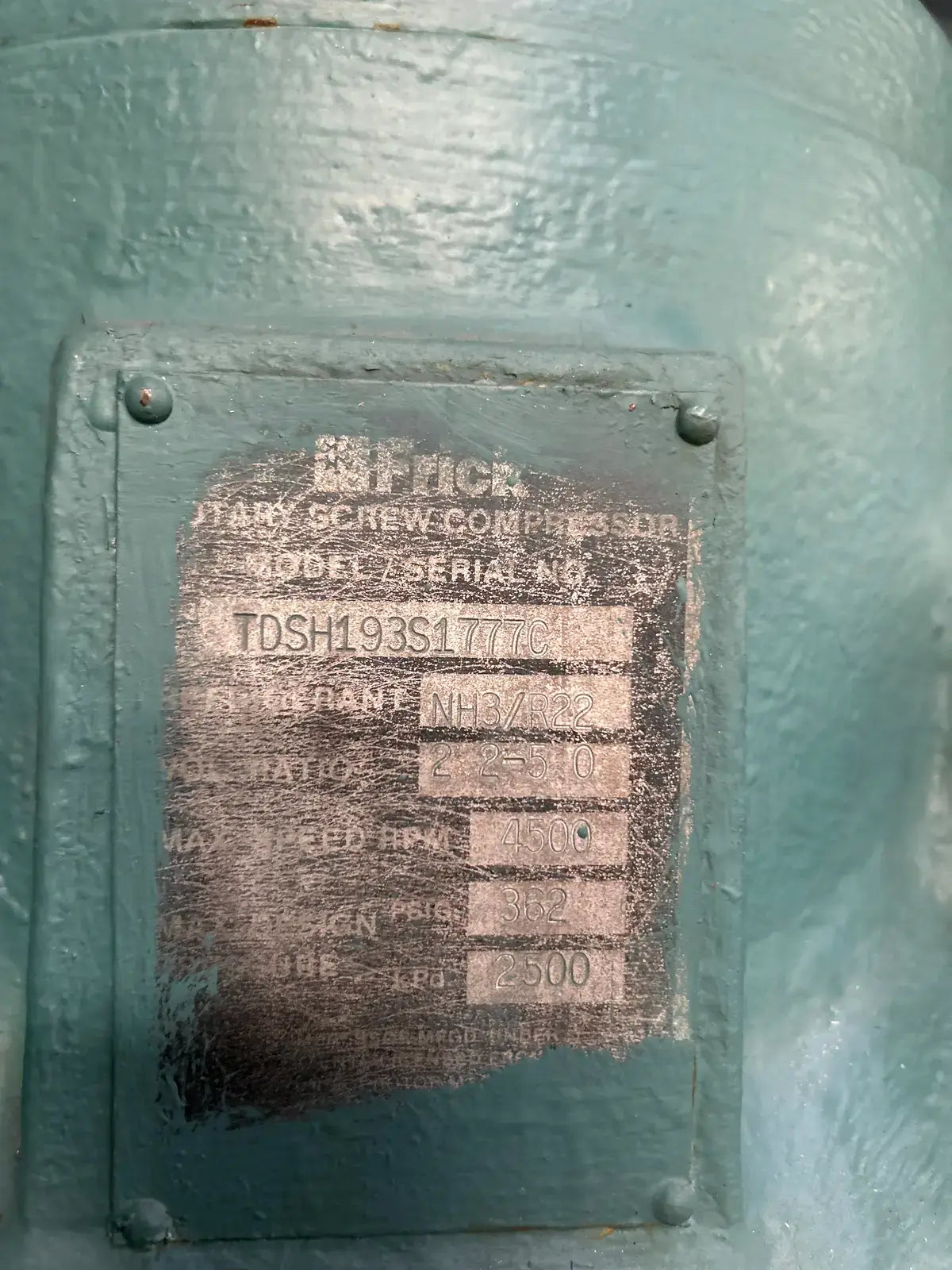 Frick Rotary Screw Compressor Package. Model No: RWB-II-100. Serial No: S0556LFMCTHAA3. Sales Order No: 264178-07. Refrigerant: R-717. Max Speed RPM: 3600. Design Pressure: 300 PSIG. Frick Bare Screw Compressor: TDSH193S. Serial No: 1777C. Refrigerant: NH3/R22. Ratio: 2.2-3.0. Max Speed RPM: 4500. Design Pressure: 362. Certified by Frick Oil Separator: National Board No: 107016. MAWP: 300 PSI @ 200 F. MDMT: -20 F @ 10.2 PSI. Frick Quantum HD Micro Control Panel.