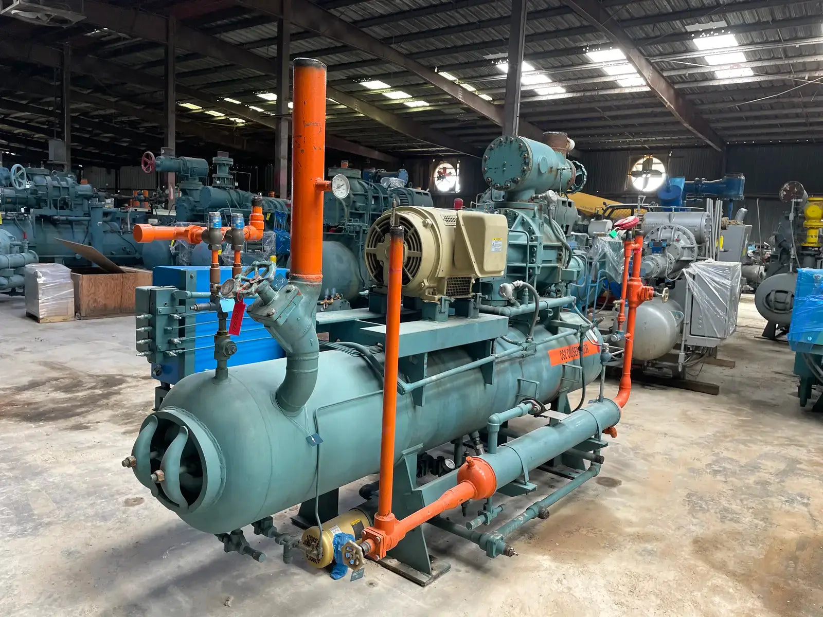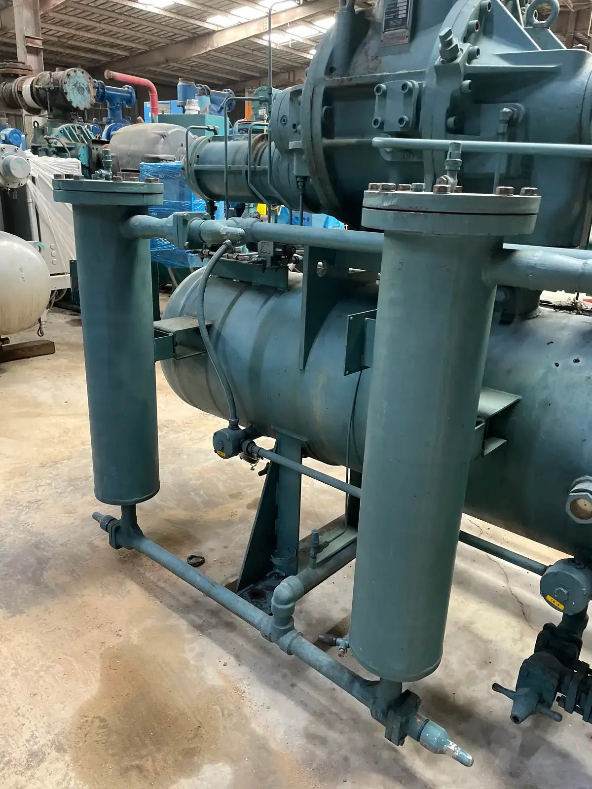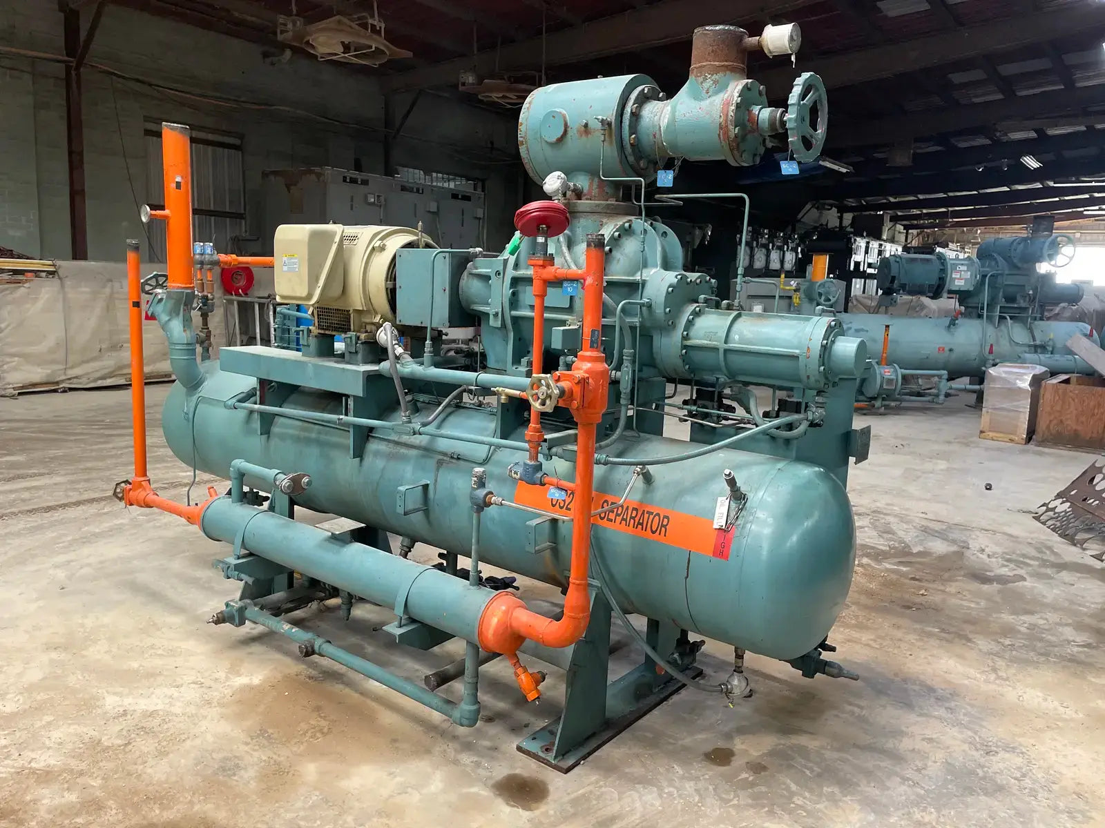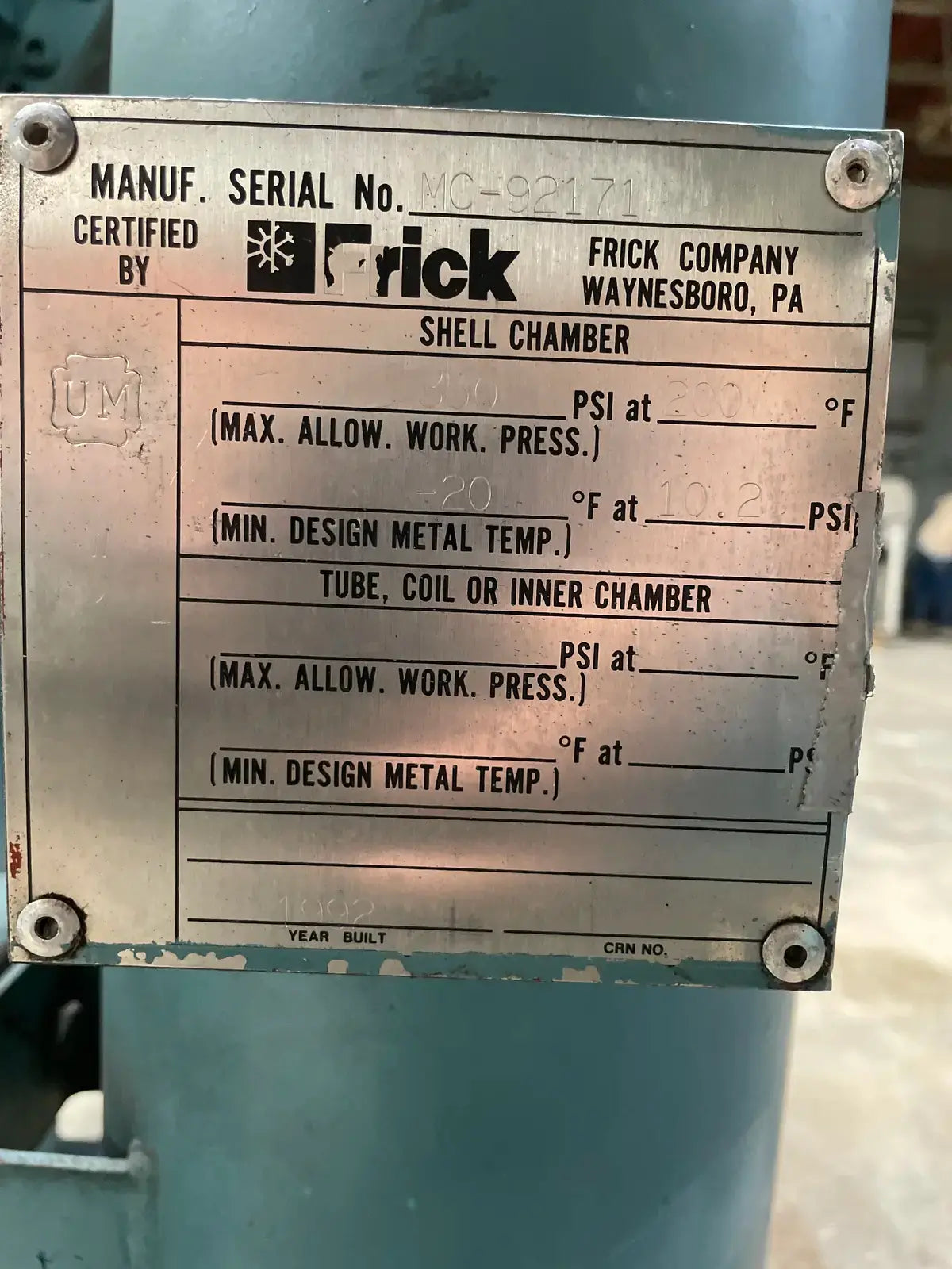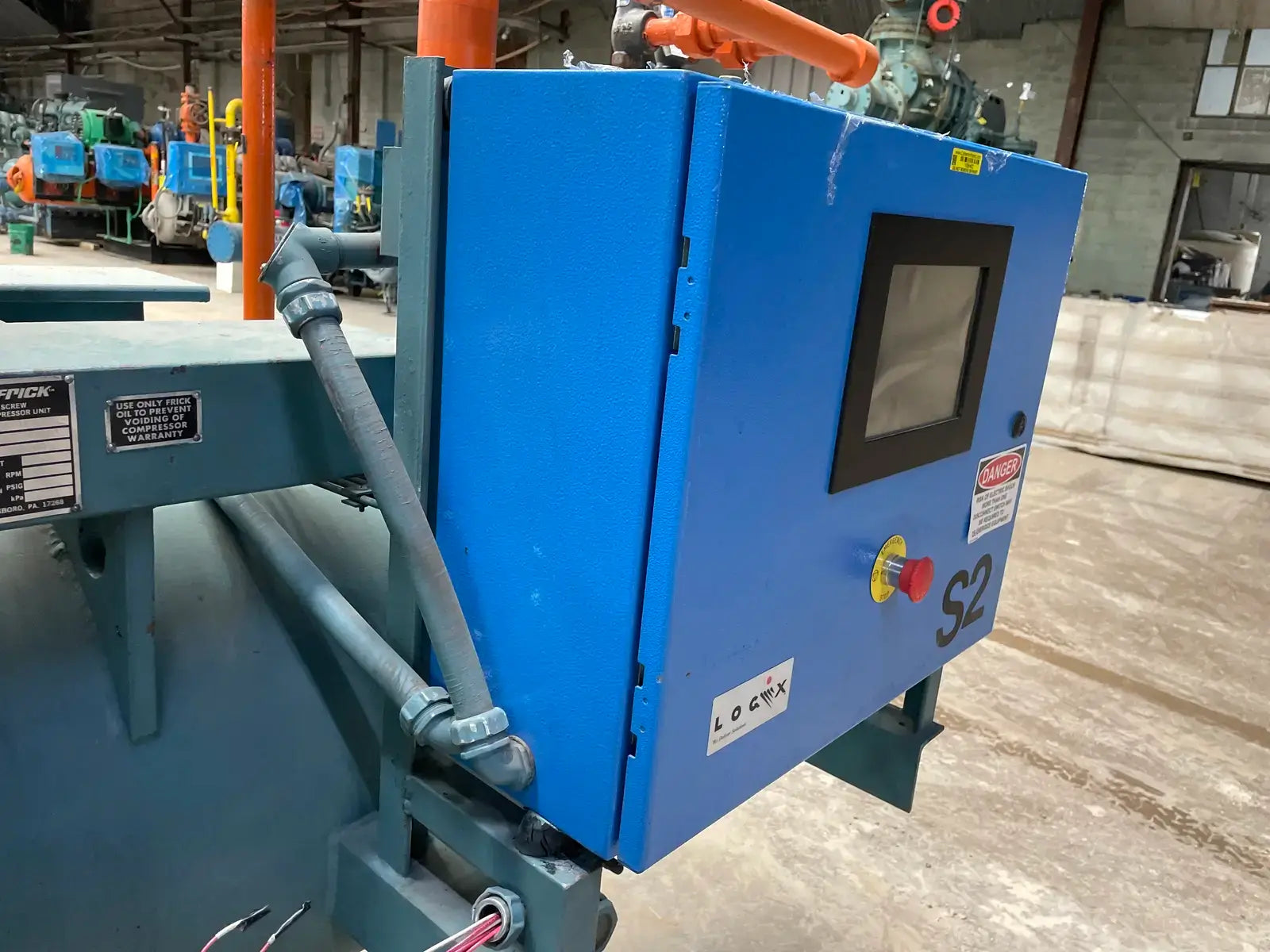 Frick Rotary Screw Compressor Package: Model: RWB-II-134, Serial No: S0492LFMFTHAA3, Max Design Pressure: 300 PSIG. Frick Sales Order: 280634-04, Refrigerant: R717, Max Speed: 3600. Frick Bare Screw Compressor: Model: TDSH193L, Serial No: 1707D, Refrigerant: NH3/R22, Volume Ratio: 2.2-5.0, Max Speed RPM: 4500, Max Design Pressure: 363 PSIG. Certified by Frick Oil Separator: National Board: 102819, MAWP: 300 PSI @ 200 F, MDMT: -20 F @ 10.2 PSI. Logix U.L. Industrial Control Panel: 115 VAC, 60 HZ, 26 Amps Max.