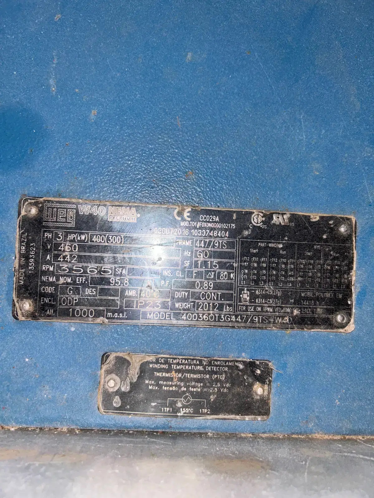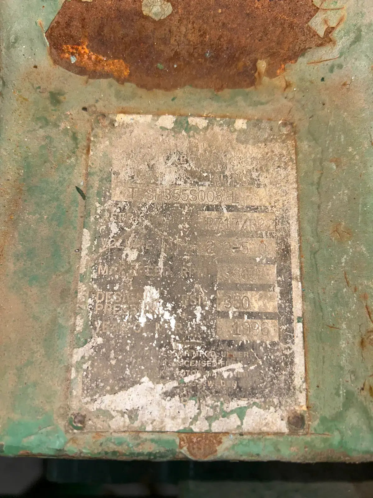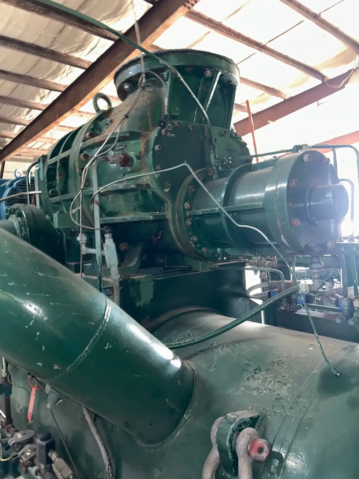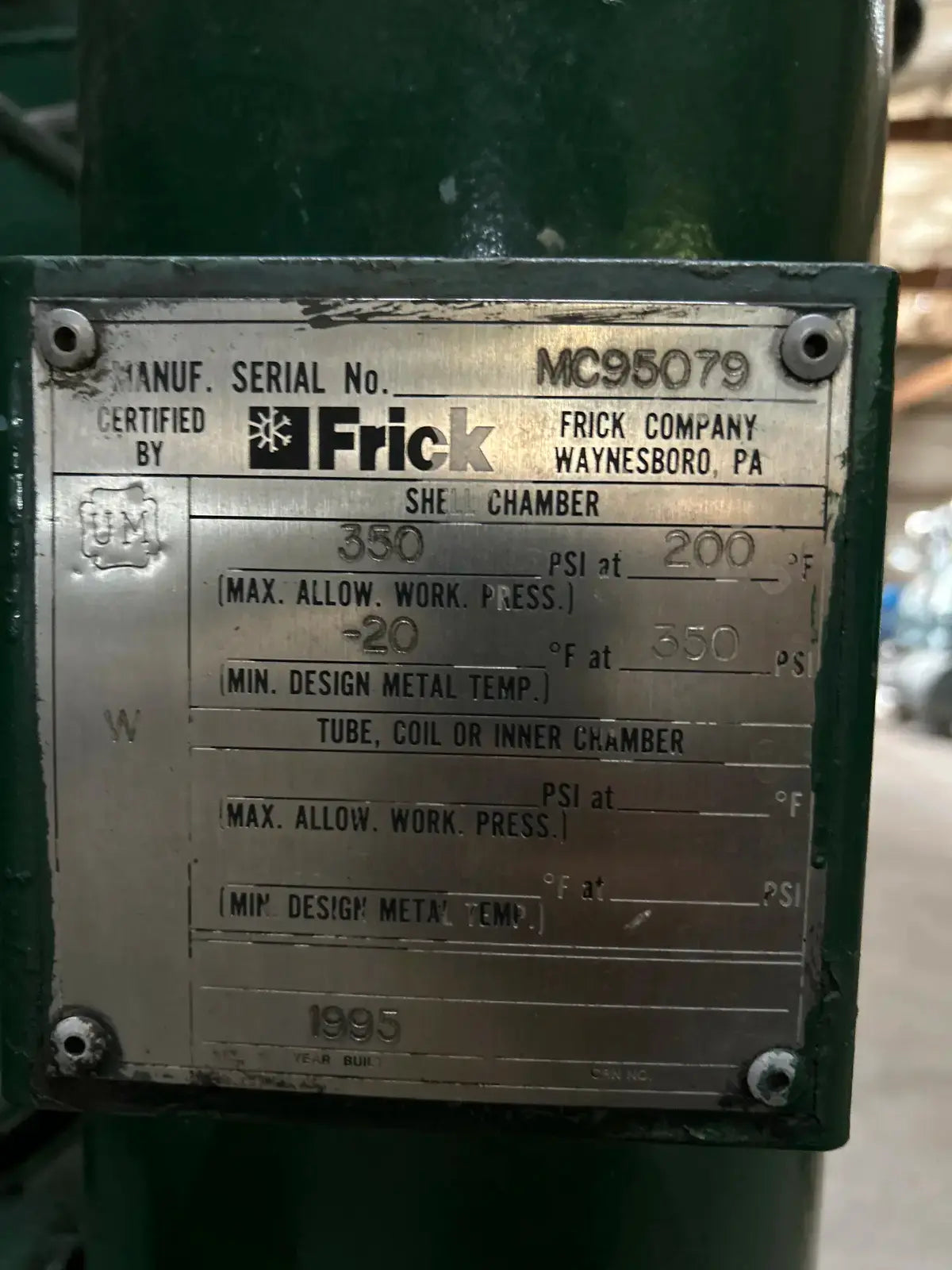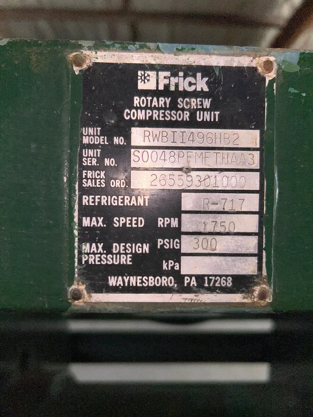 Frick Ammonia Rotary Screw Compressor Package. Frick Package: Unit Model: RWB-II-496HB2, Serial No: S0048PFMFTHAA3, Frick Sales Order: 26559301000, Refrigerant: R-717, Max Speed: 1750 RPM, Max Design Pressure: 300 PSIG. Frick Bare Screw Compressor: Model: TDSH355S, Serial No: 0089L, Refrigerant: R717/R22, Volume: 2.2-5.0, Max Speed: 3600 RPM, Design Pressure: 350 PSIG. Rebuilt By American Refrigeration on 2016. Job No: 17601. Certified by Frick Oil Separator - National Board: 125170, MAWP: 300 PSI @ 200 F. MDMT: -20 F @ 300 PSI.