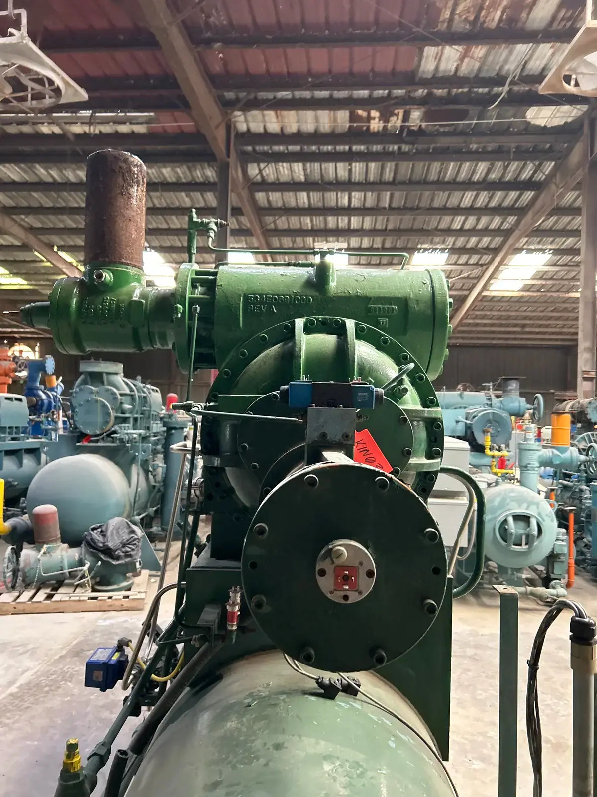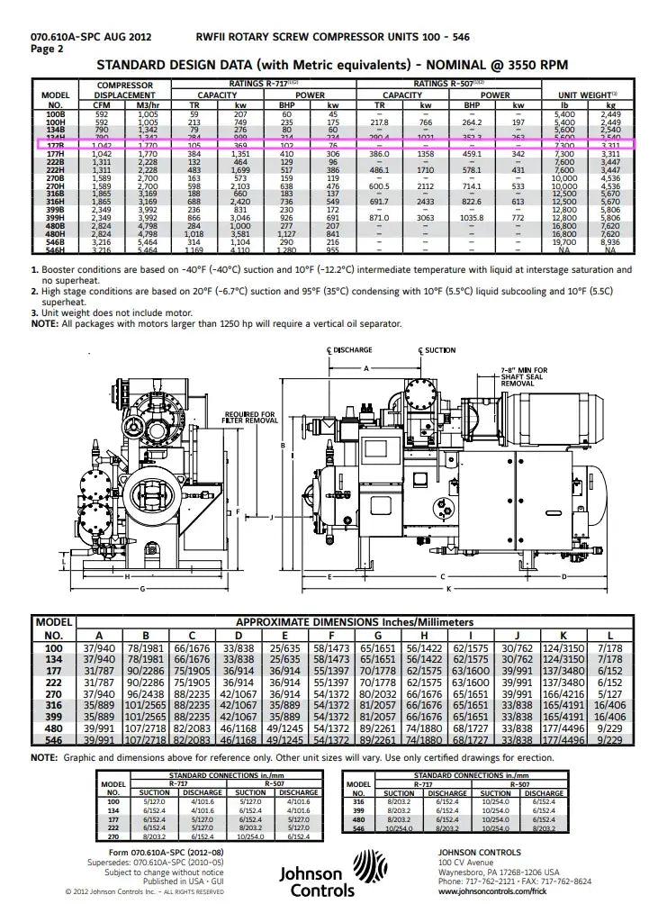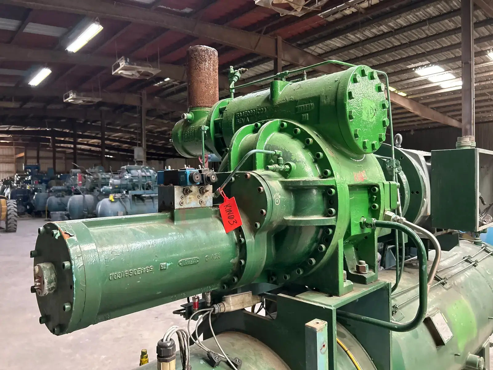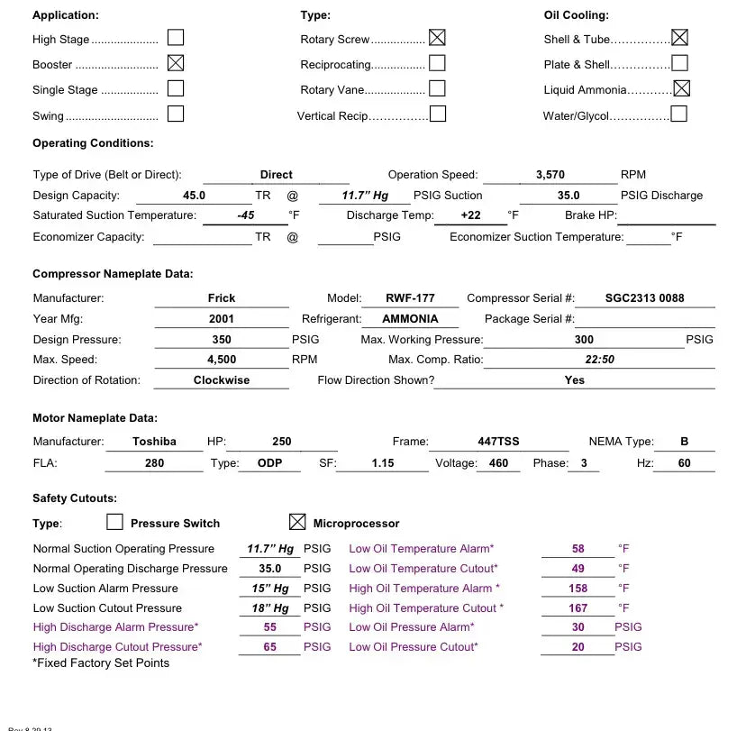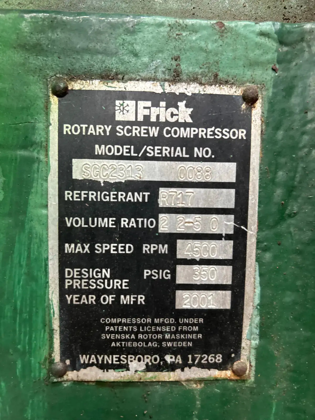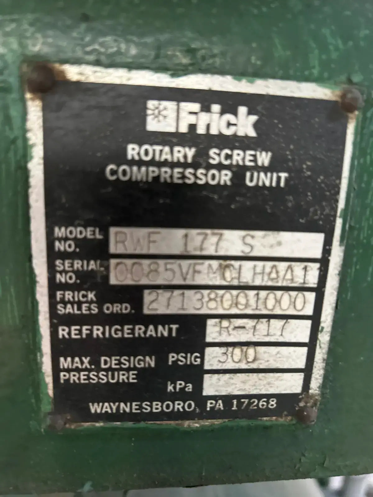 Frick RWF-177-S Rotary Screw Compressor Package. Model: RWF-177-S. Serial No: F0085VFMCLHAA11. Frick Sales Order: 27138001000. Refrigerant: R-717. Max Design Pressure: 300 PSIG. FricK Rotary Bare Screw Compressor: Model: SGC2313. Serial No: 0088. Refrigerant: R-717. Volume Ratio: 2.2-5.0. Max Speed: 4500 RPM. Design Pressure: 350 PSIG. Year of Mfr: 2001. Certified by Frick Oil Separator: National Board: 144522, MAWP: 300 PSI @ 250 F, MDMT: -20 F @ 300 PSI.