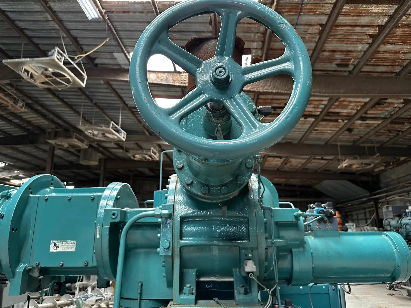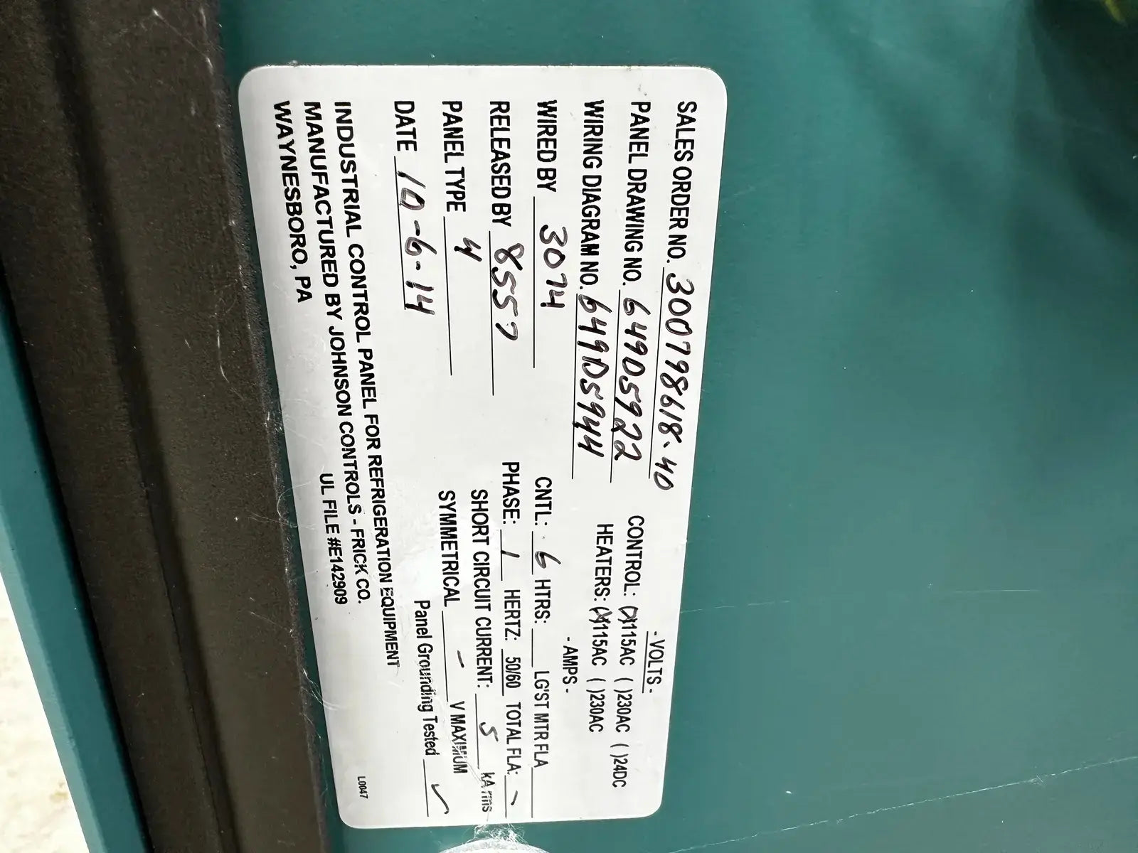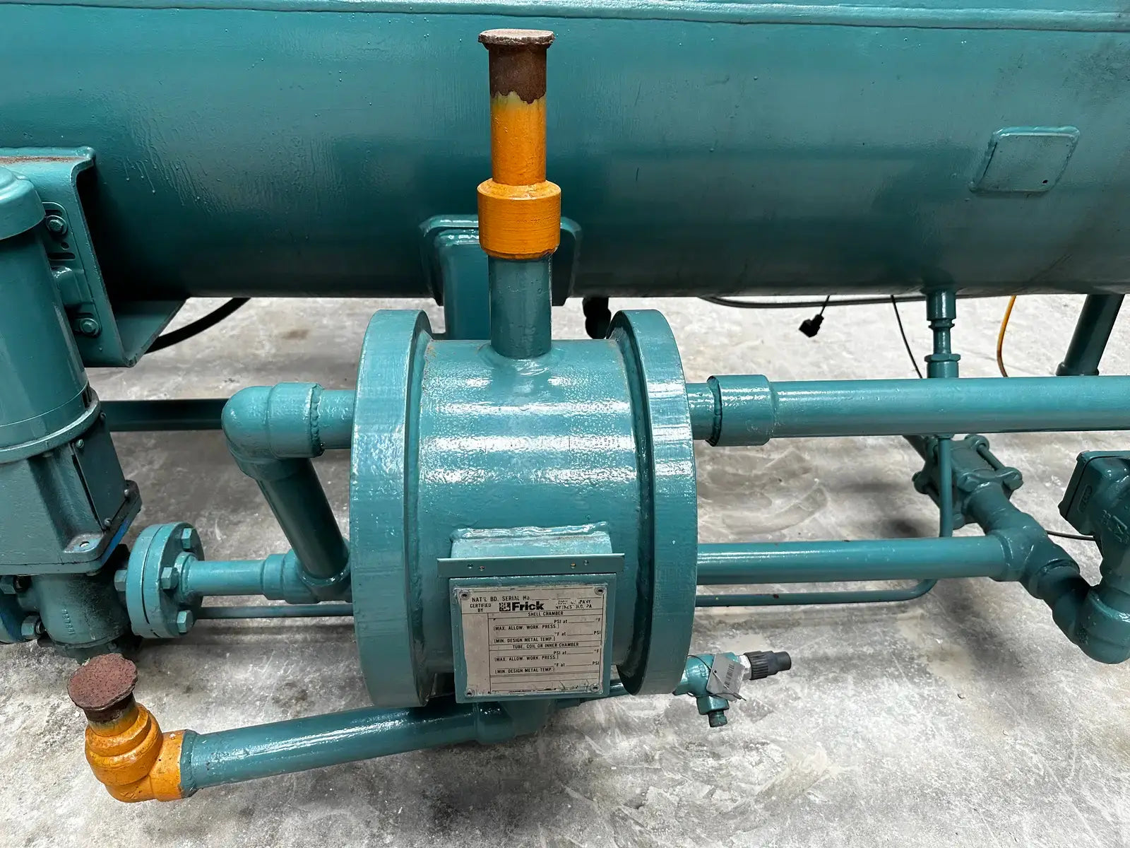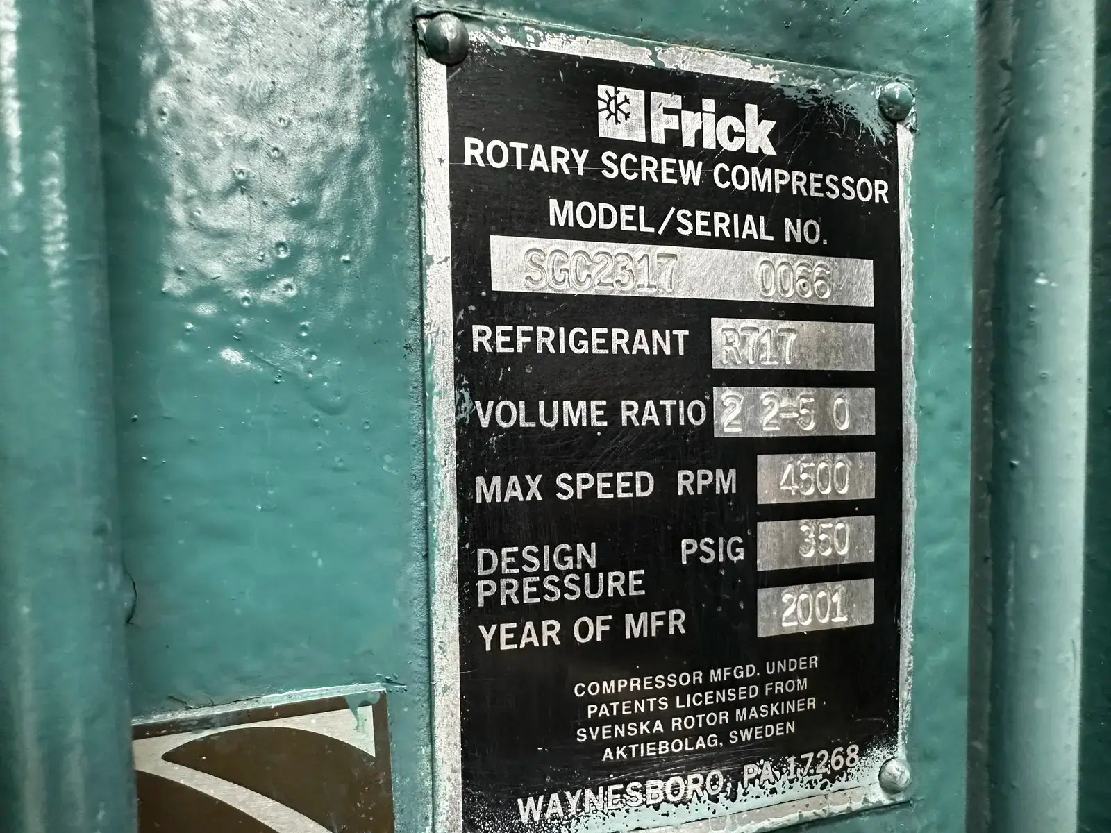 Frick Rotary Screw Compressor Package. Model No: RWF-222 B. Serial No: F0064VFMCTHGA03. Frick Sales Order: 2712690400. Refrigerant: R-717. Max Design Pressure: 300 PSIG. Rotary Screw Compressor: Model: SGC2317. Serial No: 0066. Refrigerant: R-717. Volume Ratio: 2.2-5.0. Max Speed RPM: 4500. Design Pressure: 350 PSIG. Year of Mfr: 2001. Frick Quantum HD Control Panel.