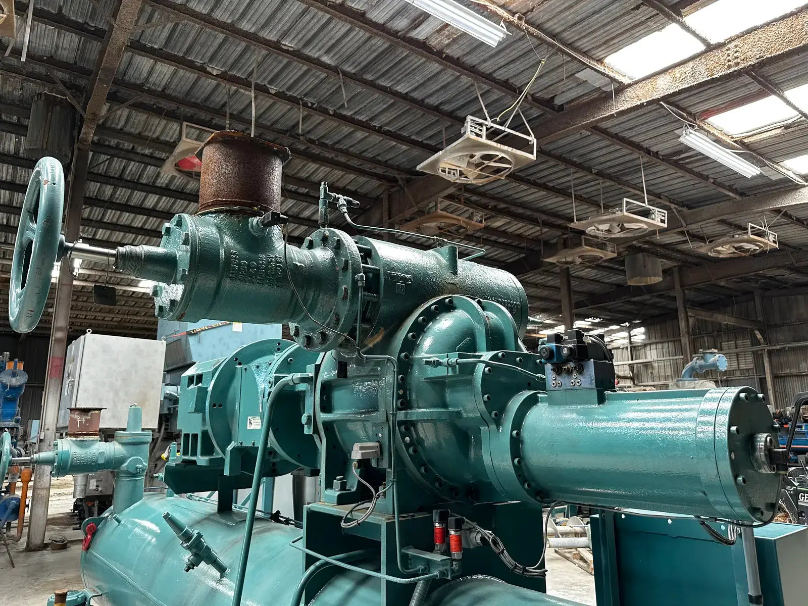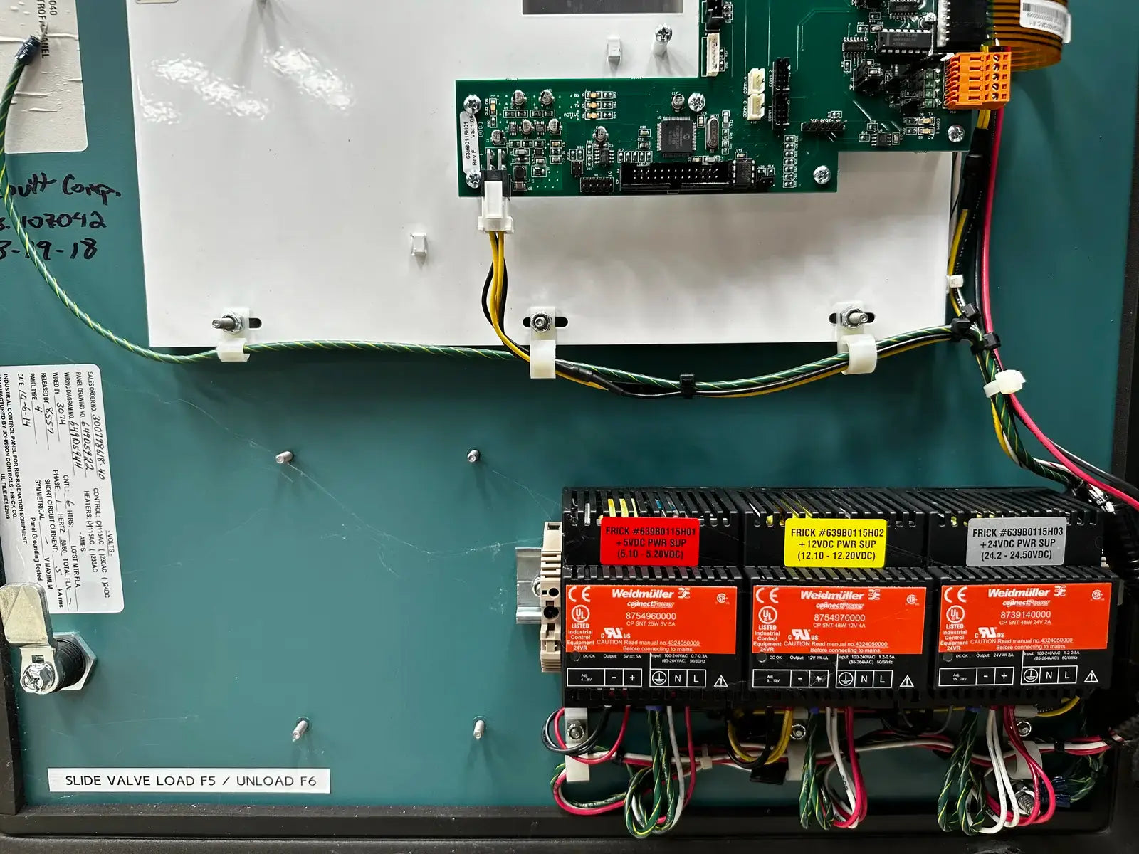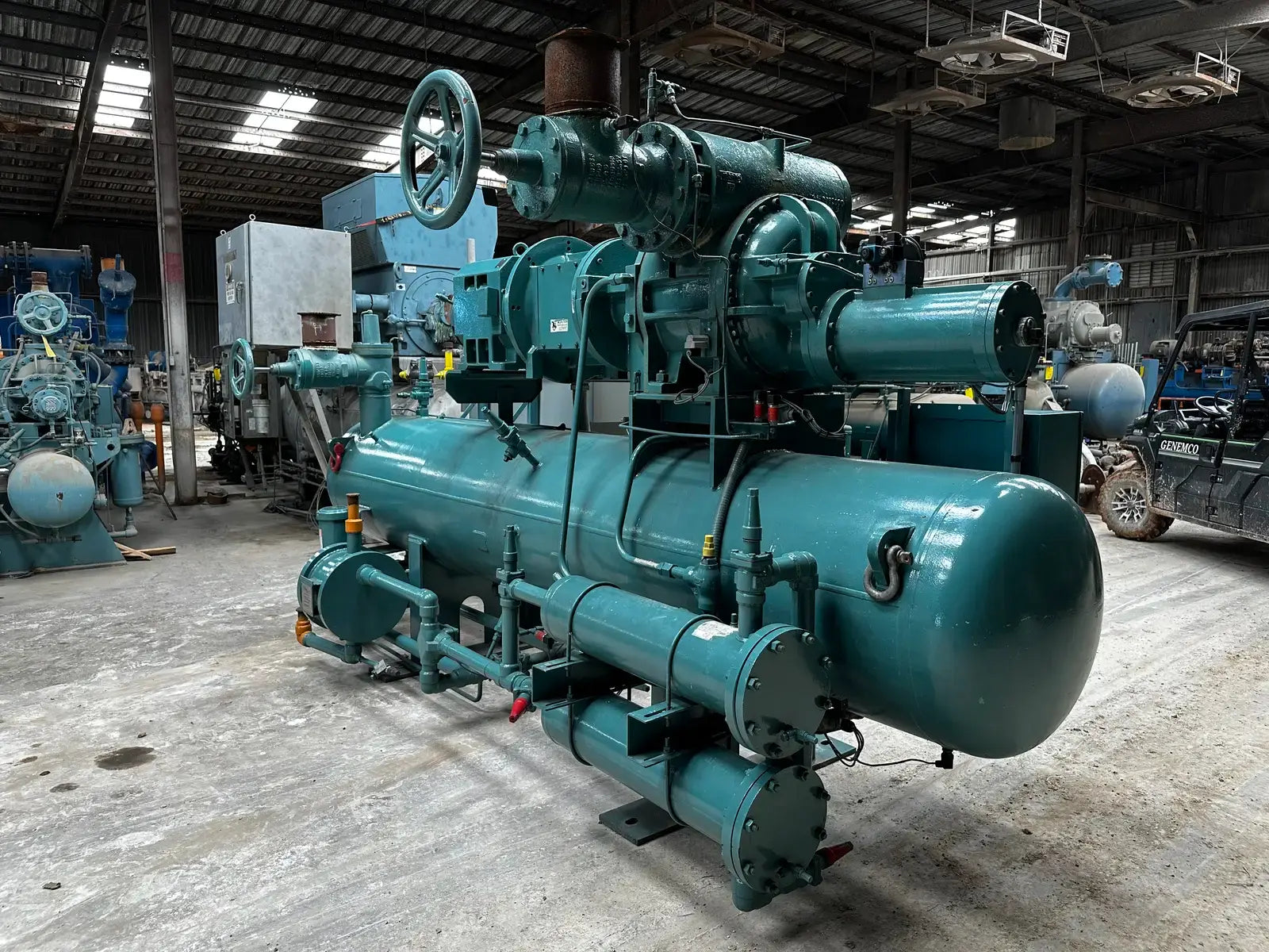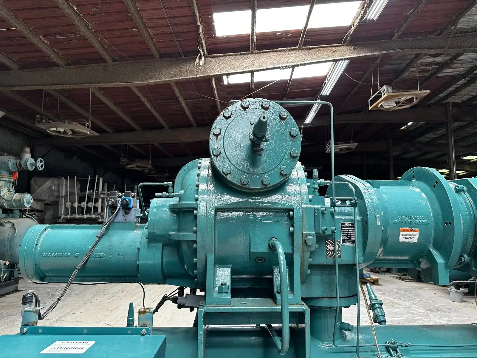 Frick Rotary Screw Compressor Package. Model No: RWF-222 B. Serial No: F0064VFMCTHGA03. Frick Sales Order: 2712690400. Refrigerant: R-717. Max Design Pressure: 300 PSIG. Rotary Screw Compressor: Model: SGC2317. Serial No: 0066. Refrigerant: R-717. Volume Ratio: 2.2-5.0. Max Speed RPM: 4500. Design Pressure: 350 PSIG. Year of Mfr: 2001. Frick Quantum HD Control Panel.