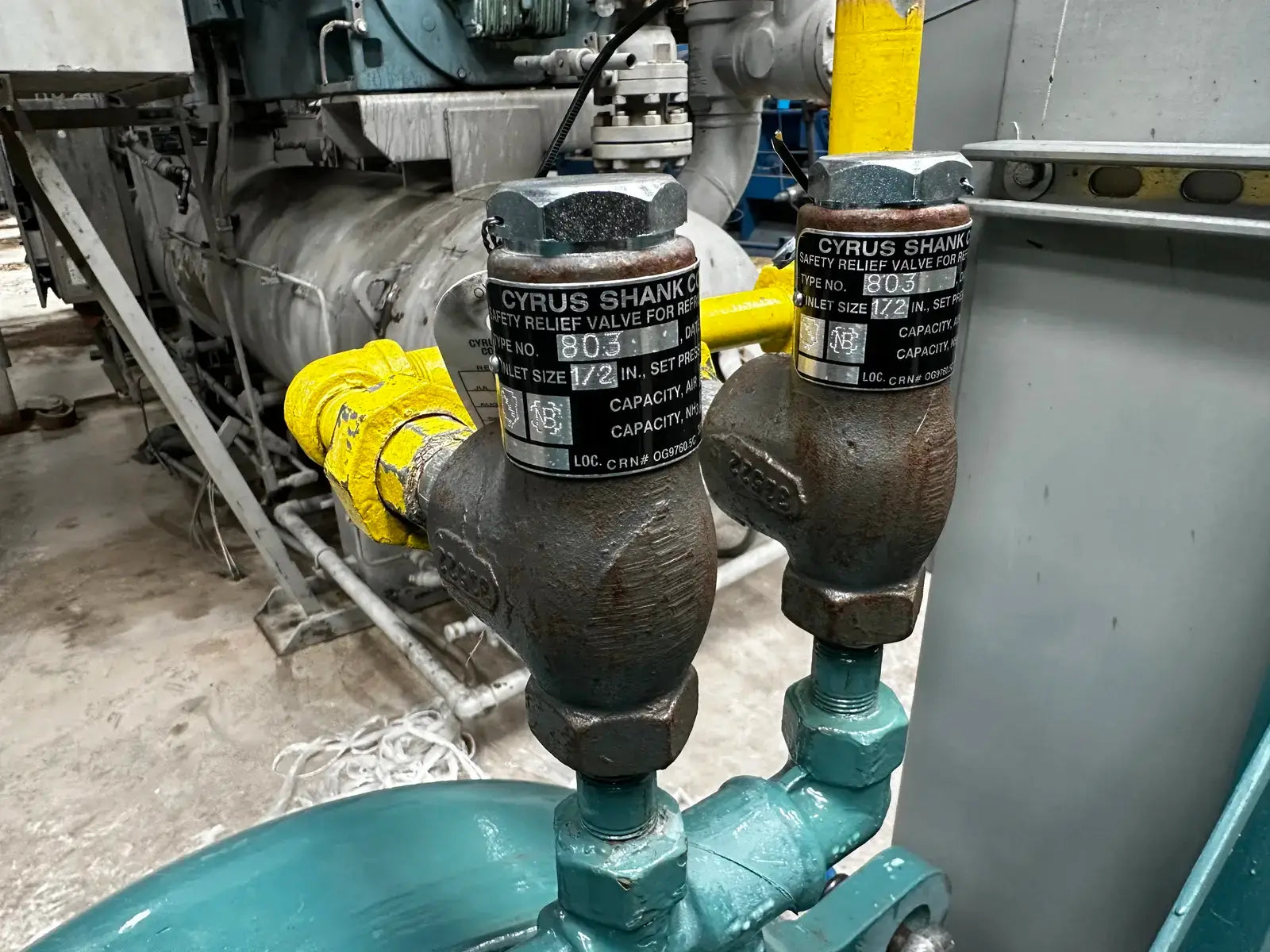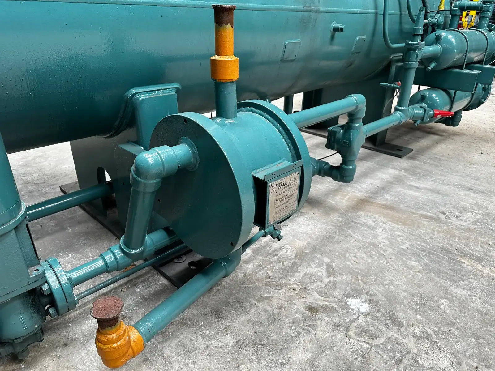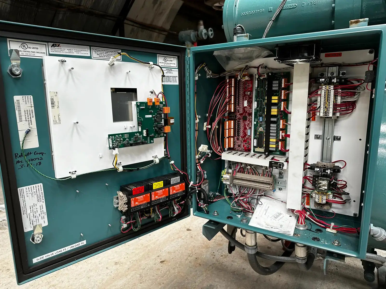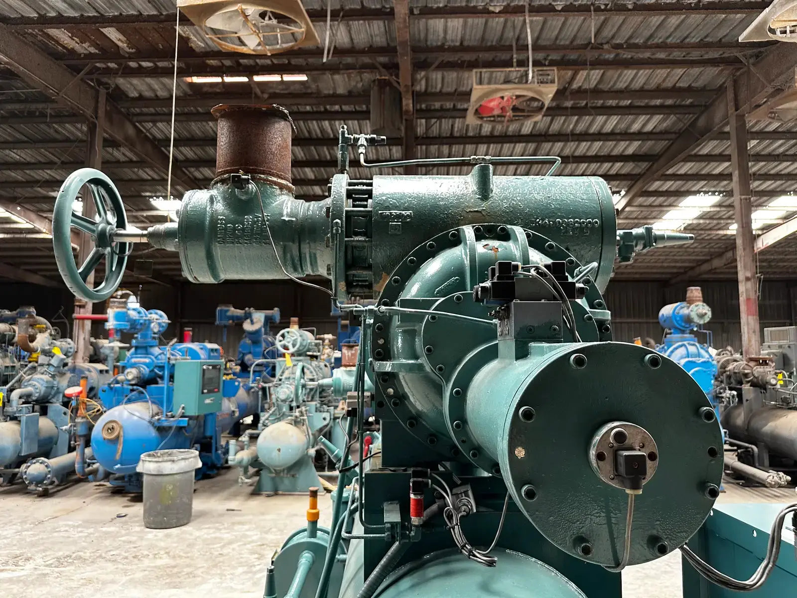 Frick Rotary Screw Compressor Package. Model No: RWF-222 B. Serial No: F0064VFMCTHGA03. Frick Sales Order: 2712690400. Refrigerant: R-717. Max Design Pressure: 300 PSIG. Rotary Screw Compressor: Model: SGC2317. Serial No: 0066. Refrigerant: R-717. Volume Ratio: 2.2-5.0. Max Speed RPM: 4500. Design Pressure: 350 PSIG. Year of Mfr: 2001. Frick Quantum HD Control Panel.