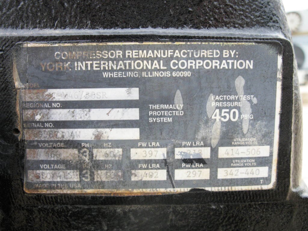 York Bare 6-Cylinder Semi-Hermetic Compressor (460 V) 460 V, 60 Hz, 3 Phase. Overall dimensions: 3 ft. 6 in. L x 2 ft. 1 in. W x 2 ft. ½ in. H.(H15).
