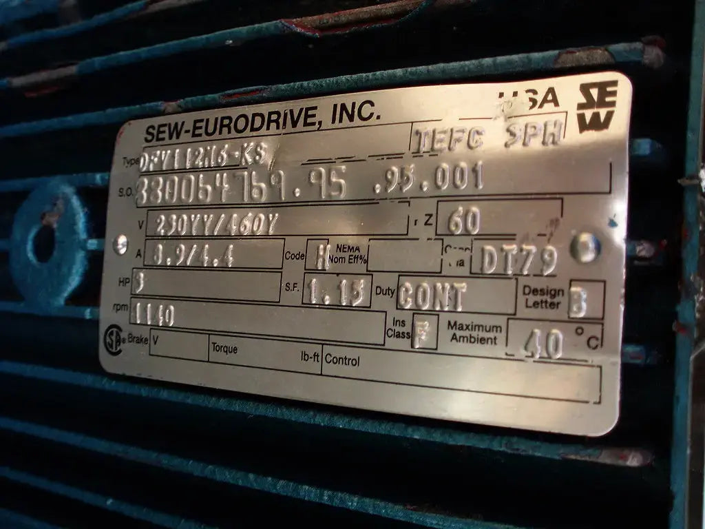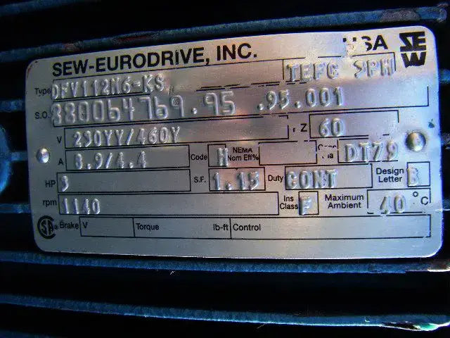 Motor SEW-Euro Drive-3 HP. Tipo: DFV112N6-KS. SO N° 880064769.95.95.001. Especificaciones del motor: 1140 rpm, 230/460 V, 8,9/4,4 amperios, 60 Hz, trifásico. Clase de aislamiento: F. Diseño Nema: B. Diámetro del eje: 1 pulg. Dimensiones totales: 1 pie 2 pulg. de diámetro. x 1 pie 1 pulgada de alto (ACN6)