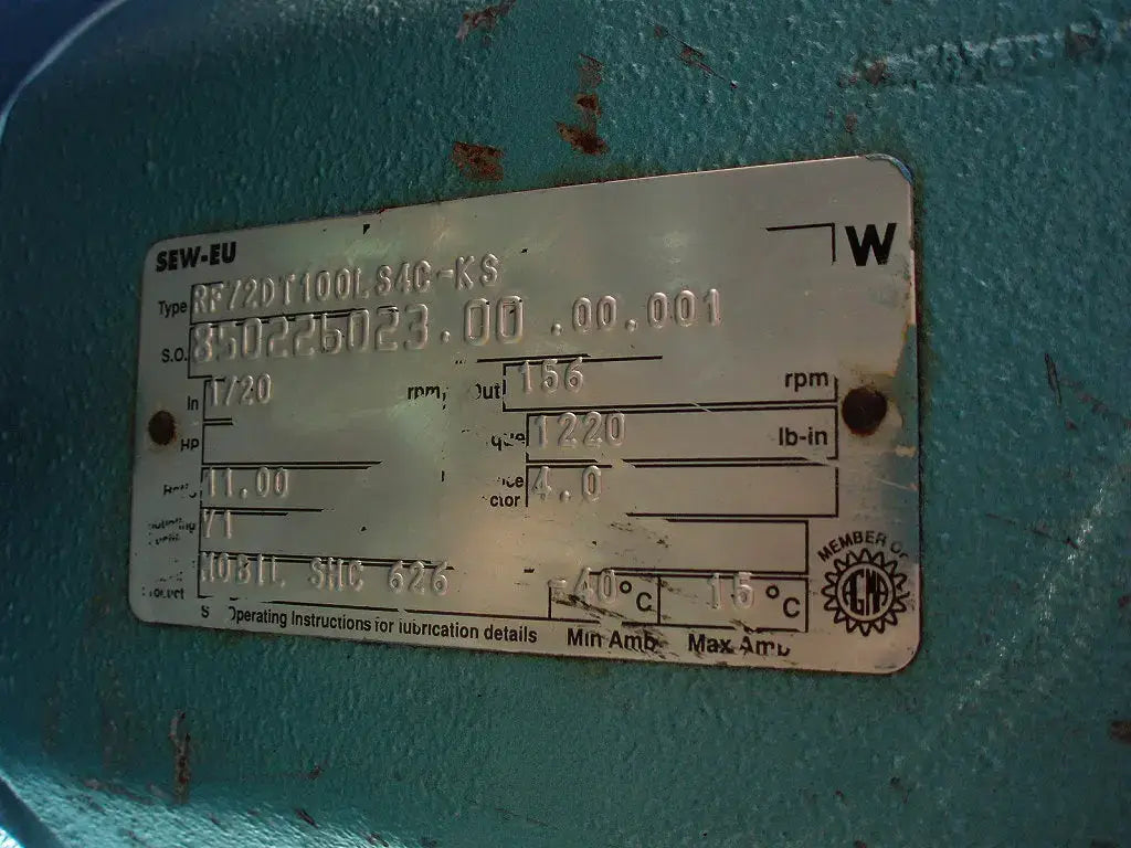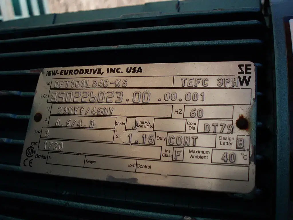 Motor de accionamiento SEW-Euro -3 HP. Tipo: DFT100LS4C-KS. SO N° 850226023.00.00.001. Especificaciones del motor: 1720 rpm, 230/460 V, 8,9/4,3 amperios, 60 Hz, trifásico. Eurodrive, relación: 11, rpm fuera: 156 (final), torque: 1220 lb-in. Clase de aislamiento: F. Diseño Nema: B. Diámetro del eje: 1 pulg. Dimensiones totales: 1 pie 4 pulg. de diámetro. x 1 pie 6 pulgadas de alto.