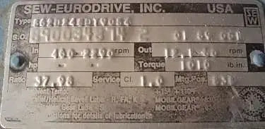 Reductor de velocidad variable de ángulo recto Sew-Eurodrive: 1,5 HP. Modelo: S6202480T9084. S/N: 890034874 2 01 89 001. Relación: 37,98. Revoluciones de entrada: 460-2290. Revoluciones de salida: 12,1/60. Posición de montaje: B3B. Diámetro del eje: Motor Sew-Eurodrive de 1-3/8 pulg., 1,5 hp, 460/2290 rpm, 230/460 V, 4,75/2,38 amperios, 60 Hz, trifásico. Dimensiones totales: 2 pies 5 pulgadas de largo x 12 pulgadas de ancho x 12 pulgadas de alto.