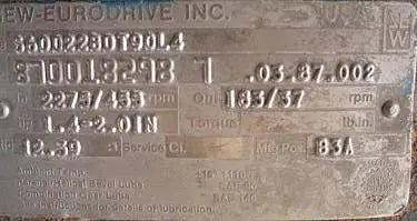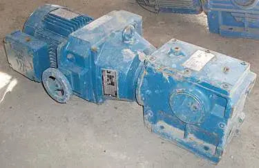 Reductor de velocidad variable de ángulo recto Sew-Eurodrive - 2 HP. Modelo: S6002280T90L4. S/N: 870018298 7 .03.87.002. Relación: 12,39. Revoluciones de entrada: 2275-455. Revoluciones de salida: 183/37. Posición de montaje: B3A. Diámetro del eje: Motor Sew-Eurodrive de 1-3/8 pulg., 2 hp, 1720 rpm, 230/460 V, 6,0/3,0 amperios, 60 Hz, trifásico. Dimensiones totales: 2 pies 4 pulgadas de largo x 1 pie 1-1/2 pulgadas de ancho x 12 pulgadas de alto.
