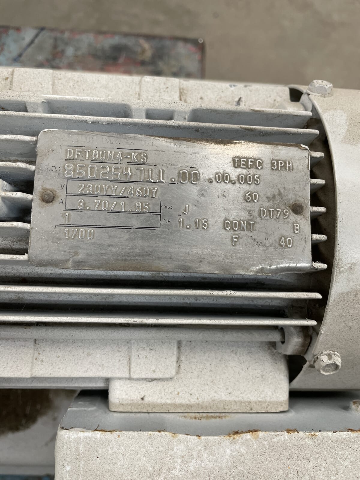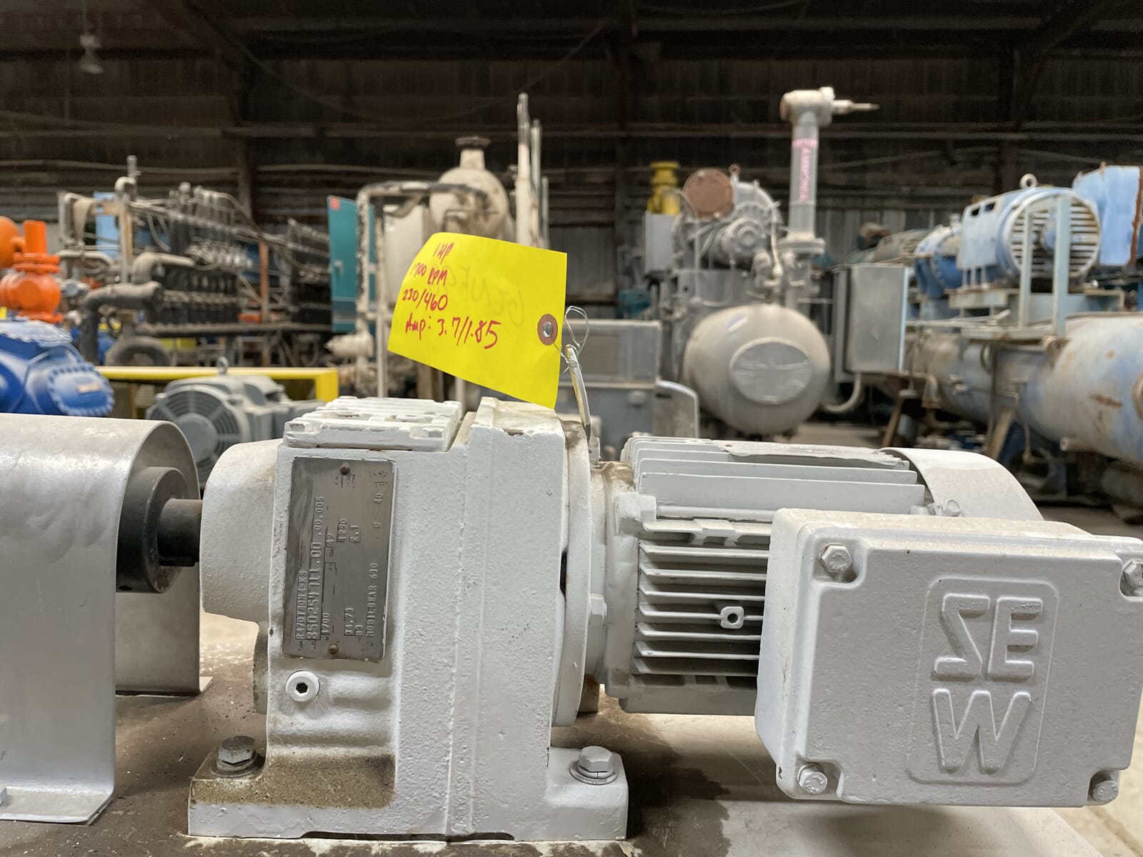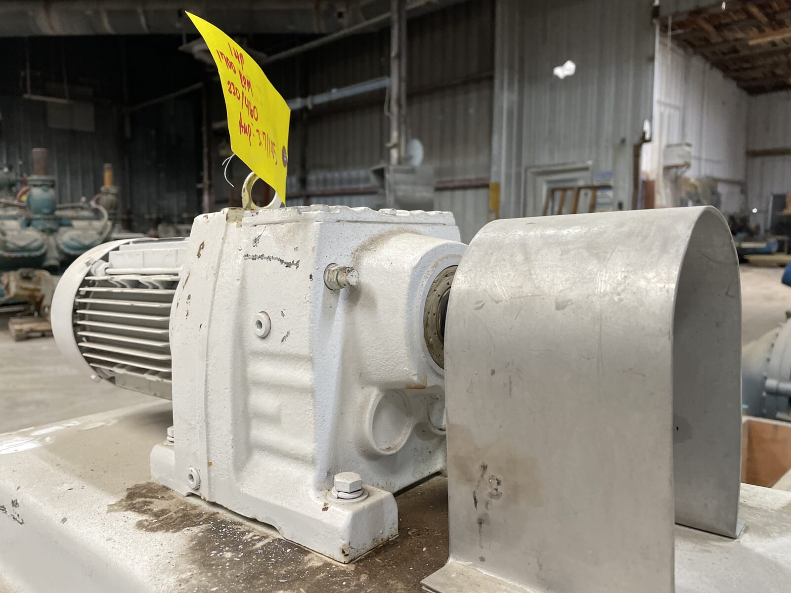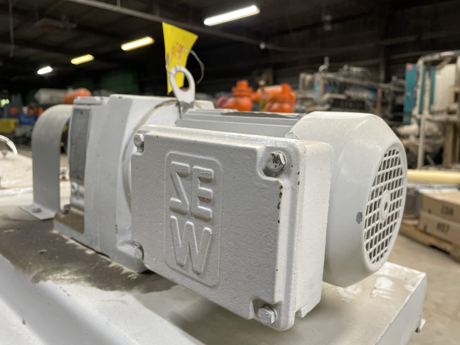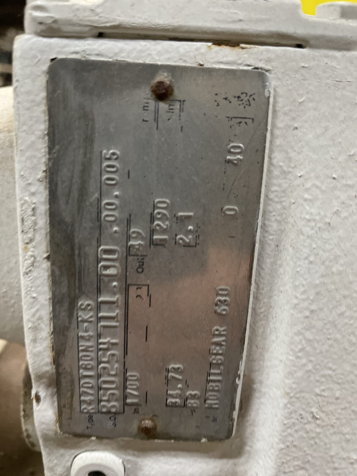 Motor de engranajes SEW EuroDrive - Tipo: R47DT80N4-KS, Serie: 850254711.00. RPM: En 1700 RPM, Fuera: 49 RPM. Relación: 34,73. Motor SEW - Modo: DFT80N45-KS, Número de serie: 850254711.00, Voltios: 230/460, Amperios: 3.7/1.8, HP: 1, RPM: 1700. El motor de engranajes se combinó con una bomba positiva que se vendió.