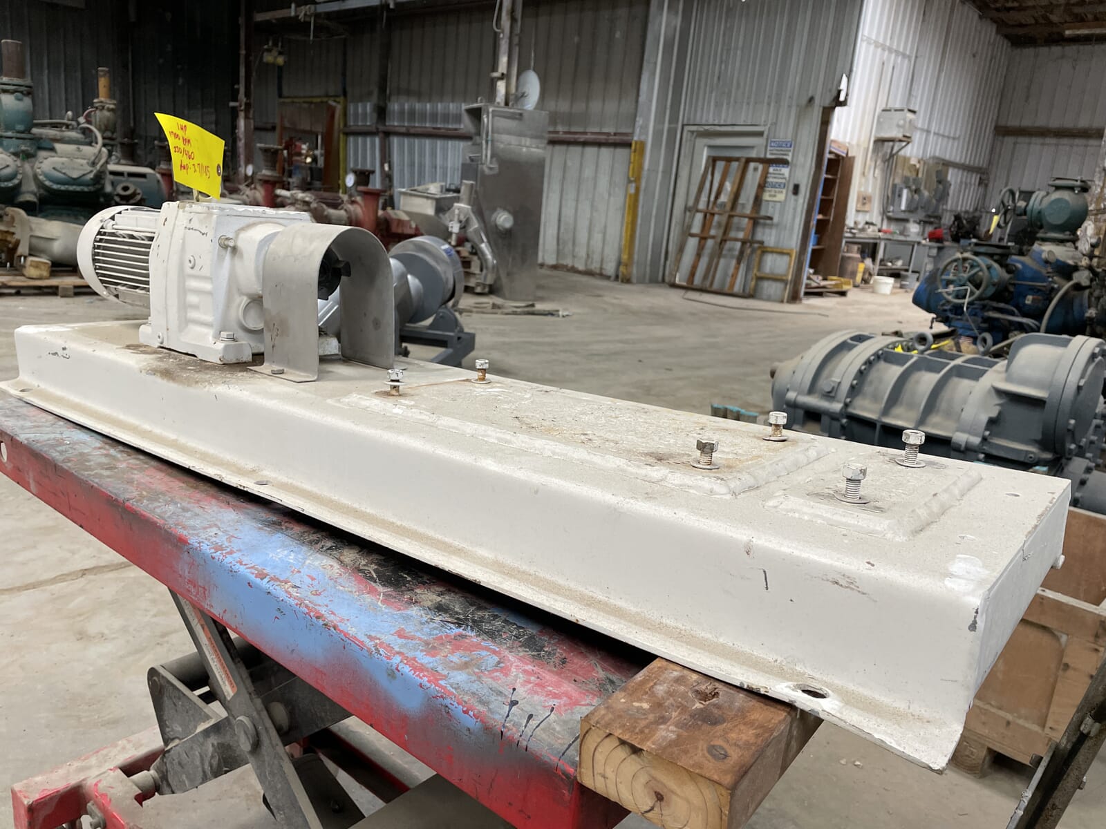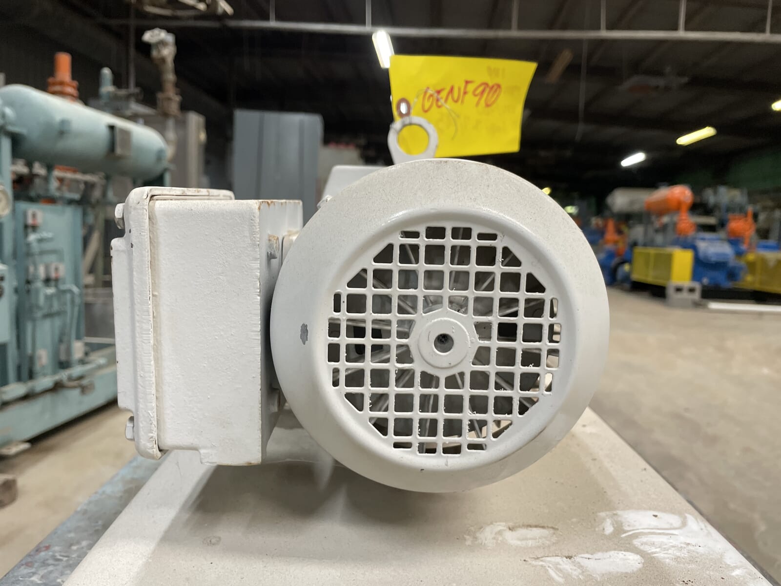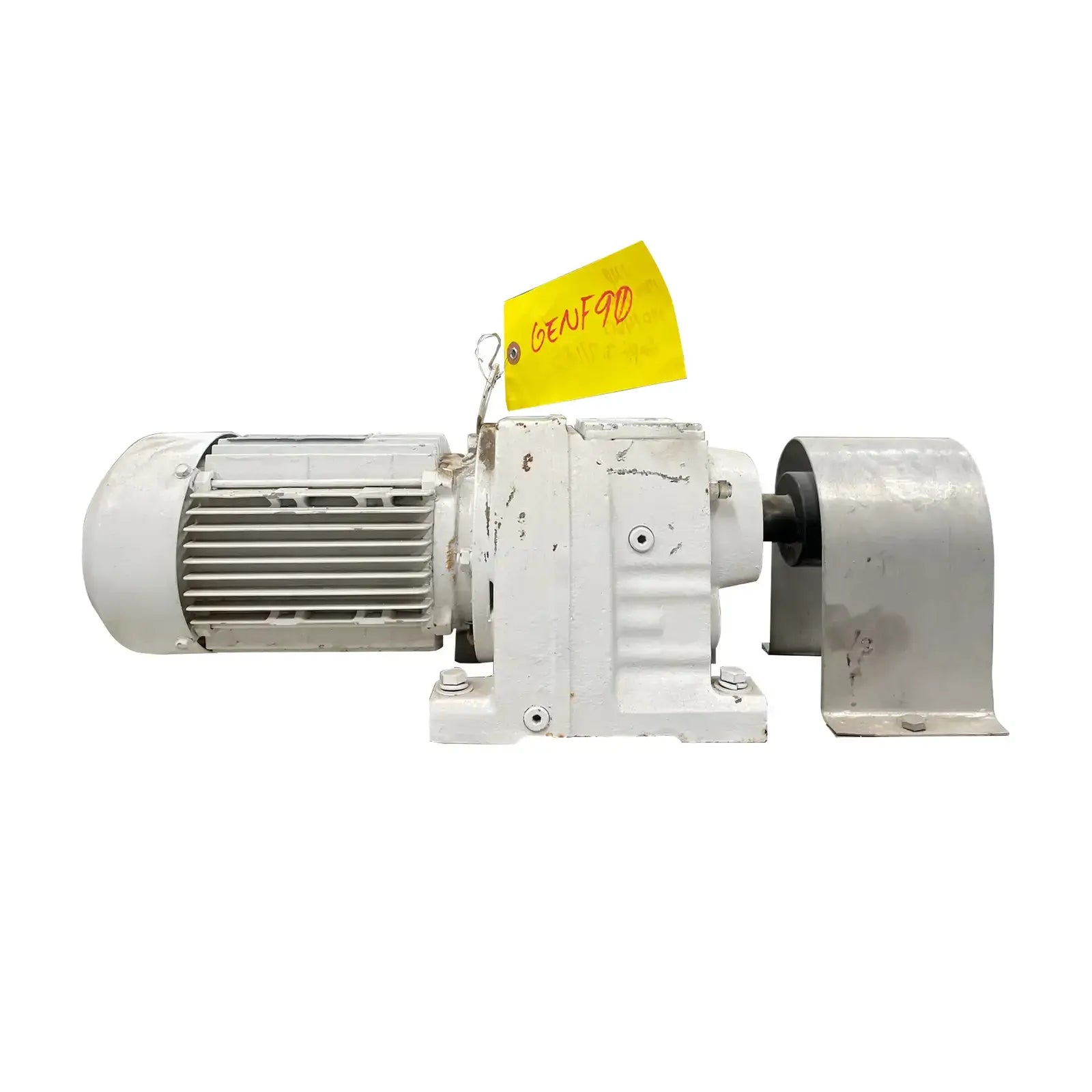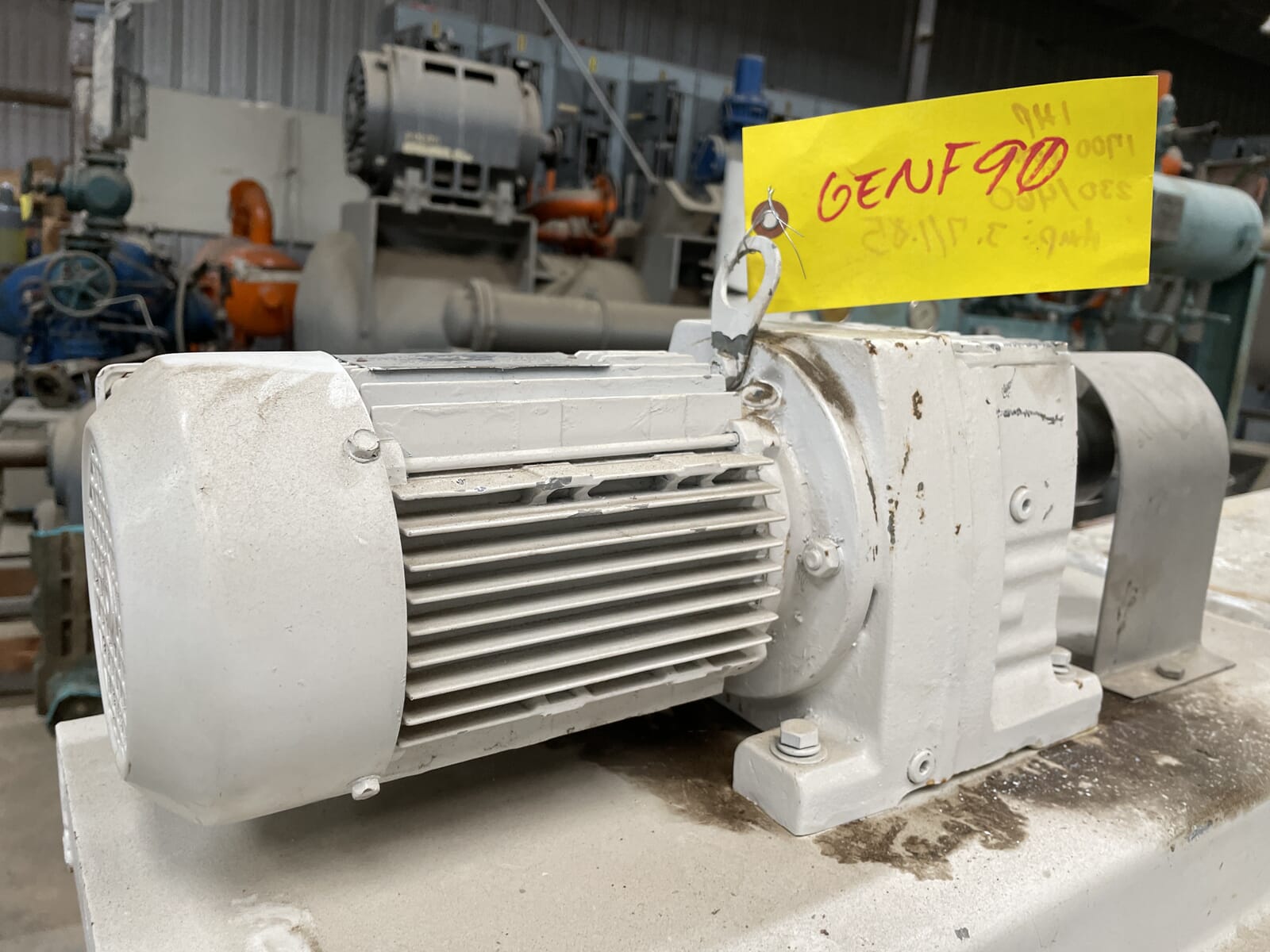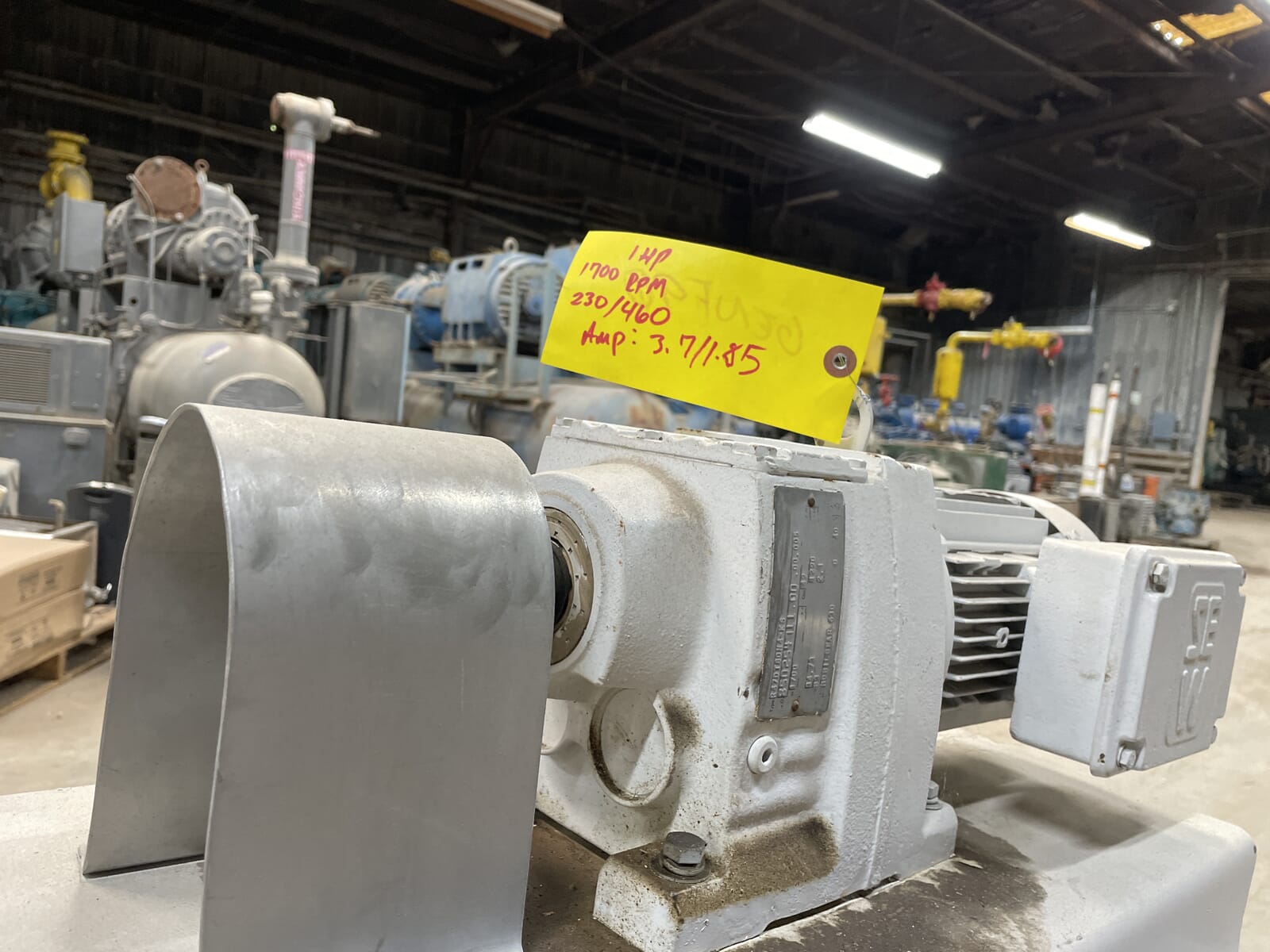Motor de engranajes SEW EuroDrive - Tipo: R47DT80N4-KS, Serie: 850254711.00. RPM: En 1700 RPM, Fuera: 49 RPM. Relación: 34,73. Motor SEW - Modo: DFT80N45-KS, Número de serie: 850254711.00, Voltios: 230/460, Amperios: 3.7/1.8, HP: 1, RPM: 1700. El motor de engranajes se combinó con una bomba positiva que se vendió.