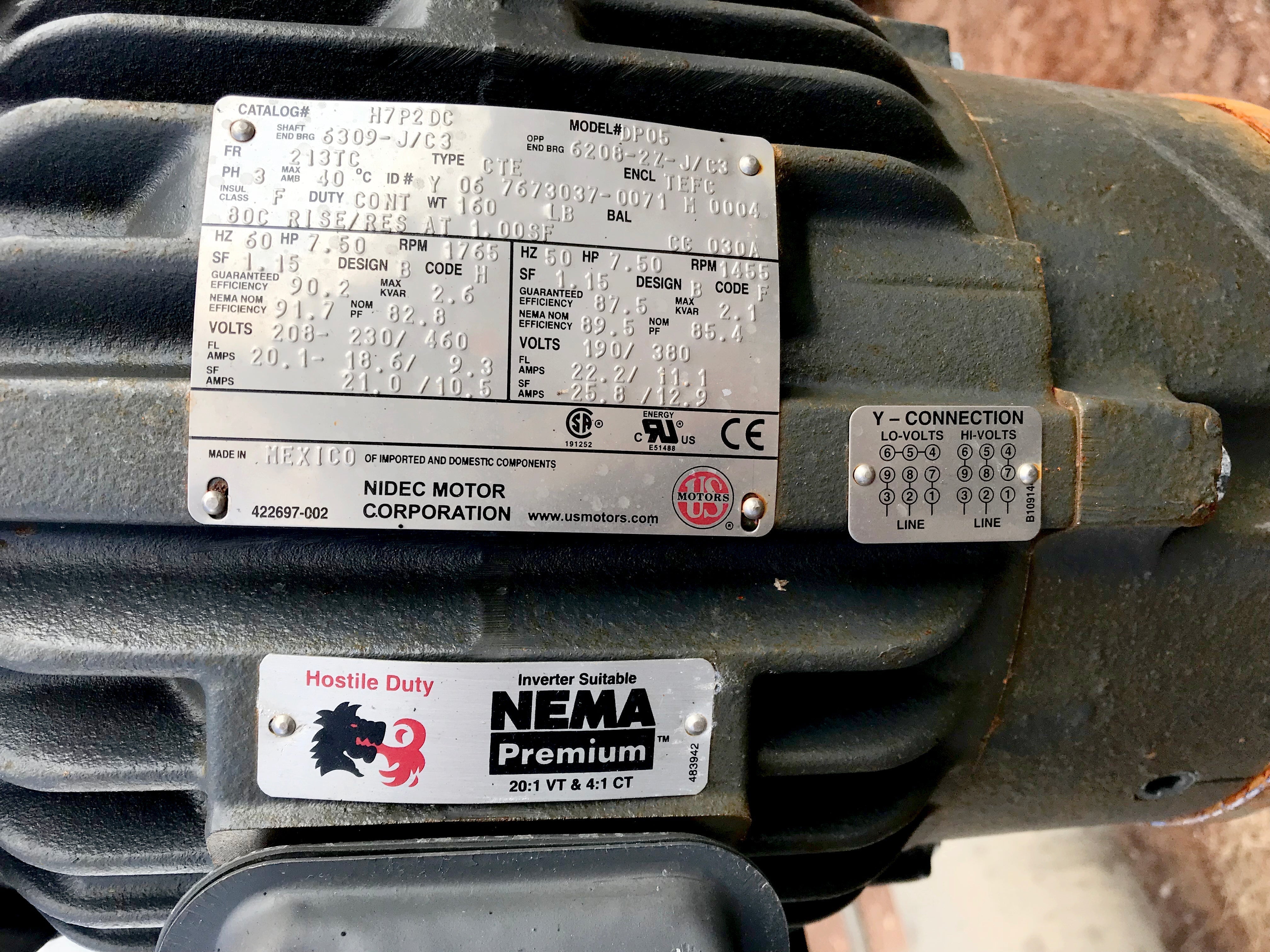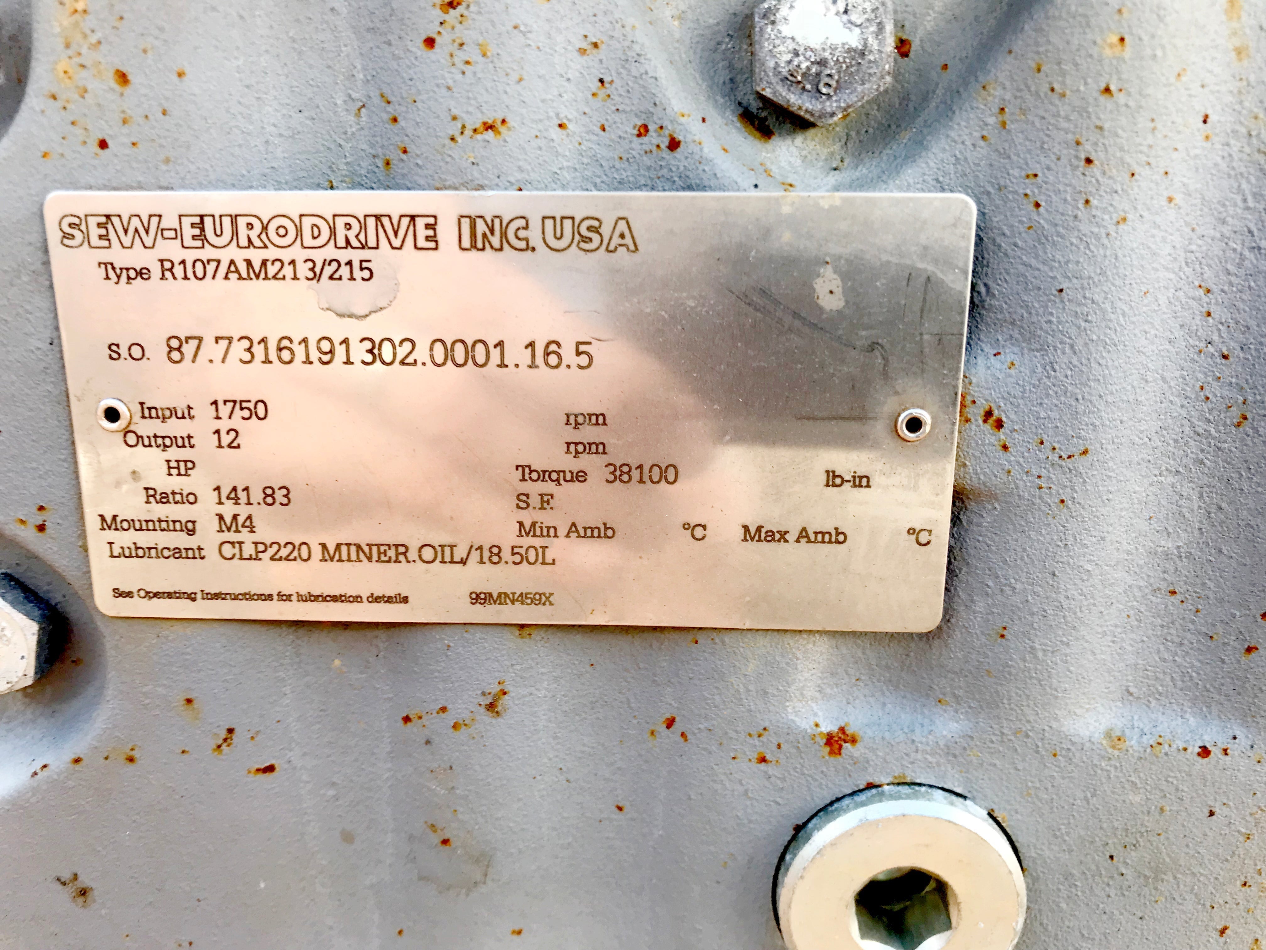 SEW-Eurodrive Inc. EE. UU. Tipo: R107AM213/215. SO: 87.7316191302.0001.16.5 Entrada: 1750 RPM. Salida: 12 RPM. Relación: 141,83. Montaje: M4. Torque: 38100. Motores de EE. UU.: 7,5 HP, 208-230/460 V, bastidor 213TF, TEFC, Interter de servicio hostil adecuado NEMA Premium. También clasificado para 50 Hz 190/380 V.