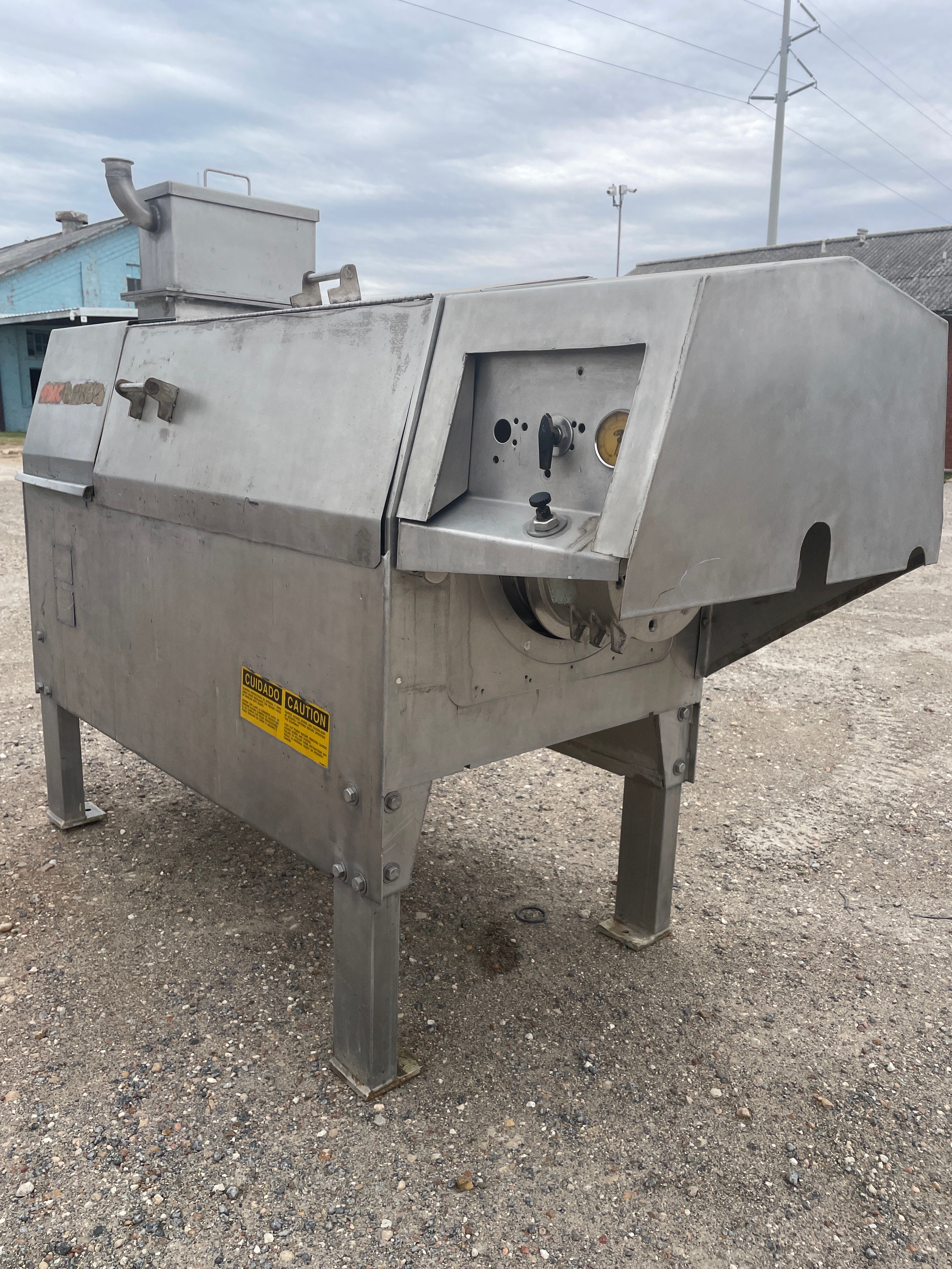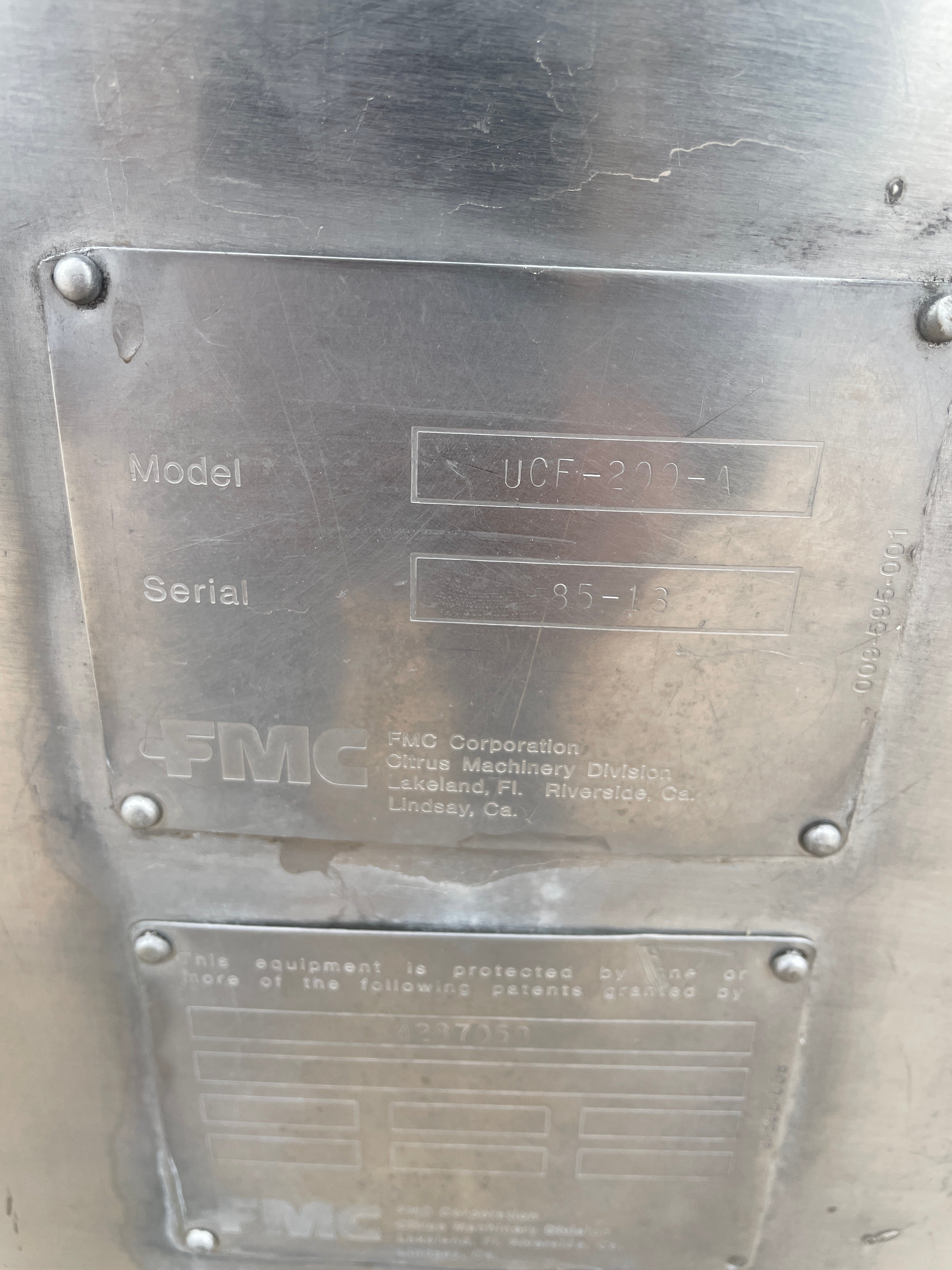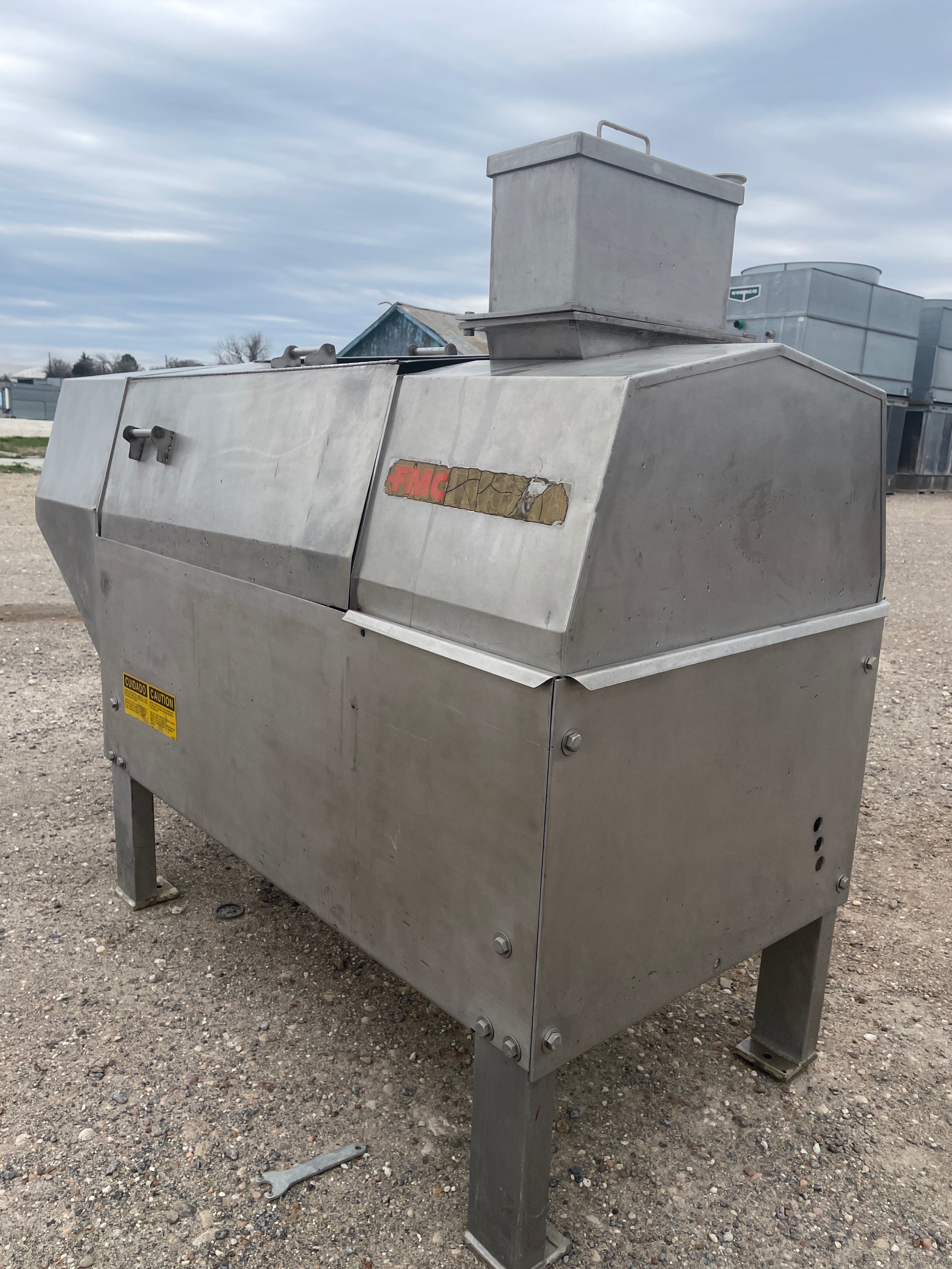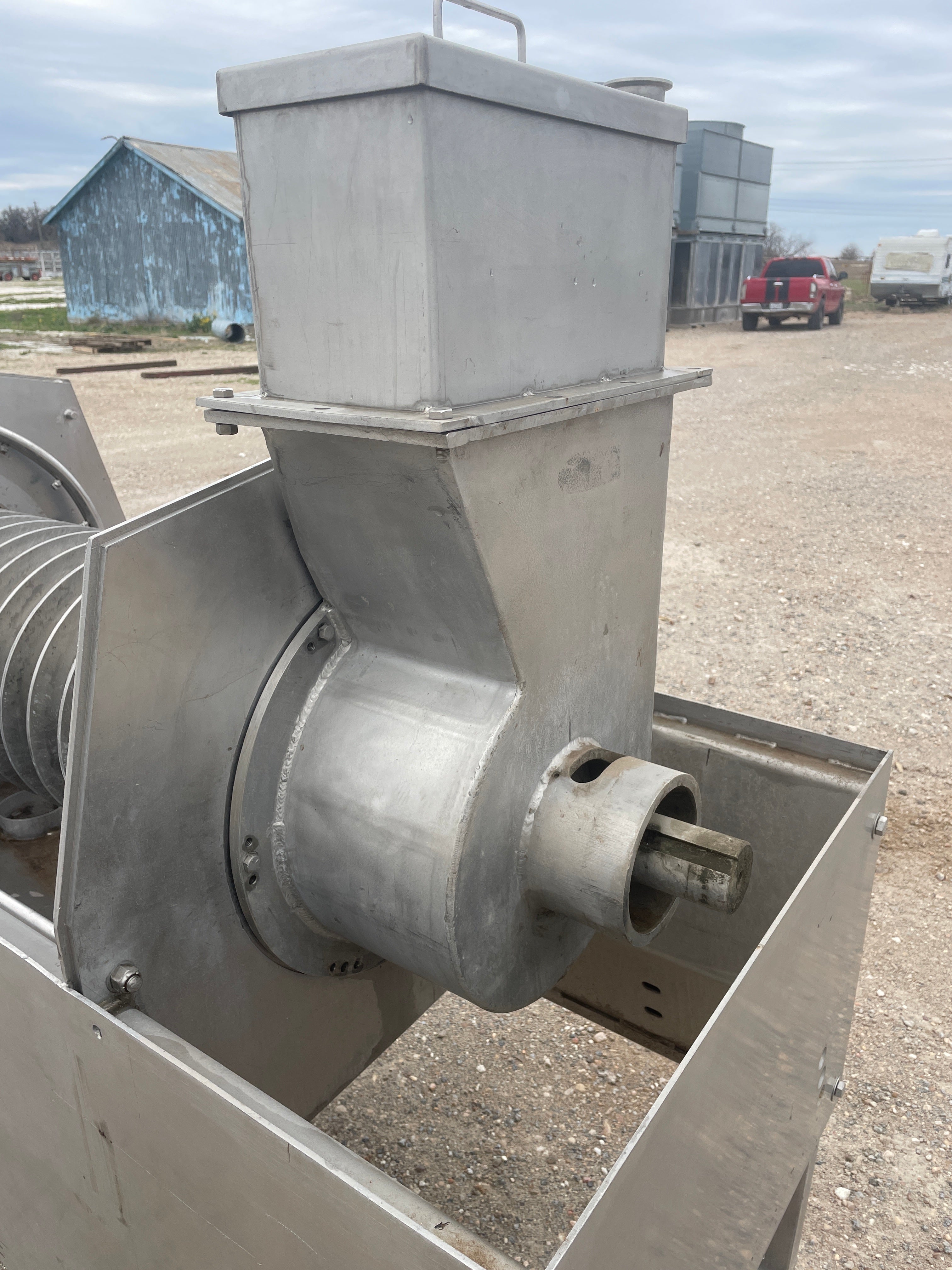 Acabadora de tornillos de acero inoxidable de FMC Technologies (JBT FoodTech). Modelo: UCF200A. Diámetro de la polea: impulsor de 7-3/8 pulgadas, impulsado de 25-1/2 pulgadas. Esta unidad tiene capacidades para una gama completa de reducción de frutas y verduras que incluye: recuperación de sólidos solubles (lavado de pulpa), lavado de núcleos, eliminación de huesos. de pulpa de fruta deshuesada, separación de semillas y separación de material particulado extraño de pulpa en puré. Entrada: (1) 4 pulgadas Salida: (1) 4 pulgadas Dimensiones totales: L. 6 pies 4-1/2 pulgadas X W. 2 pies 5-5/8 pulgadas X H. 5 pies 7-1/2 pulgadas (ACN967a-85).